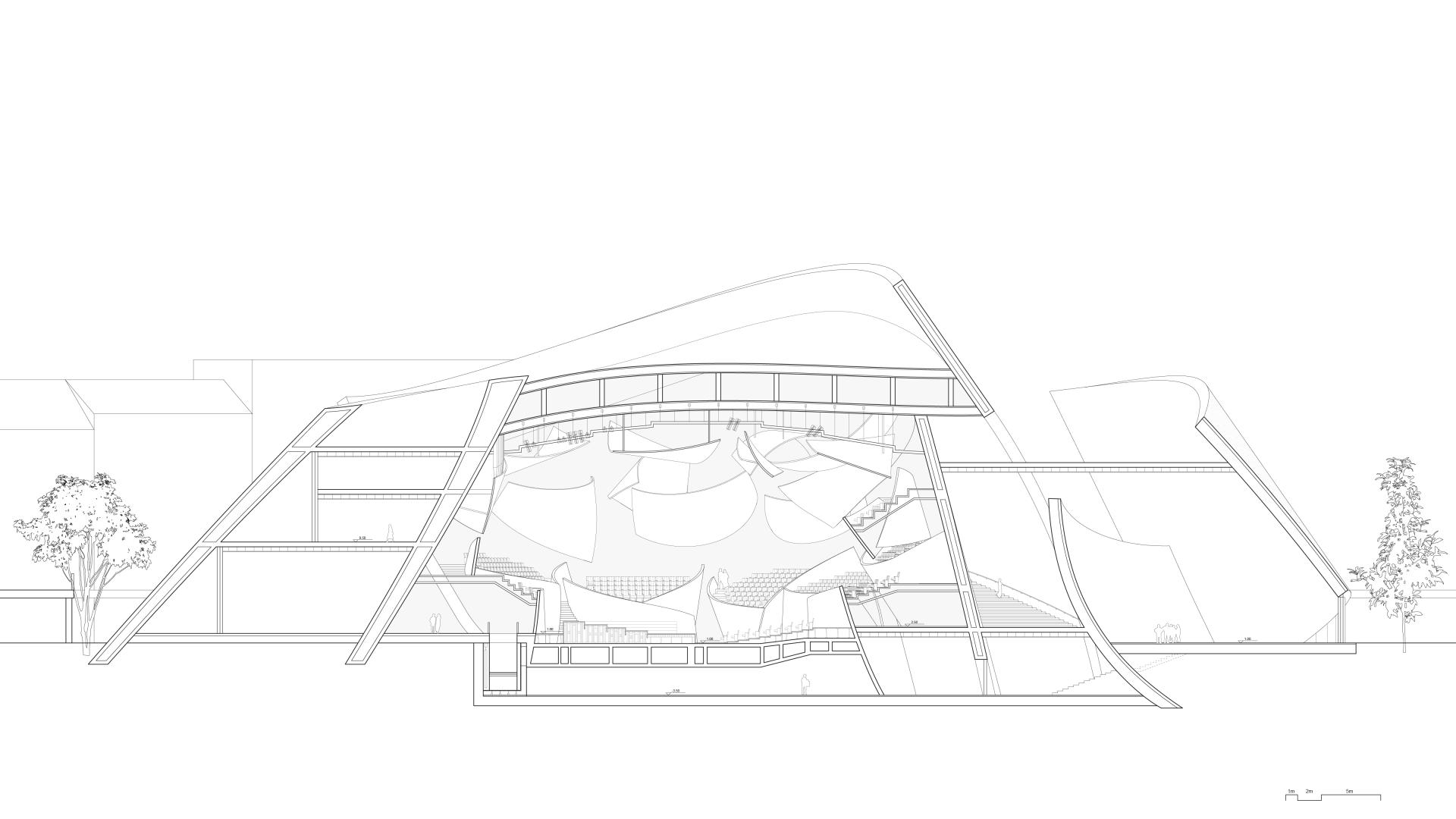Architectural tectonics and technology are the project’s most significant challenges. The cantilevered curved walls, a defining feature of the design, were achieved through an innovative combination of steel and cross-laminated timber (CLT). This meticulous integration not only provides structural stability but also imbues the space with warmth and resonance, enhancing the sensory connection between the audience and the performance.