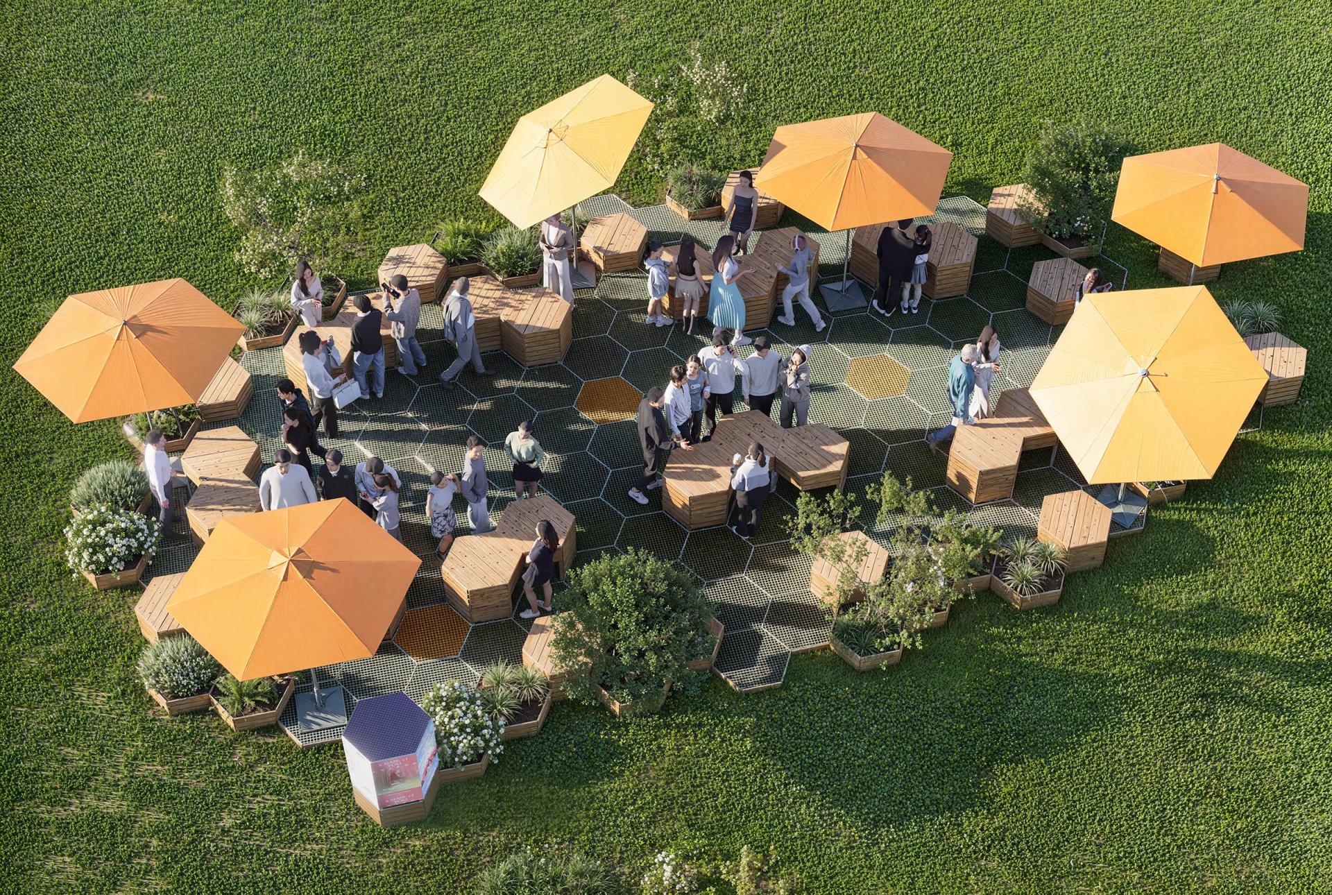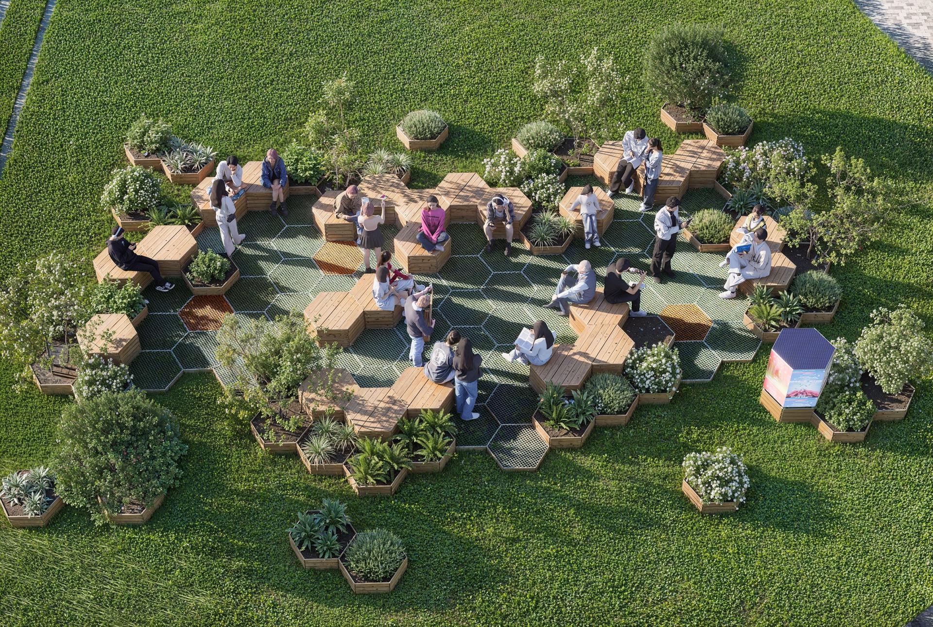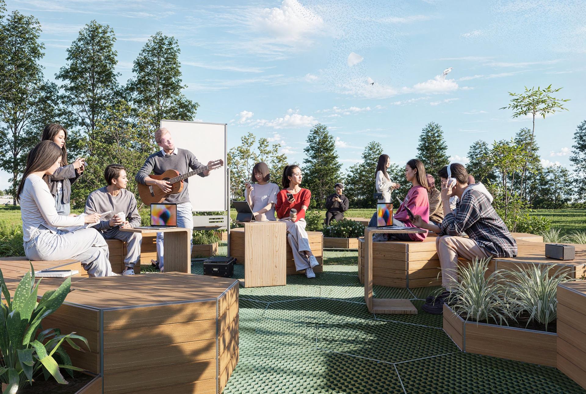 The design inspiration for MGI is drawn from the concept of floating green islands found in nature—oases that seamlessly integrate into their surroundings while standing independently. These modular combinations create interconnected green spaces, allowing individuals to experience the beauty of nature amidst the hustle and bustle of urban life. Furthermore, MGI incorporates the unique allure of hexagonal shapes, which are prevalent in nature, such as in honeycombs, turtle shells, and snowflakes. This geometric form not only enhances the product's stability and structural aesthetics but also symbolizes the harmonious coexistence between humans and nature. This design philosophy emphasizes not only functionality but also the integration of landscape products with their natural environment, reflecting a commitment to ecological balance and sustainable development. In selecting materials, MGI adheres to principles of environmental sustainability, durability, and aesthetic appeal, aiming to provide high-performance landscape solutions. The primary structural material used in MGI is galvanized steel, which offers exceptional corrosion resistance and strength, effectively withstanding harsh weather conditions. This ensures the long-term stability of MGI in various environments. Additionally, galvanized steel presents a more economical option compared to stainless steel, enhancing MGI's competitiveness in the market. To emphasize natural beauty, MGI also incorporates bamboo and wood materials, imbuing the product with a warm, organic feel. The natural textures and colors of bamboo and wood not only enhance the visual appeal but also provide excellent breathability and moisture absorption, helping to regulate surface temperature and improve user comfort. This choice of materials reflects MGI's respect for natural elements and fosters a closer connection between the product and everyday life. Moreover, MGI utilizes fiberglass-reinforced plastic, a lightweight and high-strength material known for its corrosion resistance and durability. This material is employed in key functional components, such as the tread and base, further enhancing the product's longevity and ease of maintenance. The use of wood-grain aluminum as a decorative surface not only adds a modern and stylish touch to MGI but also ensures excellent weather resistance and corrosion protection, providing dual advantages in both appearance and functionality.