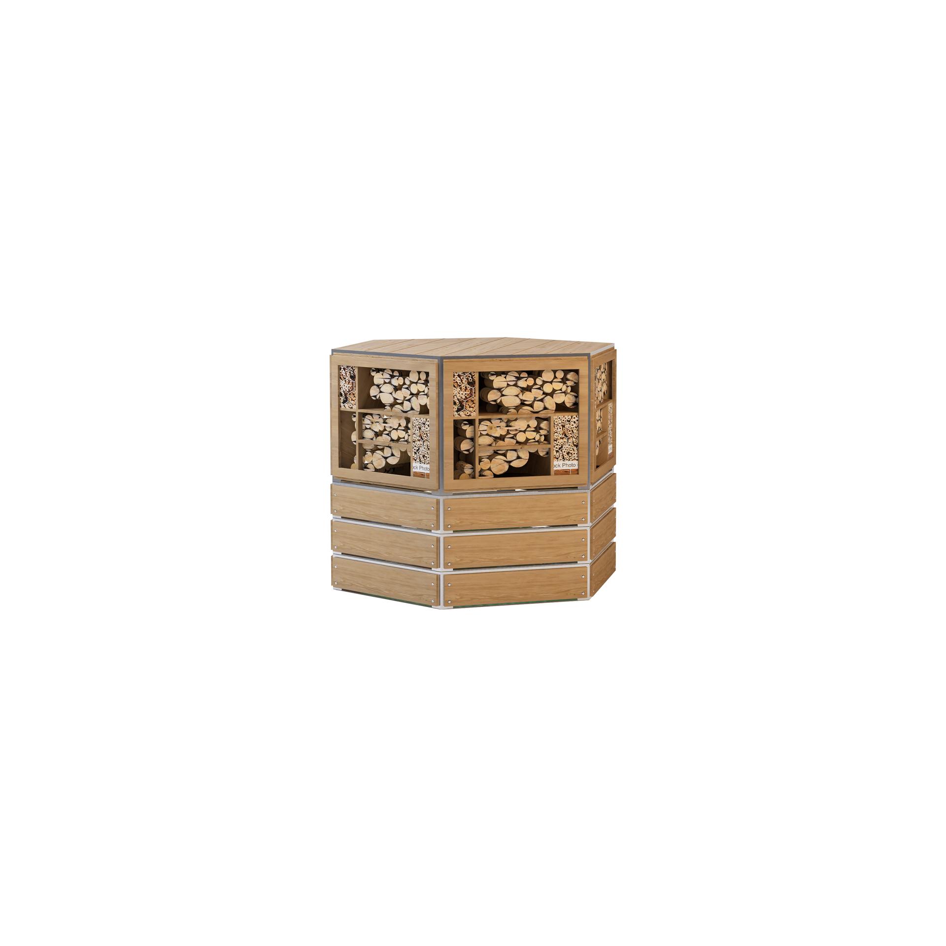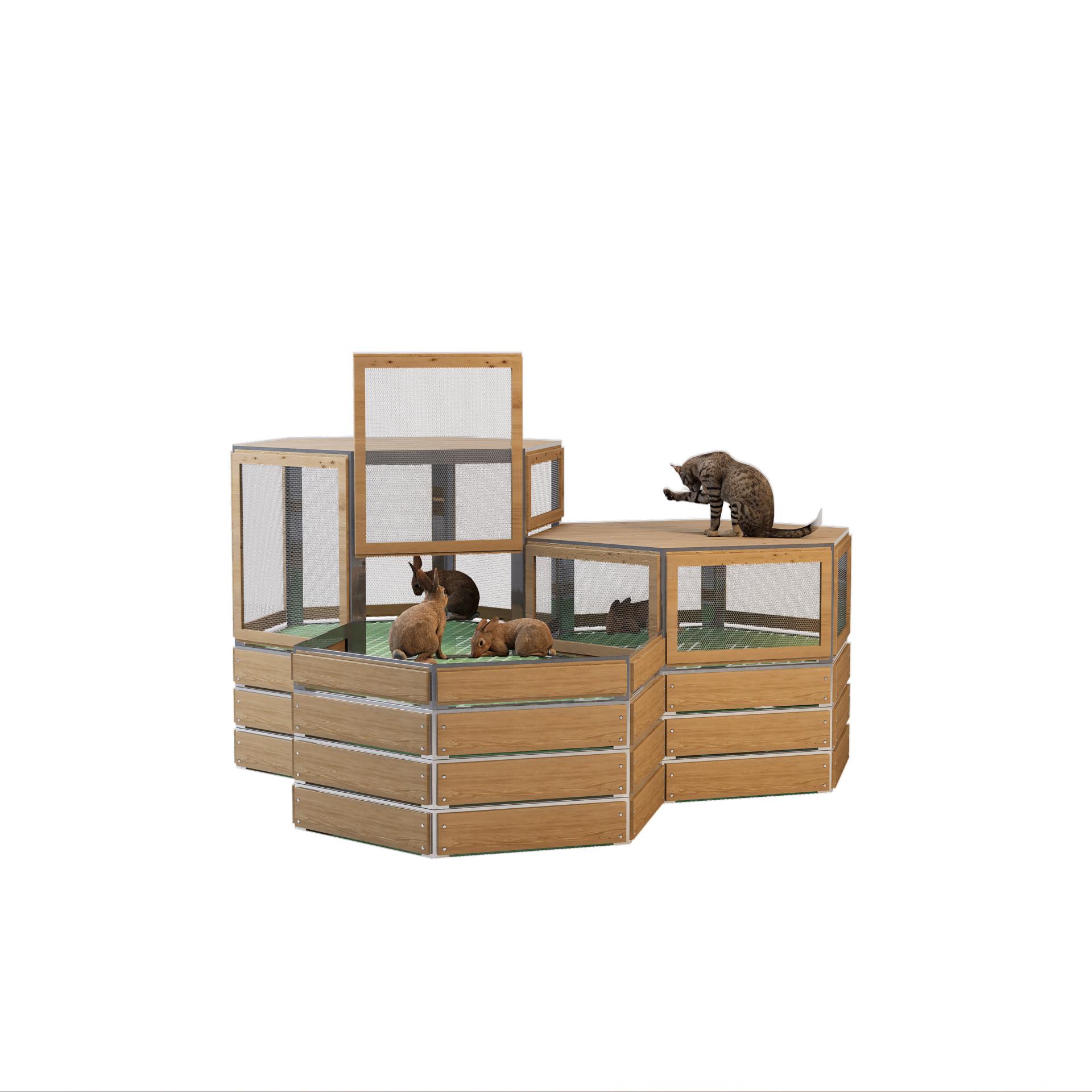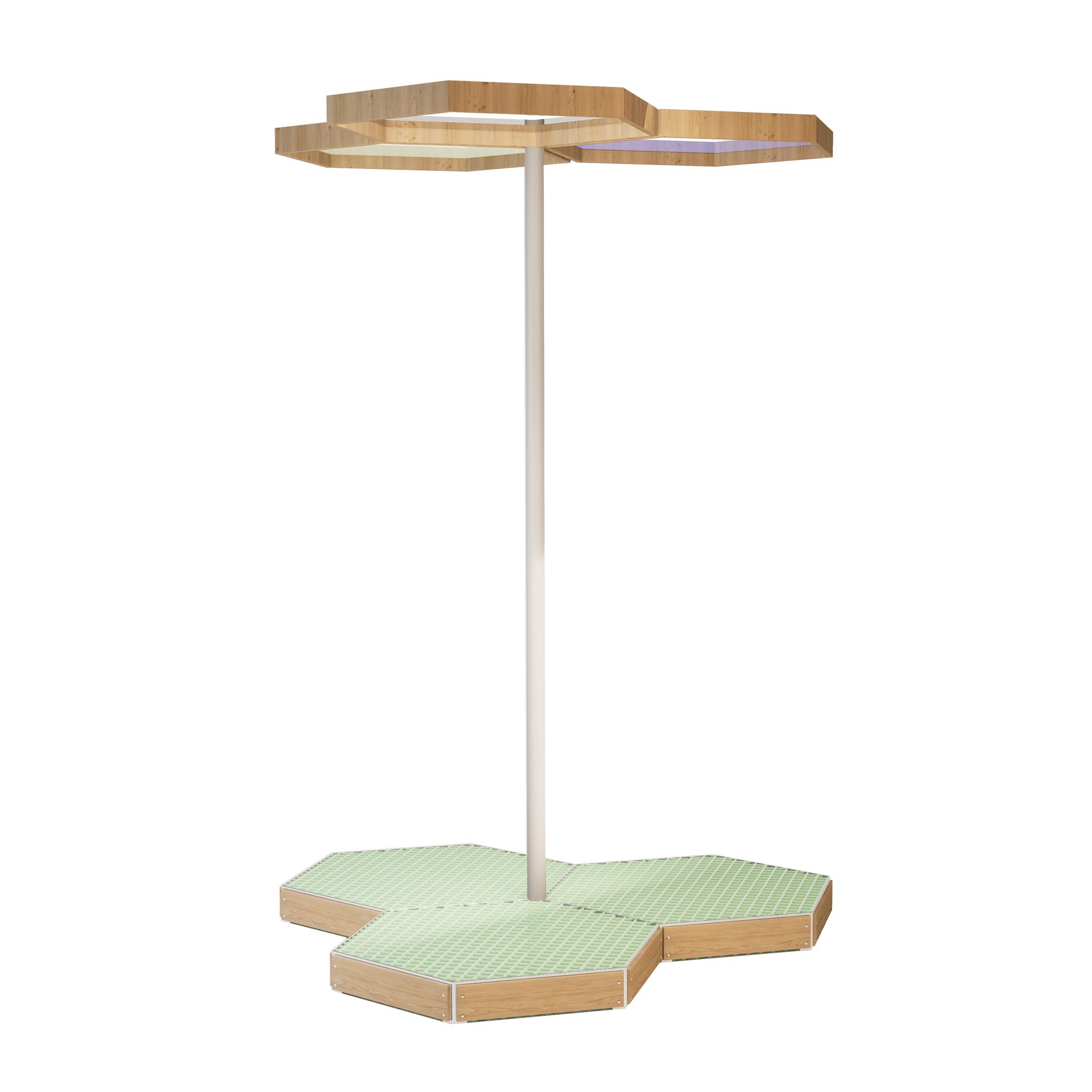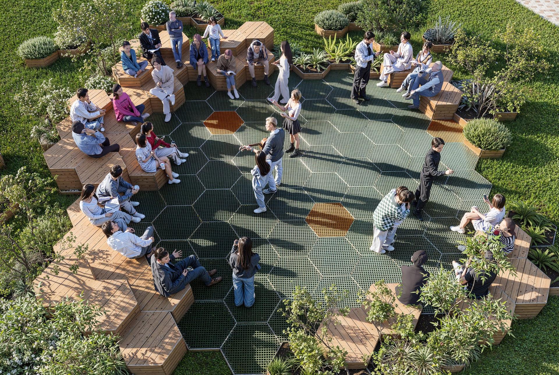 The design inspiration for MGI is drawn from the concept of floating green islands found in nature—oases that seamlessly integrate into their surroundings while standing independently. These modular combinations create interconnected green spaces, allowing individuals to experience the beauty of nature amidst the hustle and bustle of urban life. Furthermore, MGI incorporates the unique allure of hexagonal shapes, which are prevalent in nature, such as in honeycombs, turtle shells, and snowflakes. This geometric form not only enhances the product's stability and structural aesthetics but also symbolizes the harmonious coexistence between humans and nature. This design philosophy emphasizes not only functionality but also the integration of landscape products with their natural environment, reflecting a commitment to ecological balance and sustainable development. In selecting materials, MGI adheres to principles of environmental sustainability, durability, and aesthetic appeal, aiming to provide high-performance landscape solutions. The primary structural material used in MGI is galvanized steel, which offers exceptional corrosion resistance and strength, effectively withstanding harsh weather conditions. This ensures the long-term stability of MGI in various environments. Additionally, galvanized steel presents a more economical option compared to stainless steel, enhancing MGI's competitiveness in the market. To emphasize natural beauty, MGI also incorporates bamboo and wood materials, imbuing the product with a warm, organic feel. The natural textures and colors of bamboo and wood not only enhance the visual appeal but also provide excellent breathability and moisture absorption, helping to regulate surface temperature and improve user comfort. This choice of materials reflects MGI's respect for natural elements and fosters a closer connection between the product and everyday life. Moreover, MGI utilizes fiberglass-reinforced plastic, a lightweight and high-strength material known for its corrosion resistance and durability. This material is employed in key functional components, such as the tread and base, further enhancing the product's longevity and ease of maintenance. The use of wood-grain aluminum as a decorative surface not only adds a modern and stylish touch to MGI but also ensures excellent weather resistance and corrosion protection, providing dual advantages in both appearance and functionality.