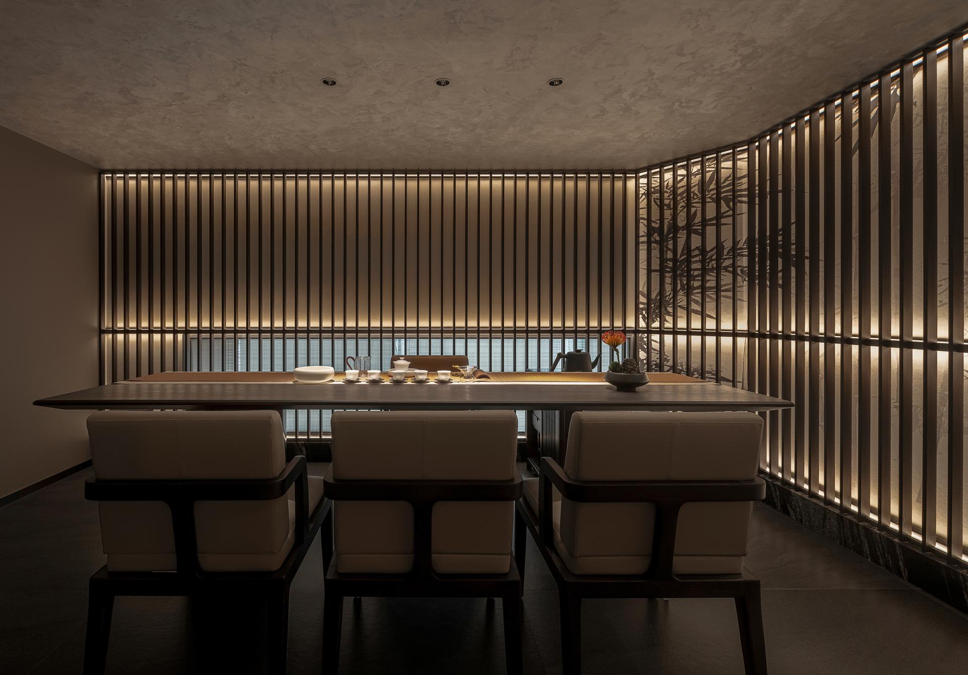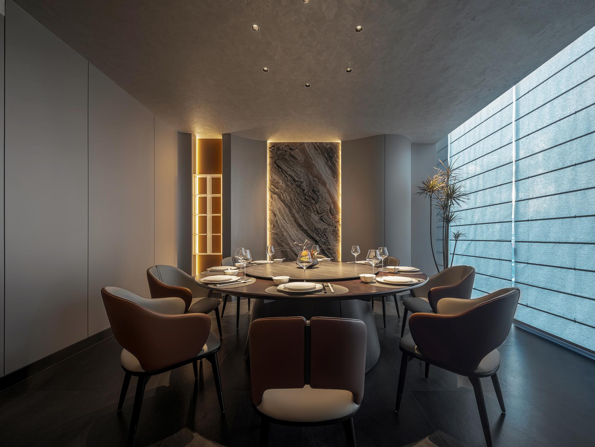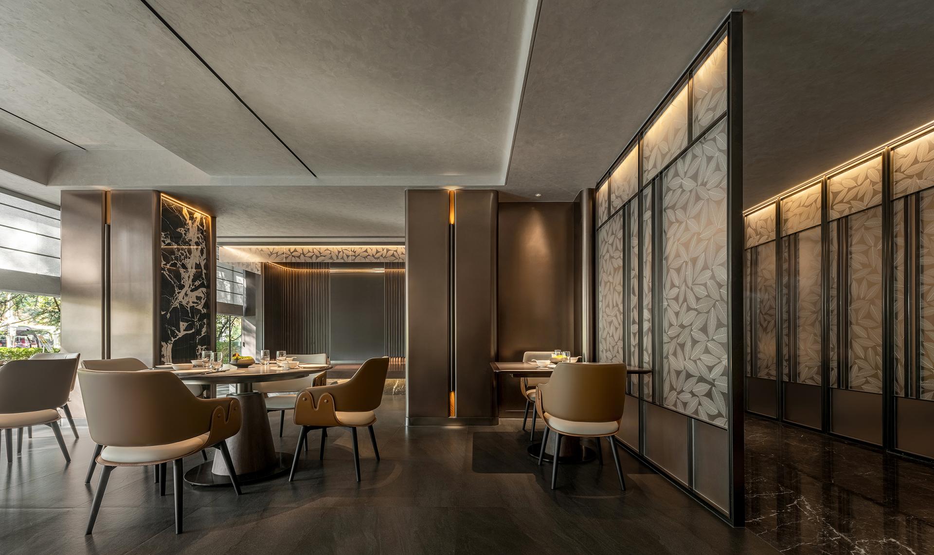 The Tea Road spans mountains and oceans. The rich and varied culinary cultures of the cities along the way provide plentiful materials for the innovation of the restaurant's dishes and ingredients. The restaurant emphasizes harmony. Tea is made part of the cuisine. Here, tea and food integrate. Based on Hunan and Cantonese cuisines, by combining the culinary styles and ingredients of the cities along the Tea Road, the restaurant aims to become a top-grade, integrated, creative restaurant brand for tea art, human landscapes, banquets, and business. Inspired by the culture of the Tea Road, based on the brand orientation, with the theme of “The Tea Road, The Natural Experience” and the core conception of “Oriental Upscale Nature,” this design pursues a natural charm of the combination of high-end Oriental culture and modern space to create a premium, elegant, innovative dining environment with a Zen charm, connotation, and elements of diverse cultures. Here, the customers can feel the essence of Oriental cultures. It'll be a refined aesthetic experience of modern cultural significance. The inspiration comes from the lines and structure of tea leaves. Veins and patterns of tea leaves are used for the decoration of internal walls and styling partitions, giving a relaxing feeling from the nature, vividly displaying the beauty of a tea leaf's whole life. By bringing together natural and modern elements, the design creates a serene, graceful, and fashionable visual ambiance. The private rooms are named after spots along the Tea Road with significance. The customers are expected to enjoy the harmony between modern society and traditions and between nature and humanity in this unique space. In the center of the restaurant, a small performance area is specially set up with soft classic Chinese music, for example, an ensemble of the guzheng and bamboo flute, as the background music. While dining, customers can appreciate the charm of Oriental culture through audio. It's also a feast for the eyes. The all-round experience makes the place serene and sentimental.
