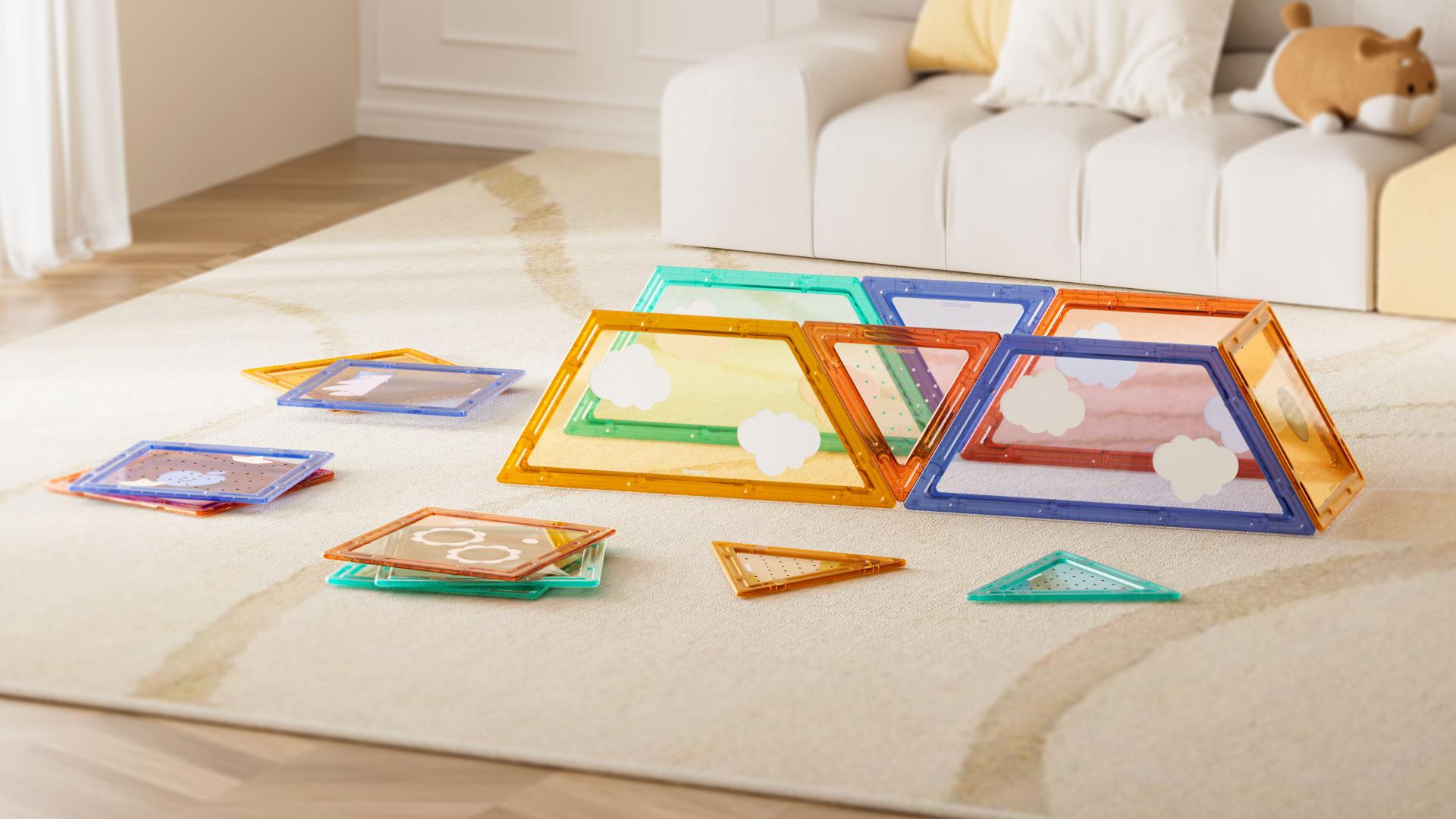 This product is an innovative educational toy, featuring reinforced magnetic tiles specifically designed for children's intellectual development and parent-child interaction. With its unique modular combination design, it supports a variety of shapes and construction methods, stimulating children's creativity and imagination. The rounded edges and translucent material of the product not only ensure safe use but also enhance its overall aesthetic appeal, adding fun and visual interest to the building process. This design choice combines safety with style, making the assembly experience both enjoyable and visually engaging.