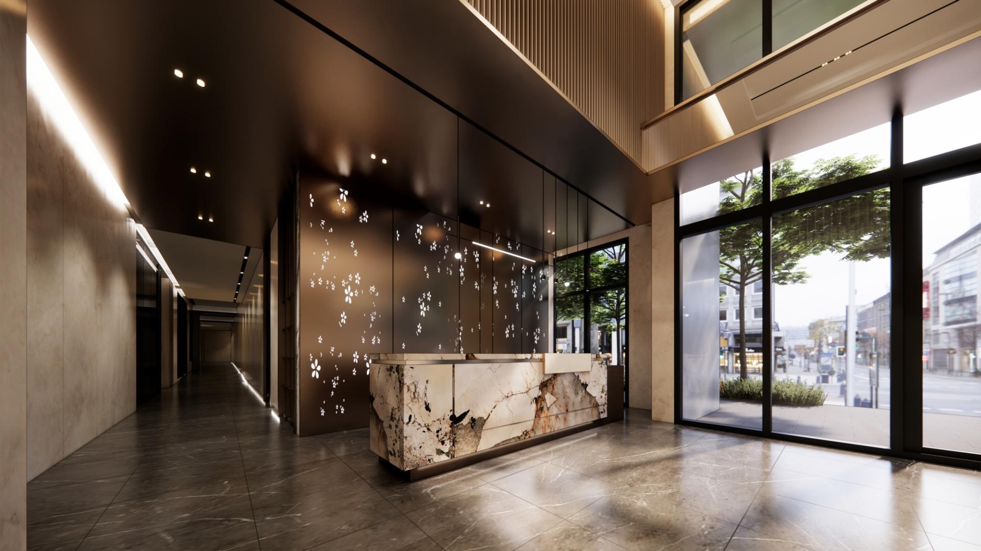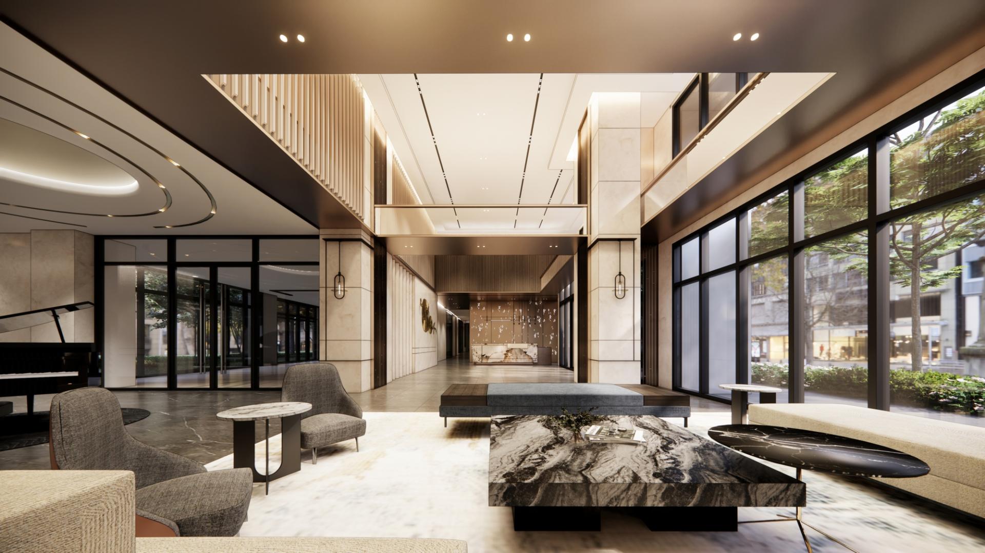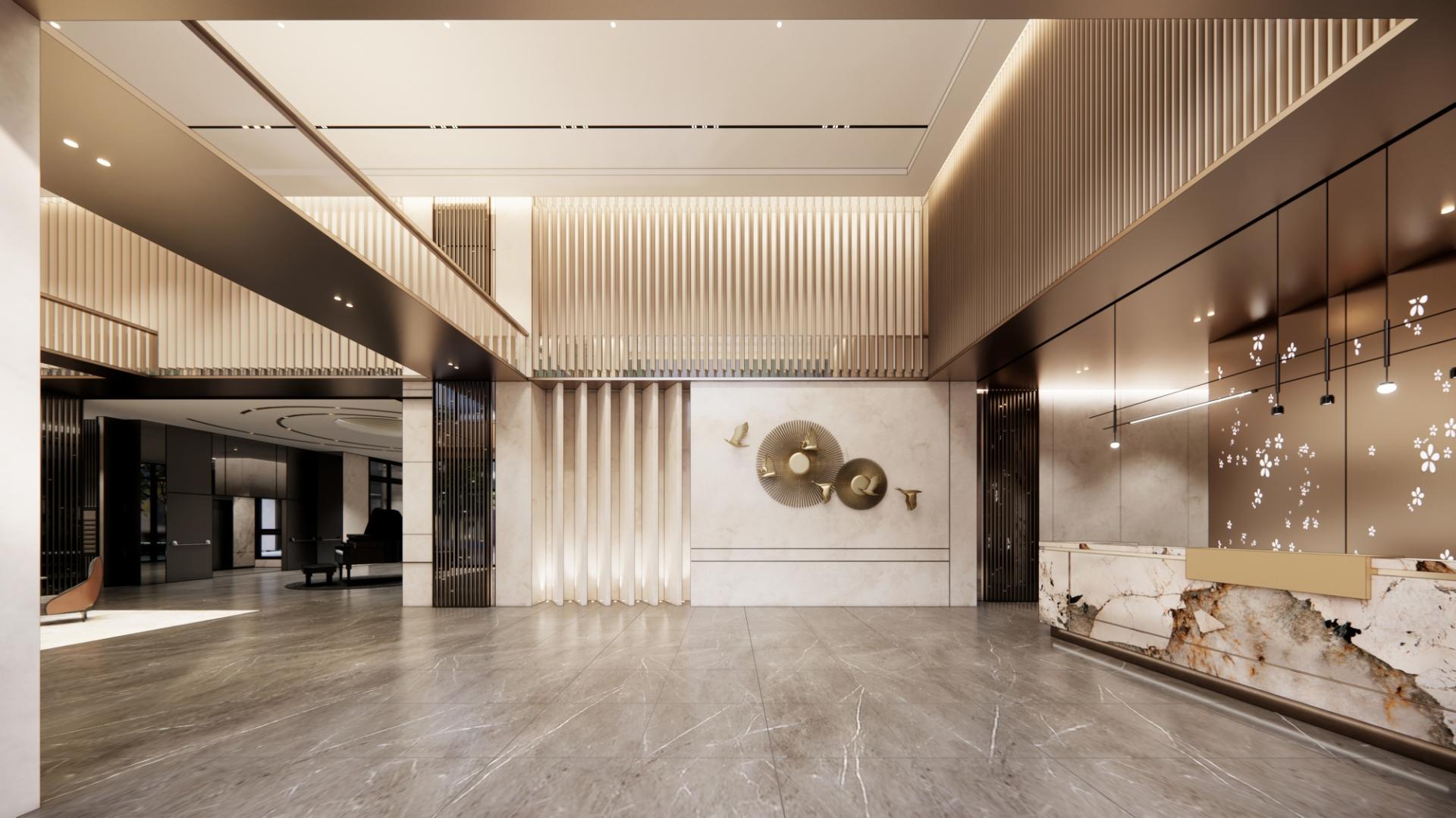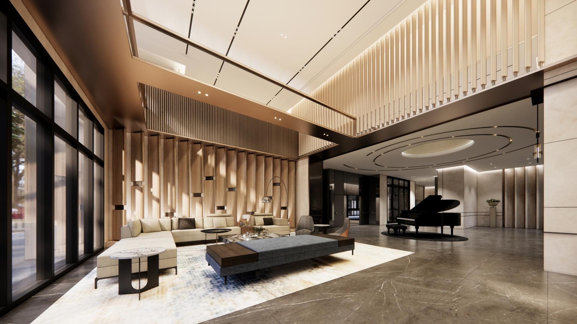 Upholding core principles of modern contemporary interior design, this space seamlessly blends contemporary luxury by thoughtfully integrating materials such as stone, wood, stainless steel, and titanium metal in a harmonious composition. These elements work together to create a sophisticated, balanced environment that embodies the essence of modern style. The high ceiling gives the lobby a sense of regal grandeur, while the earthy color palette fosters a serene and calming atmosphere. The interior design, enhanced by the interplay of light and shadow, adds warmth and creates an inviting atmosphere. Through immersive design techniques, it delicately allows the thoughts to settle down, inviting residents into a realm of pure relaxation and tranquility.