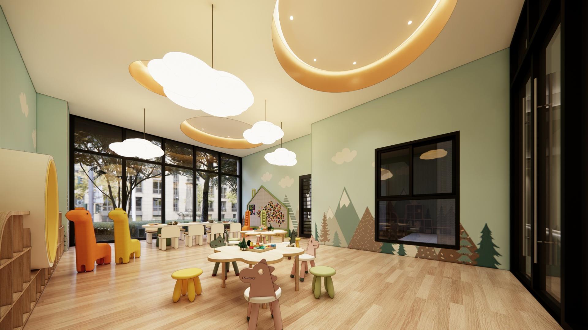 Bursting with lively hues and cheerful tones, the room is designed to inspire exploration and joyful play. Furthermore, soft cloud-shaped lamps and vibrant wall murals create a playful atmosphere. Wood flooring paired with warm tones can add a cozy touch, while non-toxic materials ensure a healthy environment.