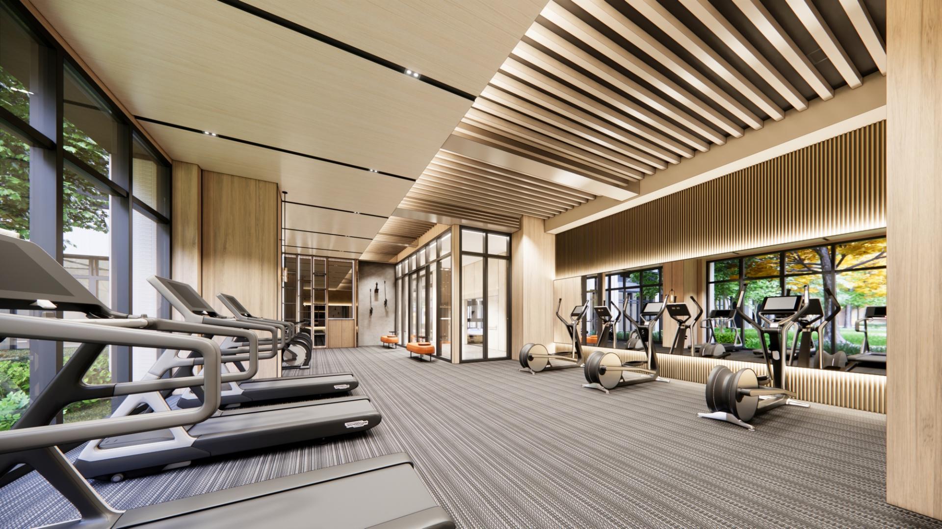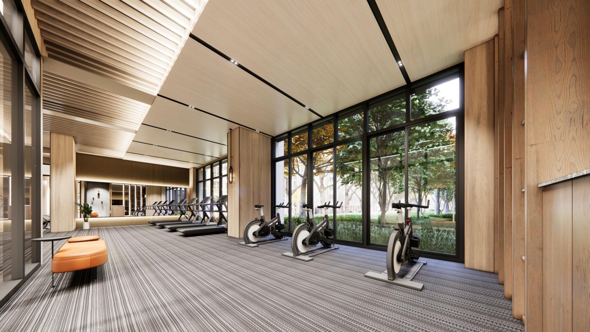 Large floor-to-ceiling windows bring in natural light, allowing residents to enjoy the outdoor greenery while exercising. By reflecting light and extending visual depth, mirrors make the spaces feel larger and brighter. The design embraces the warmth of earthy tones, with natural wood veneers fostering a seamless connection to the outdoor environment, creating a comfortable ambiance that harmoniously blends architectural design with its natural surroundings.