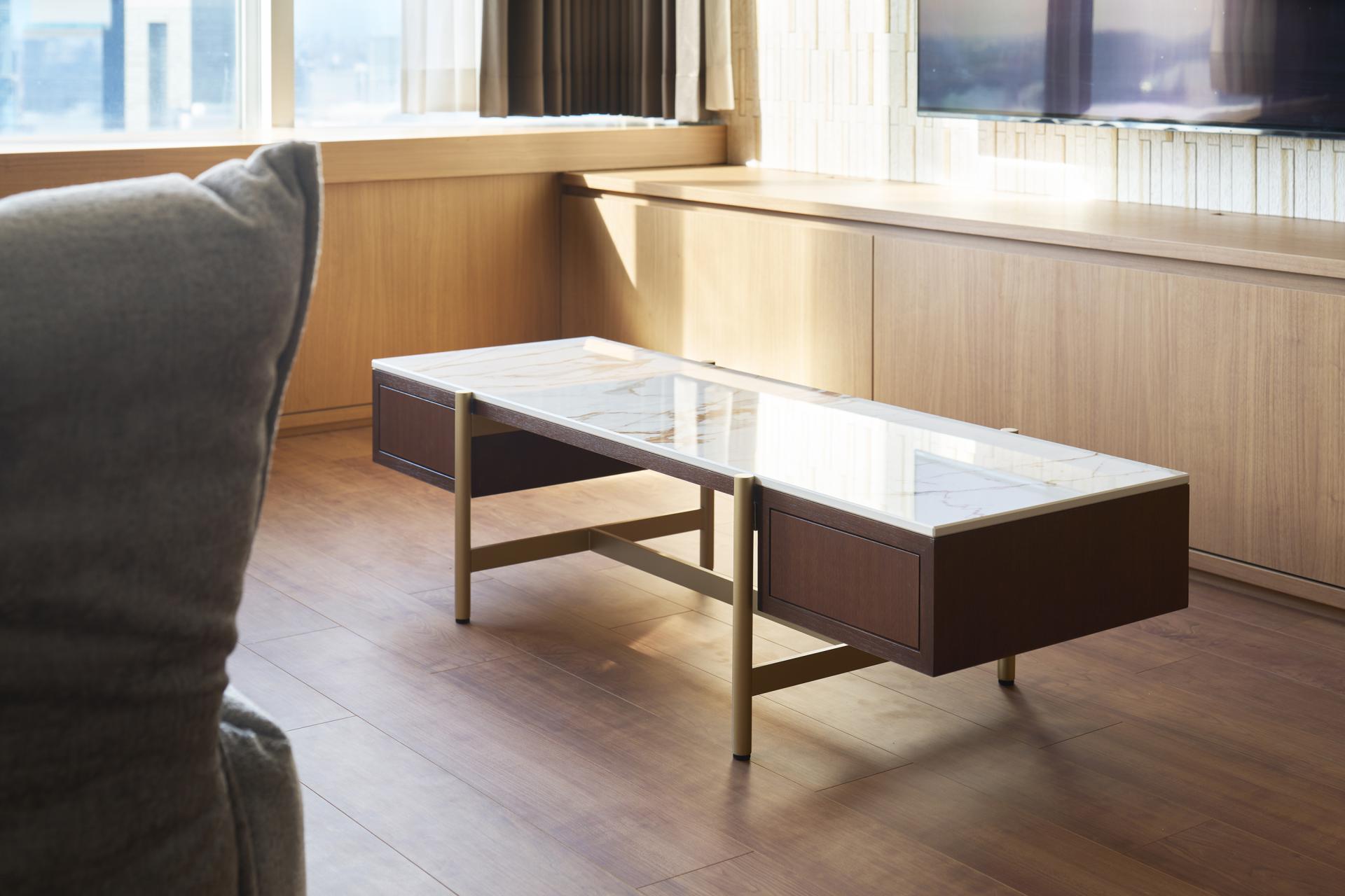 For these two spaces to coexist, we considered that the color of the materials is particularly important, as colors that are too light can be refreshing but lack luxury, while materials that are too dark can lack freshness.