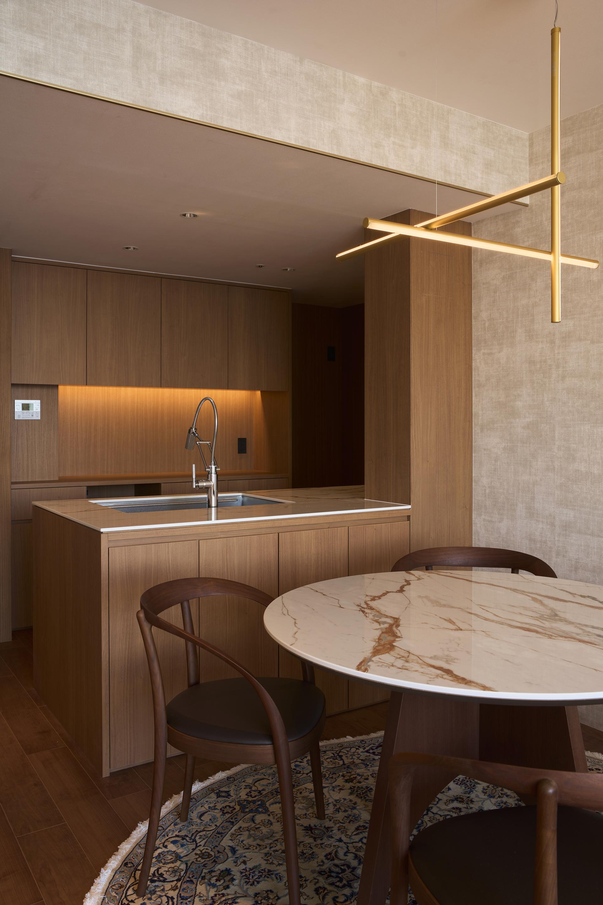 The kitchen, dining table and low table were designed specifically for this space, and these elements further enhance the sense of unity of the space.