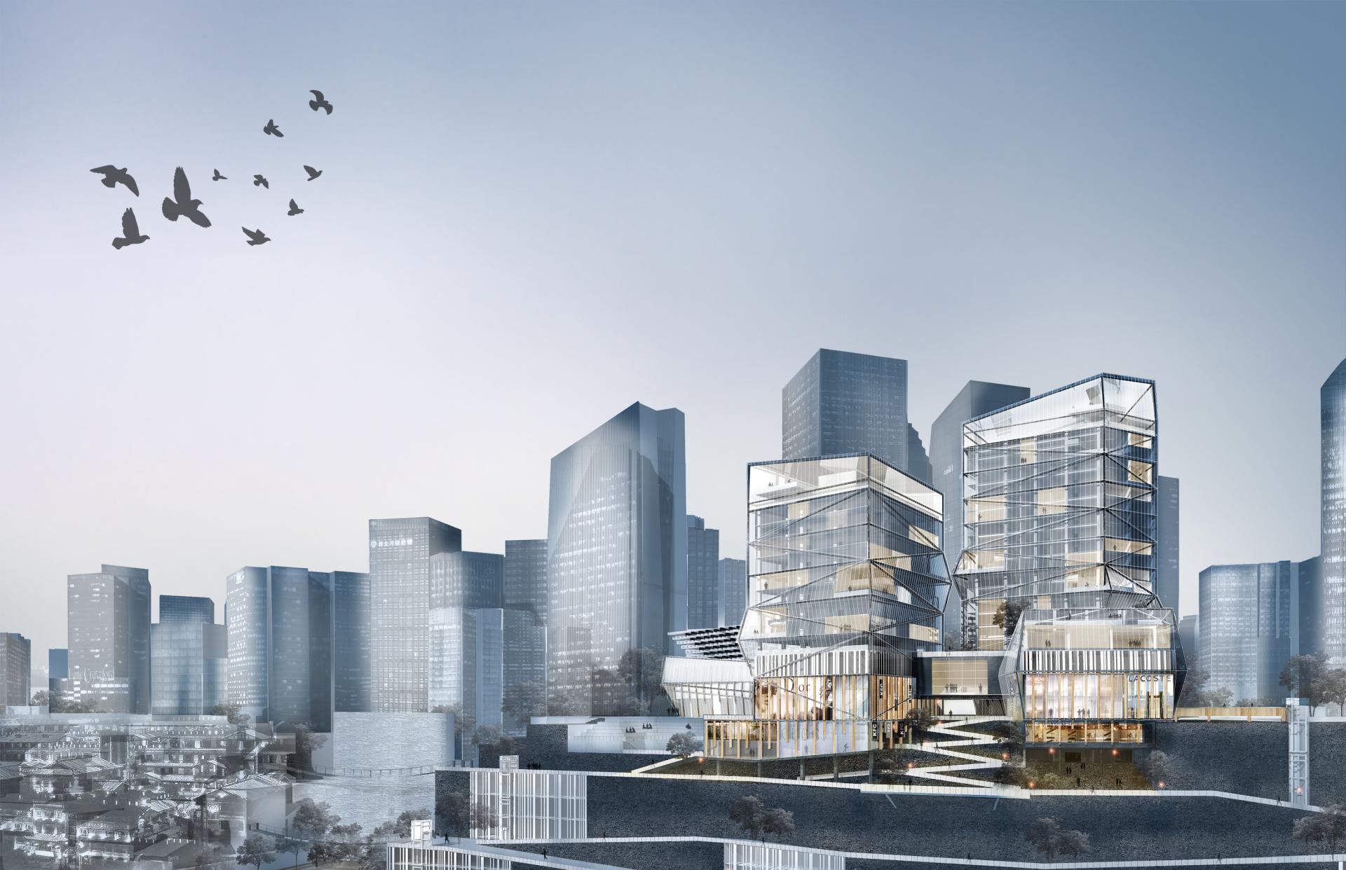 Perched on a dramatic cliff with over 50 meters of elevation difference, PRISM offers sweeping views of the city and river, blending effortlessly into the surrounding architecture to create a stunning urban landscape.