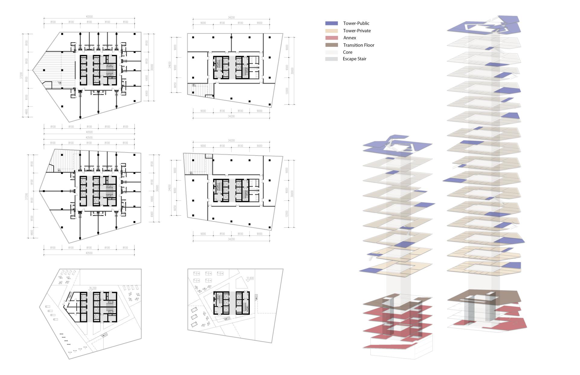 Podium: The lower levels house commercial spaces and a small exhibition hall, structured as four independent volumes linked by an underground atrium, sky corridors, and escalators.