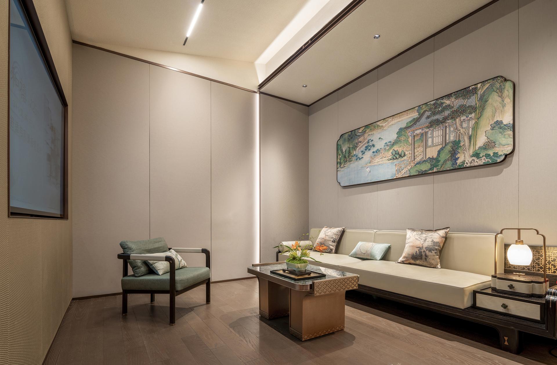 The audio-visual room is wrapped in a large piece of wallcovering with remarkable textures, focusing on the perfect combination of quality, comfort and ambience. We use the Suzhou Classical Gardens element in wall decorations, and the furniture selection also adopts combination of Chinese elements and metal elements, further spreading the rhythm of the Suzhou style, aiming to activate and awaken the familiar emotional resonance.
