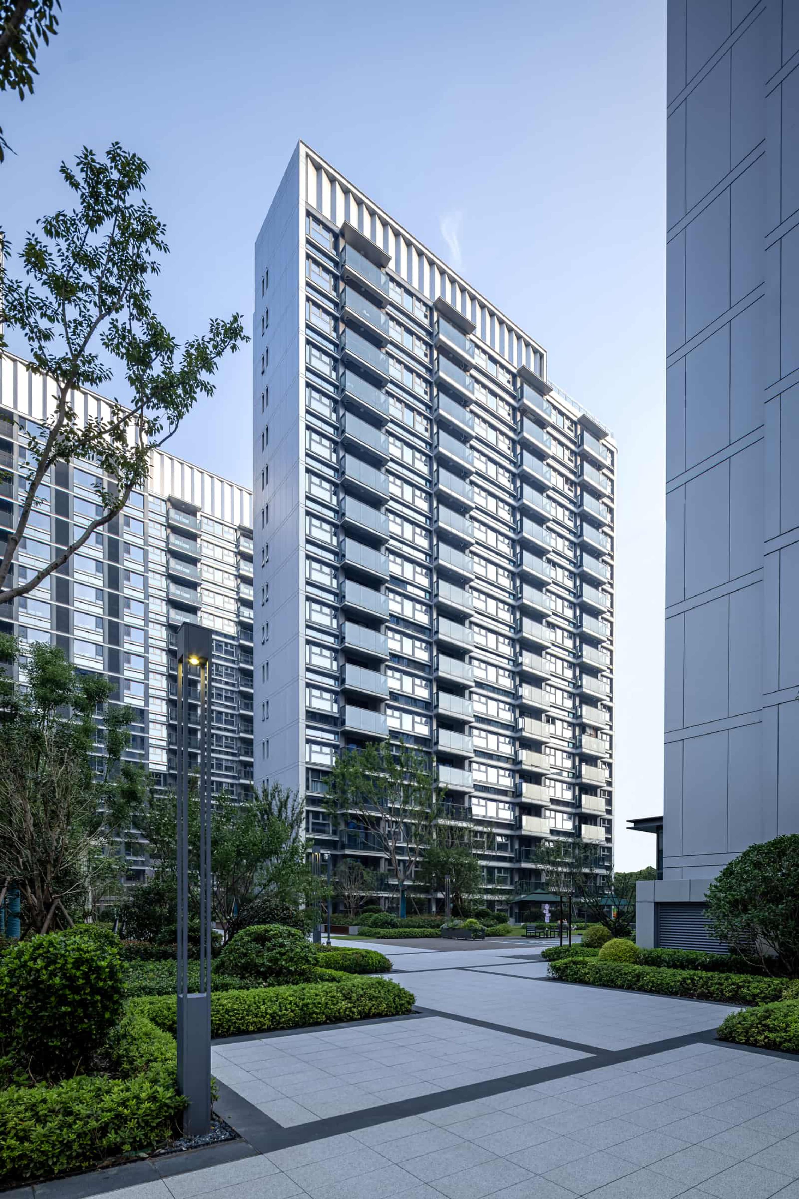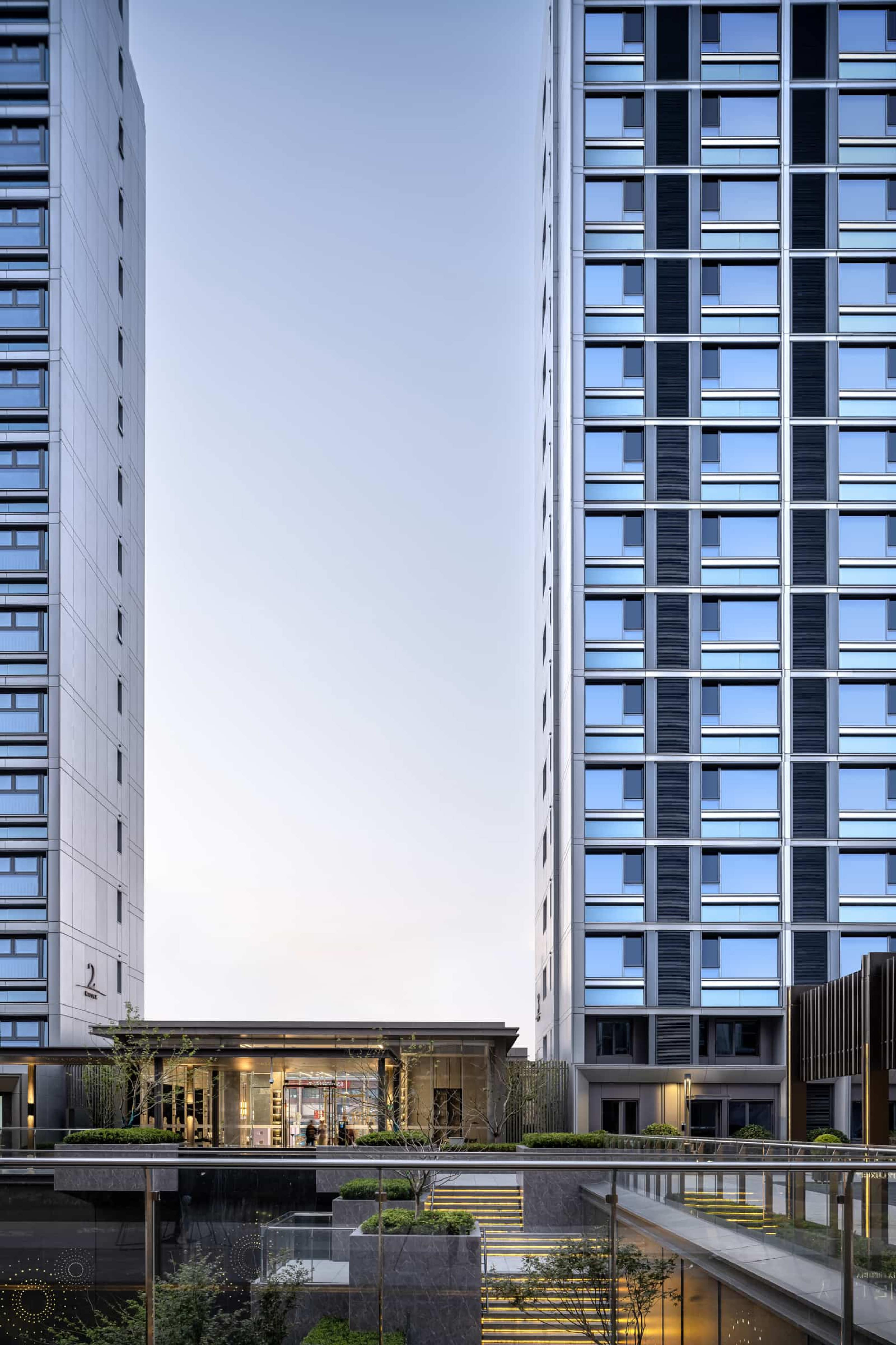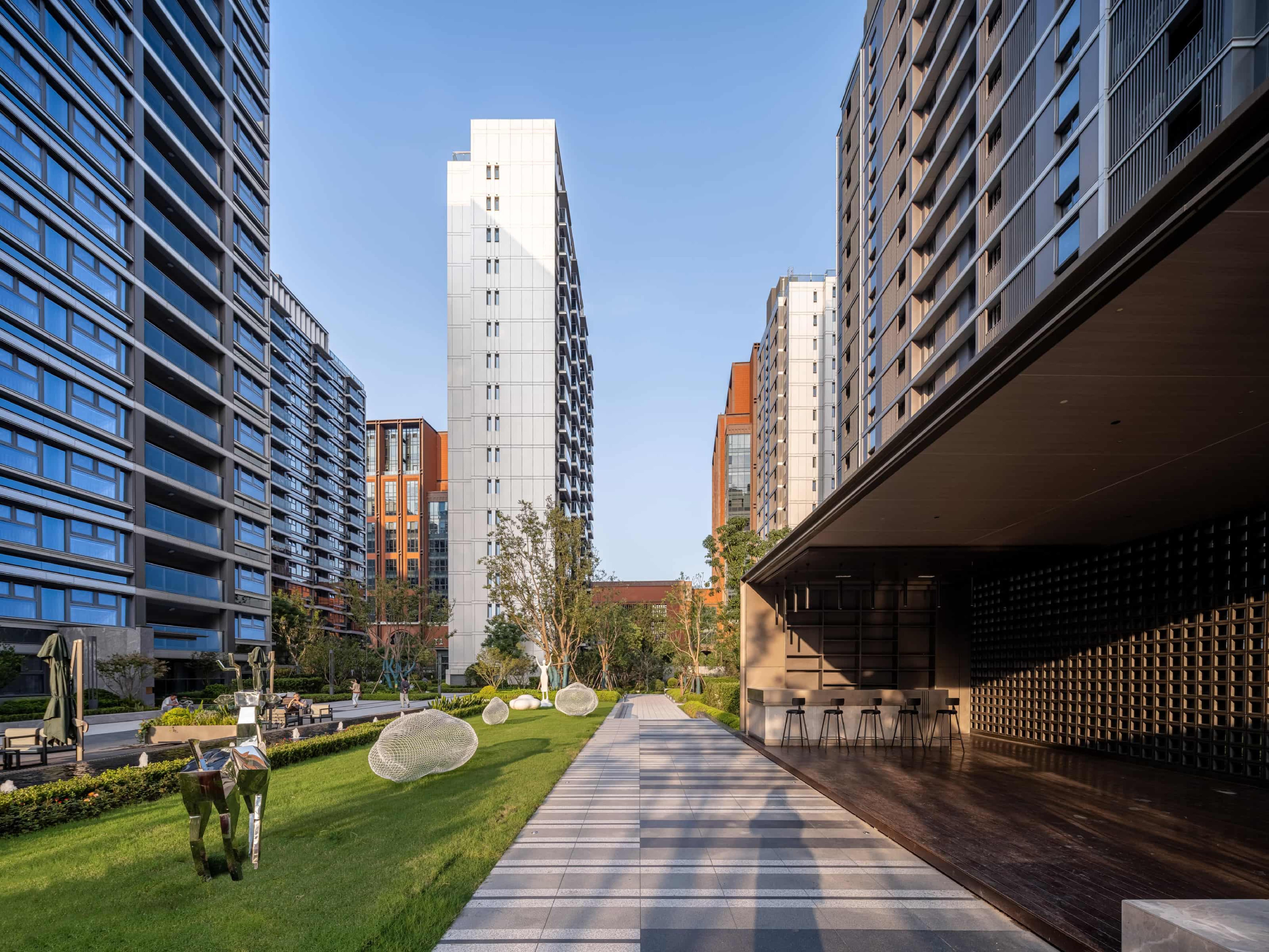 The main entrance of the community features a refined entrance canopy, a sunken courtyard, and an underground lobby, with these three spaces interconnected to enhance the sense of quality and ceremony. The landscape design, named as an "Urban Art Gallery," expresses different themes of order, freedom, and romance throughout the community. The extensive use of glass materials diminishes the heaviness of the building's structure, blurring the boundary between the architecture and nature.