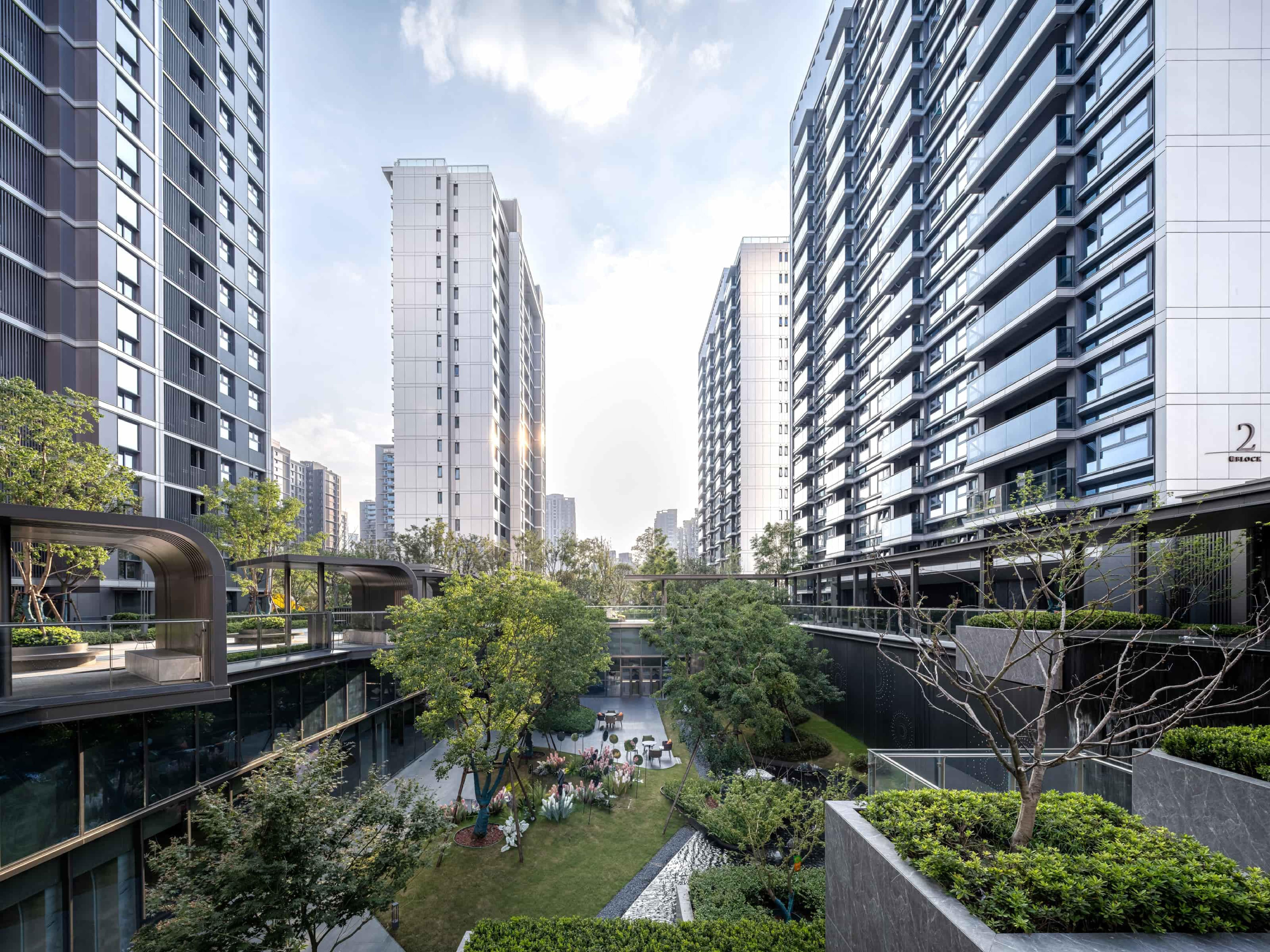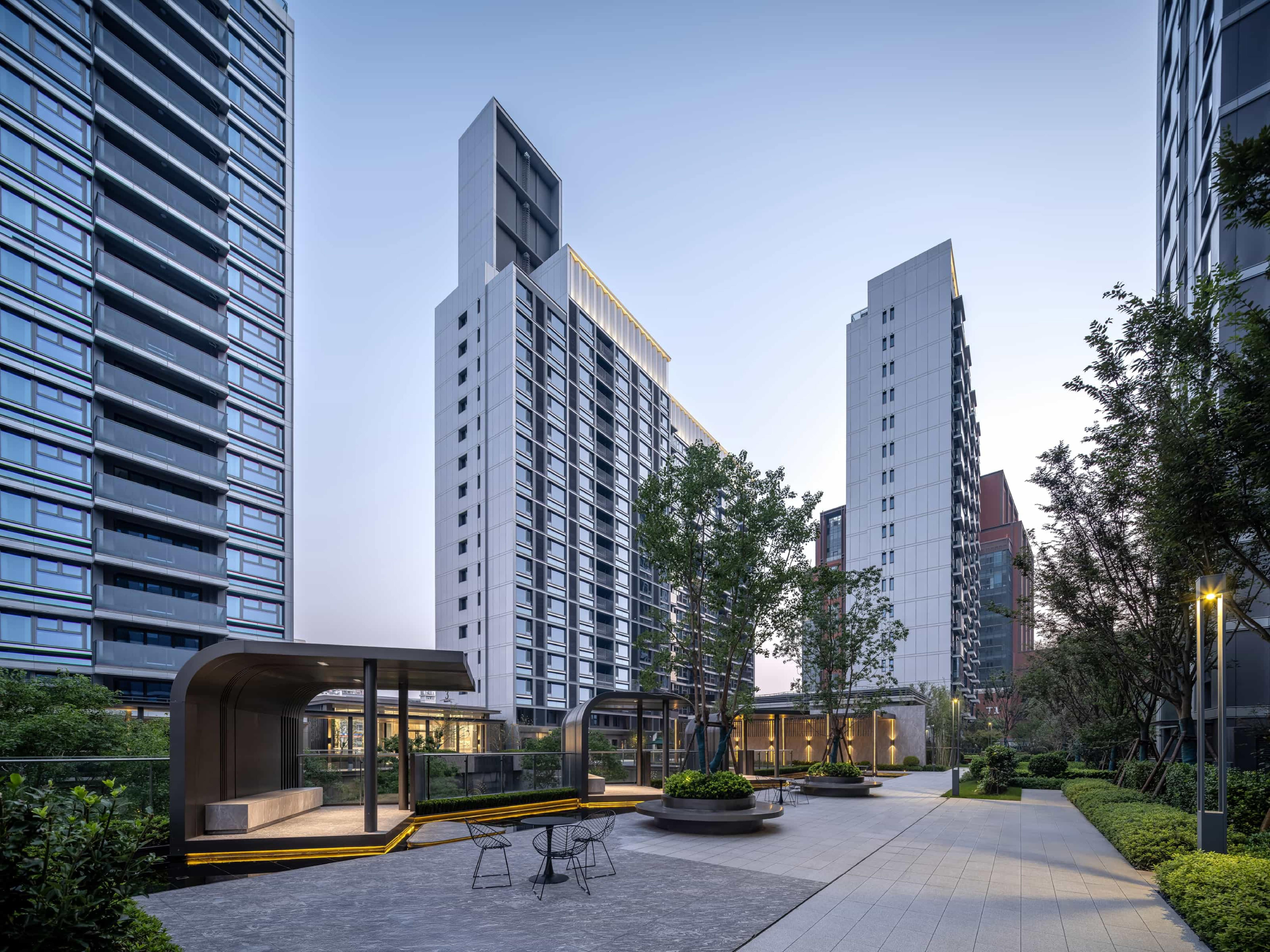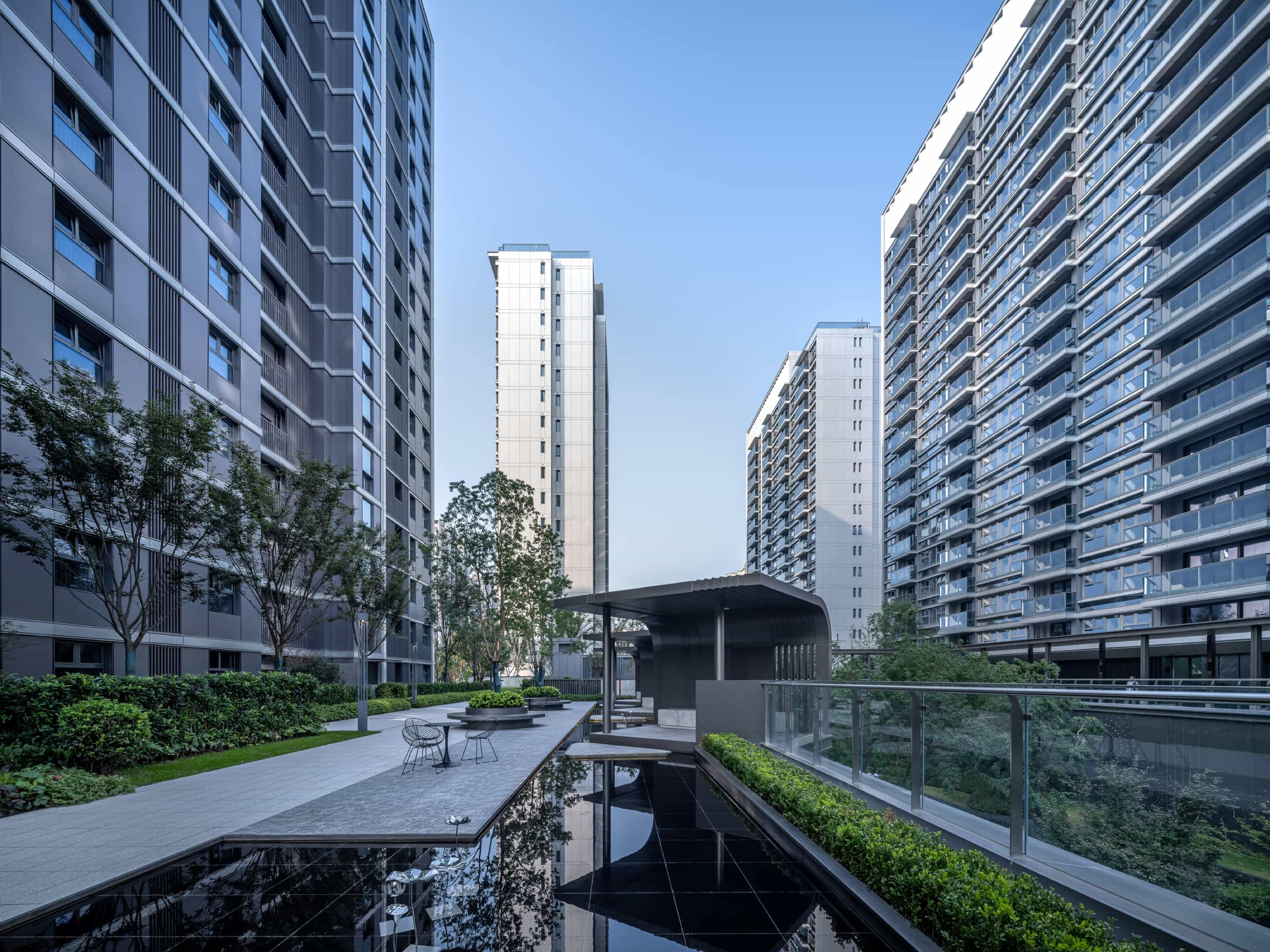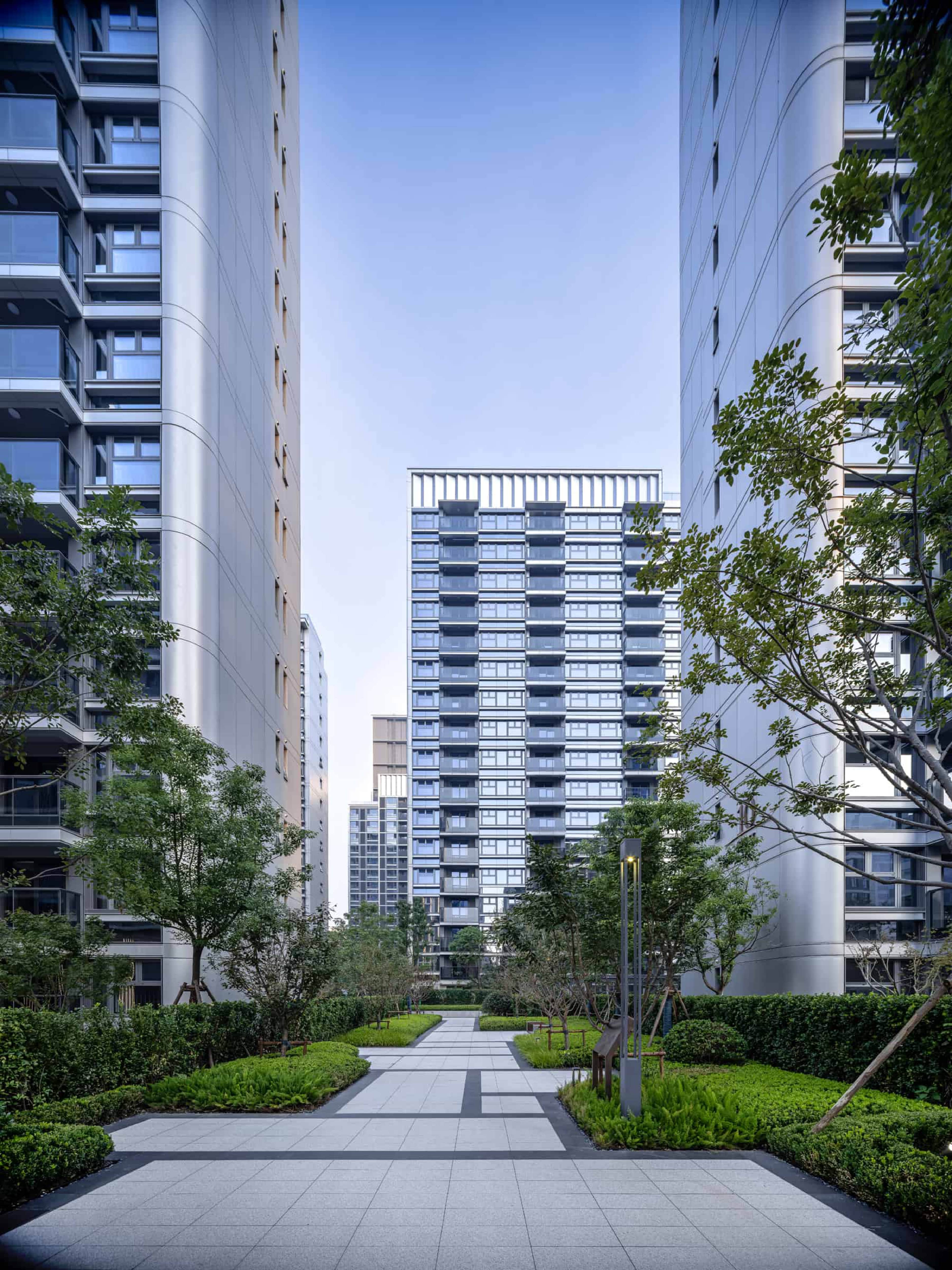 The main entrance of the community features a refined entrance canopy, a sunken courtyard, and an underground lobby, with these three spaces interconnected to enhance the sense of quality and ceremony. The landscape design, named as an "Urban Art Gallery," expresses different themes of order, freedom, and romance throughout the community. The extensive use of glass materials diminishes the heaviness of the building's structure, blurring the boundary between the architecture and nature.