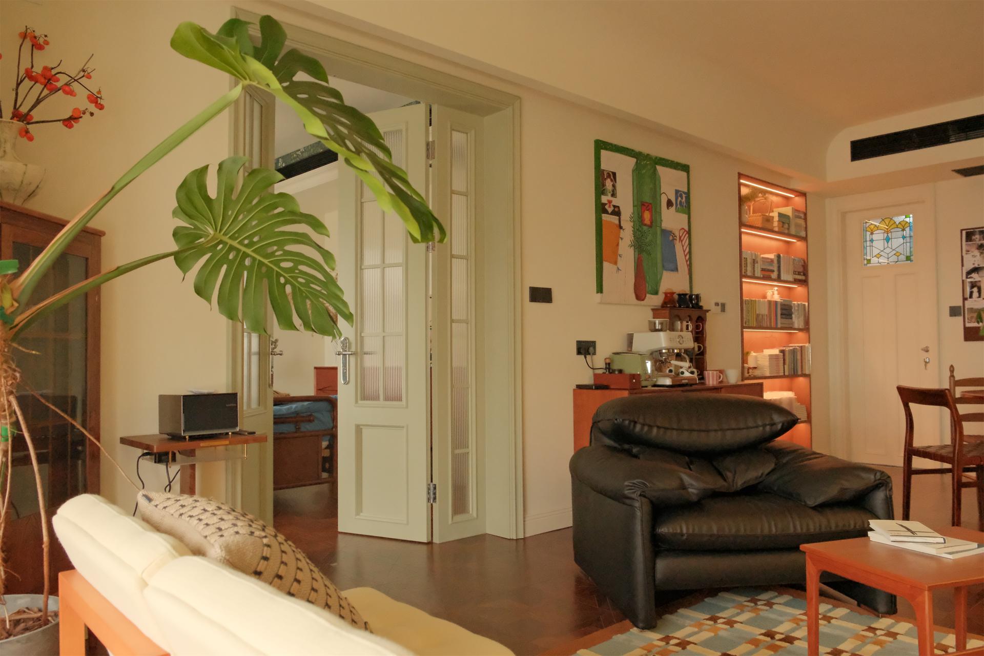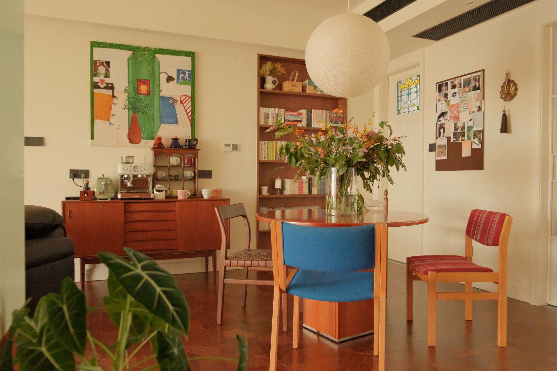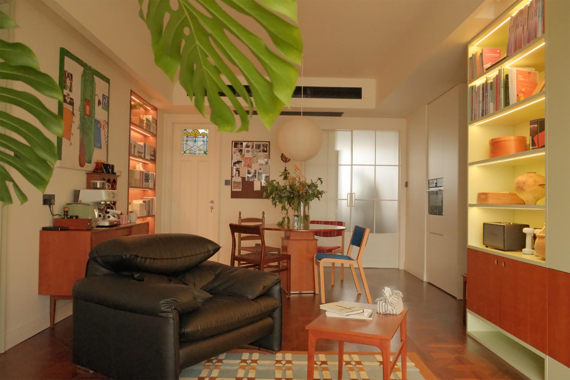 To alleviate people's stress in modern life, strategic placements of greenery, such as at desks and by windows, foster a more natural and vibrant ambiance. The design emphasizes spatial continuity with minimal partitions, and an open ceiling further reduces any feeling of oppression, infusing the space with stronger sense of relaxation. The study and furniture are crafted from warm-toned wood. The latex paint, artistic glass, quaint storage cabinets, vintage audio equipment, and decorative items collectively enhance the artistic atmosphere. Forest's Whisper Retreat incorporates paper lanterns, round tables, and the circular elements of arched chandeliers in the bedroom, introducing visual diversity while averting monotony. This helps establish a serene yet dynamic environment, providing an idyllic sanctuary for homeowners to find respite.
