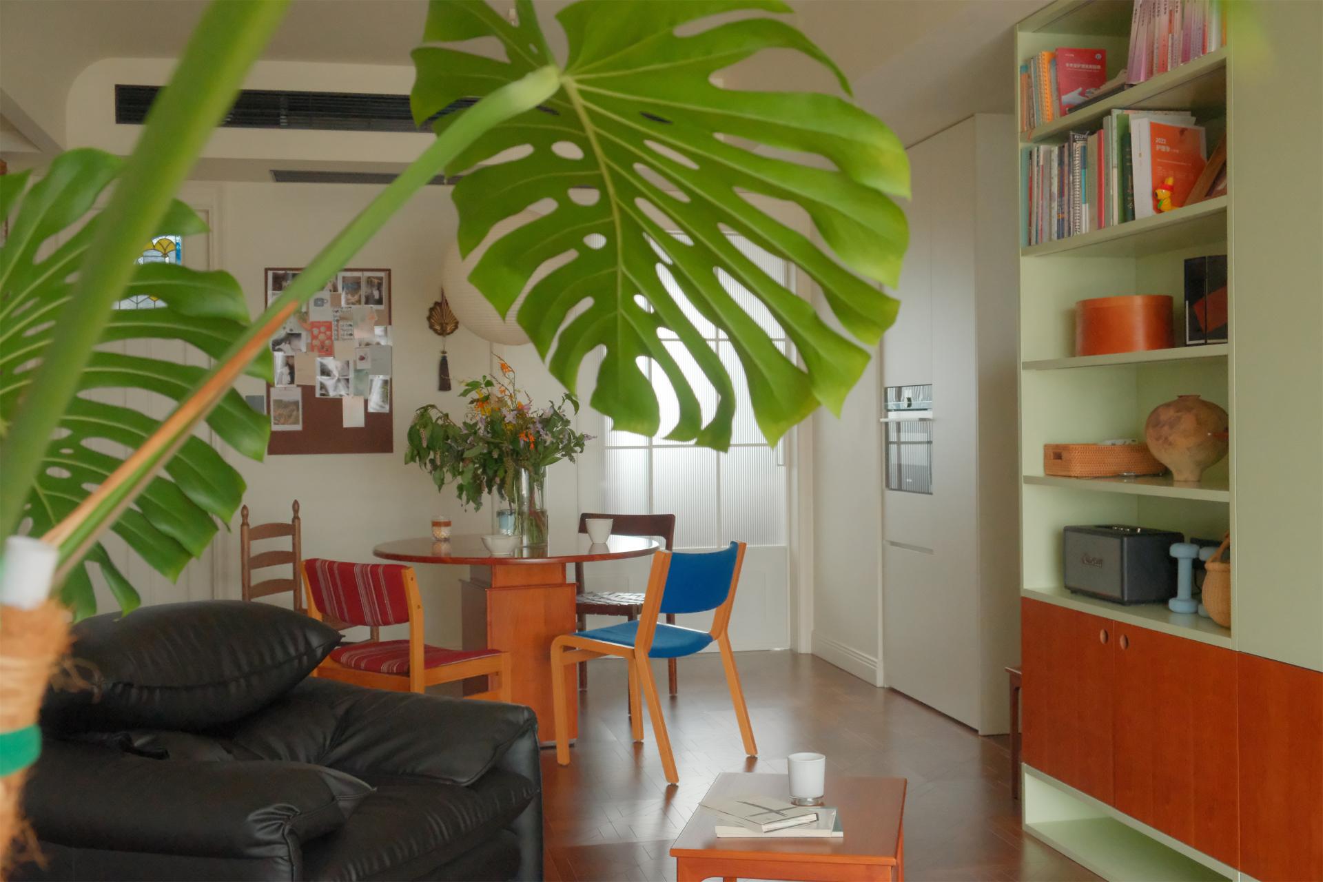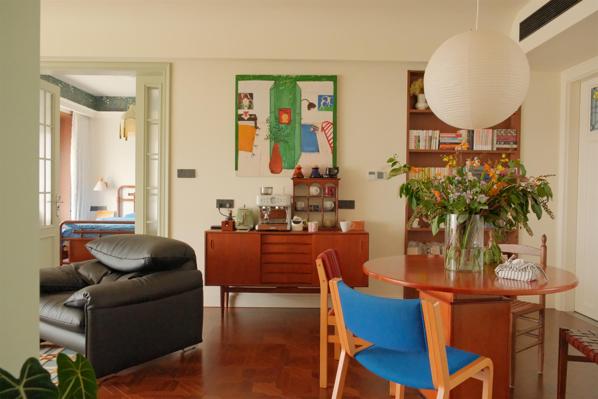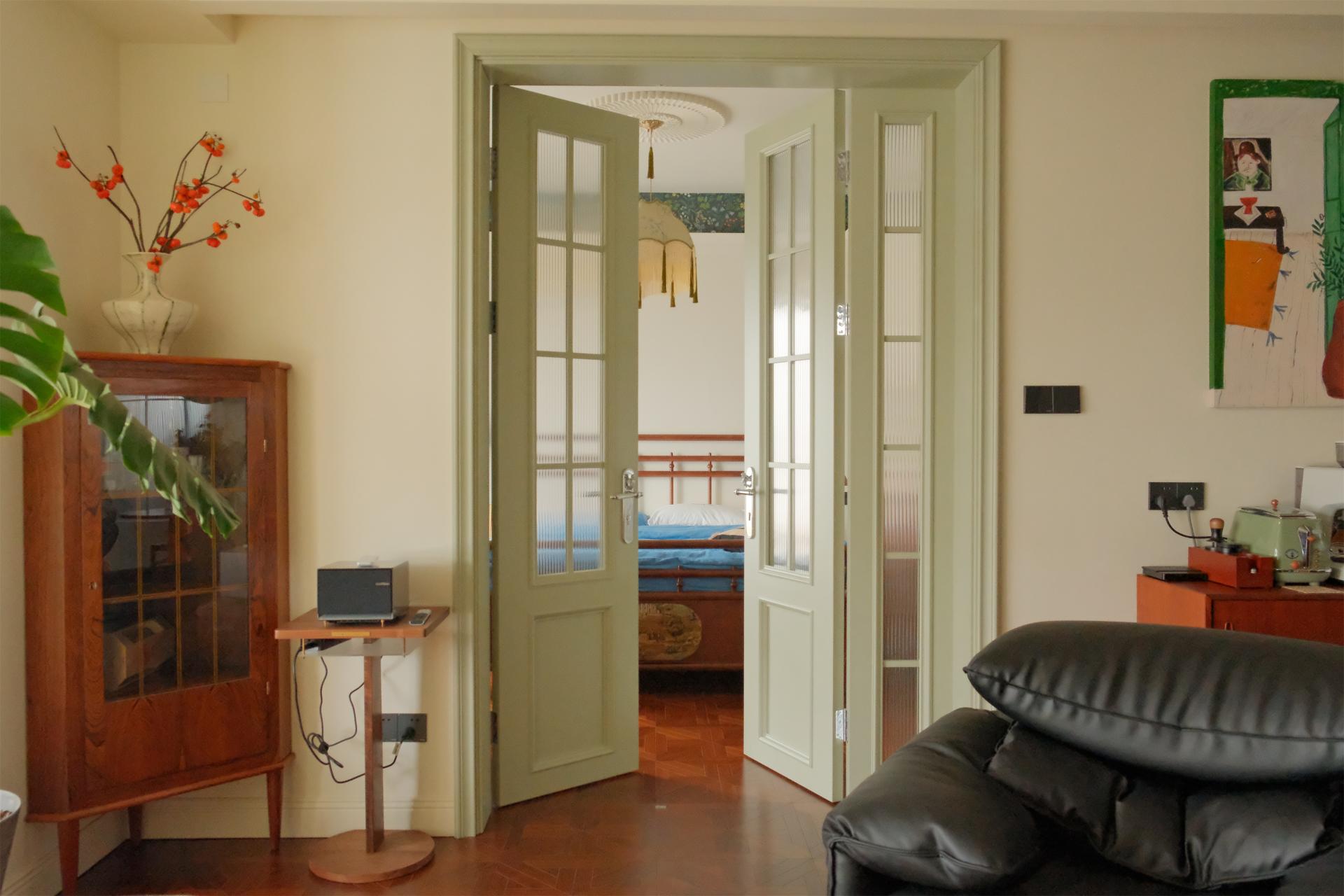 To alleviate people's stress in modern life, strategic placements of greenery, such as at desks and by windows, foster a more natural and vibrant ambiance. The design emphasizes spatial continuity with minimal partitions, and an open ceiling further reduces any feeling of oppression, infusing the space with stronger sense of relaxation. The study and furniture are crafted from warm-toned wood. The latex paint, artistic glass, quaint storage cabinets, vintage audio equipment, and decorative items collectively enhance the artistic atmosphere. Forest's Whisper Retreat incorporates paper lanterns, round tables, and the circular elements of arched chandeliers in the bedroom, introducing visual diversity while averting monotony. This helps establish a serene yet dynamic environment, providing an idyllic sanctuary for homeowners to find respite.