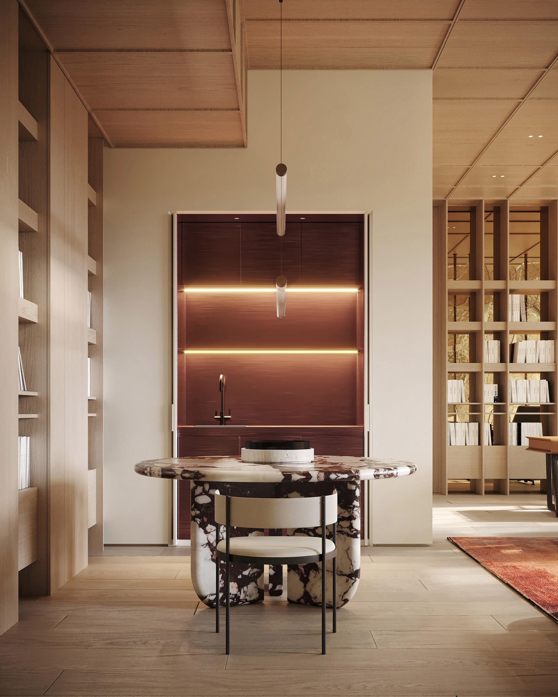 Iconic interior pieces serve as focal points within the space. An Arte Veneziana partition separates the home office from the second living room, adding a soft aesthetic inspired by the organic forms found in Italian lakes. The second level features a hidden kitchen that remains unobtrusive when closed, transforming into a captivating art piece when opened. A marble dining table with an active texture introduces visual complexity to the dining area, while tinted mirrors used in shelves and cabinets enhance the sense of depth and volume in the space. The master bathroom, designed with travertine and colored sanitary ware, exudes harmony and sensuality.