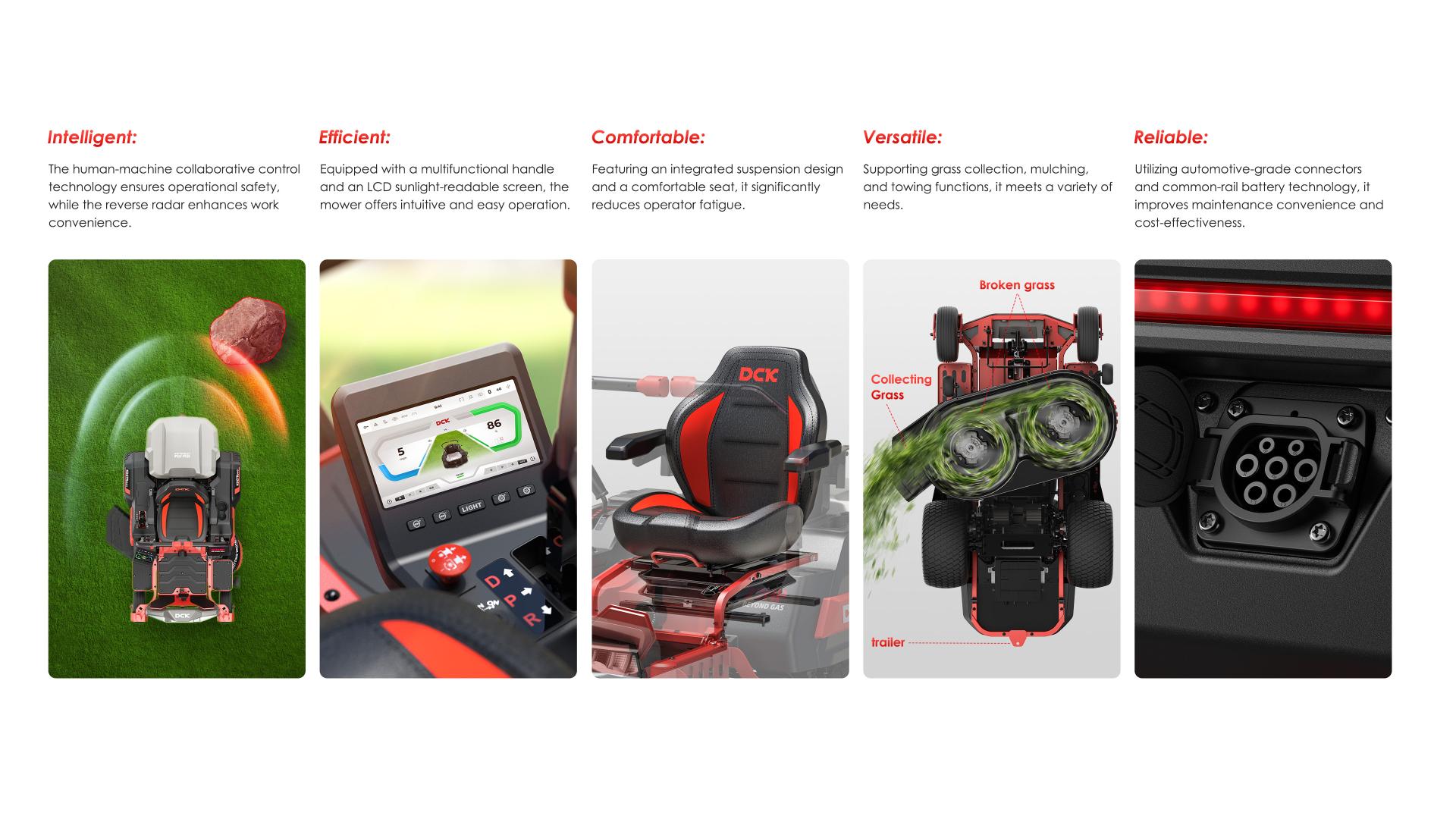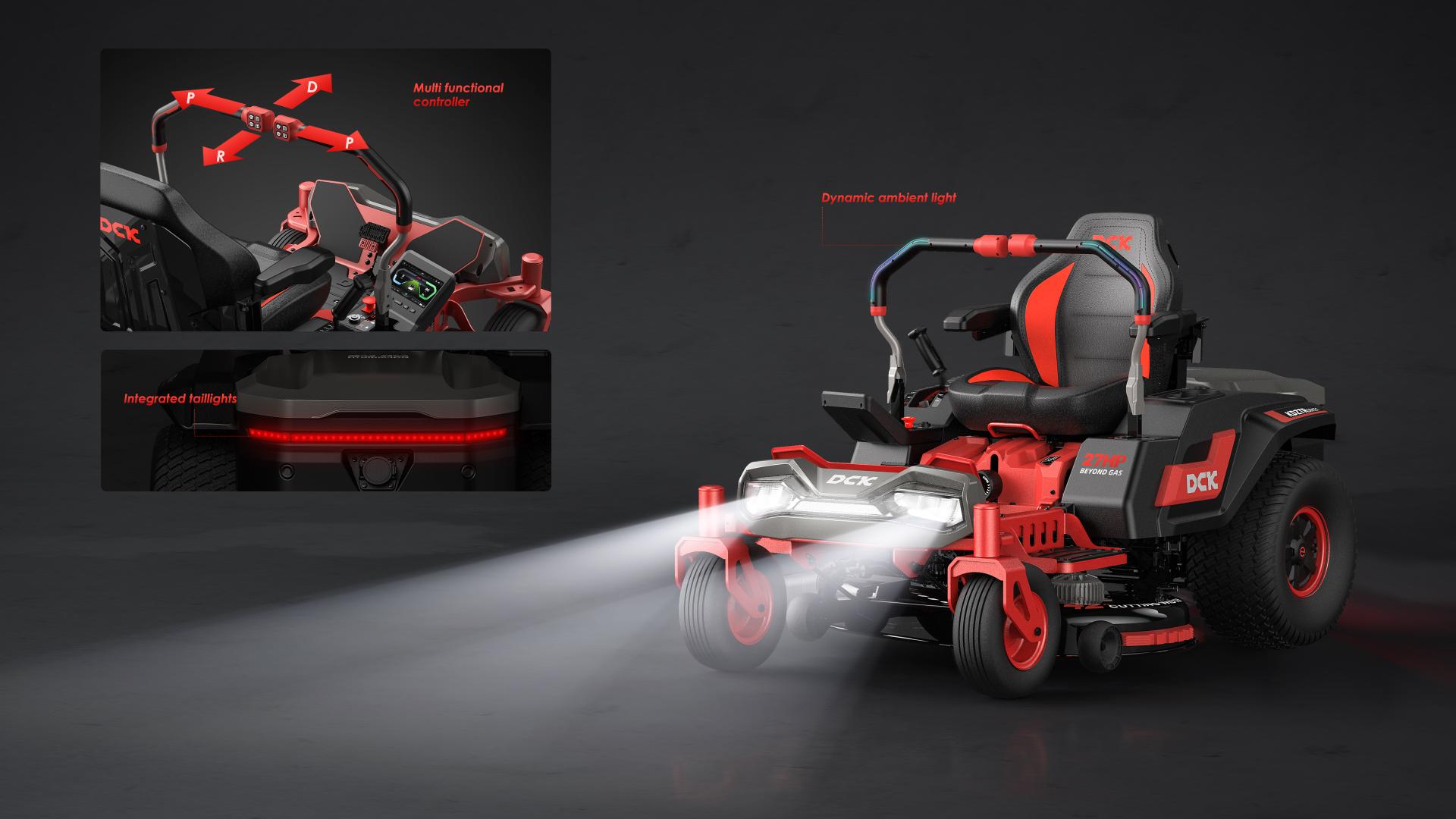 As urbanization accelerates, traditional lawn mowing methods struggle to meet the demands of large-area grass maintenance. Our product replaces conventional fuel-powered engines with lithium-electric technology, achieving zero emissions and low noise levels, in line with environmental policies and the trend towards sustainability. Additionally, by leveraging high-performance lithium batteries, innovative charging solutions, and precise smart controls, we offer users an efficient and comfortable mowing experience, significantly enhancing work efficiency and operational convenience. The product's exterior design harmoniously blends strength and technology, adopting a palette primarily of black, white, and grey, accented with the brand's signature red to highlight professionalism and visual appeal. Smooth lines paired with an integrated rear light and dynamic ambient lighting convey a striking technological aesthetic. The layered design featuring a combination of multiple materials, along with the use of uniform colors across different textures, underscores the product's refined feel and industrial power. Precise design in overall proportions and detailed elements ensures not only functional requirements are met but also that the visual impression remains lightweight and dynamically balanced. As a lithium-powered ride-on mower, this product plays a crucial role in energy conservation and emissions reduction, minimizing environmental impact and harm to human health. By enhancing work efficiency and reducing operational costs, it offers a sustainable solution for the landscaping and agricultural machinery sectors. Designed for ease of operation, high safety, and comfort, this mower not only alleviates labor shortages but also delivers a more relaxed and efficient working experience for users. It drives technological innovation within the industry, generating broader social value.
