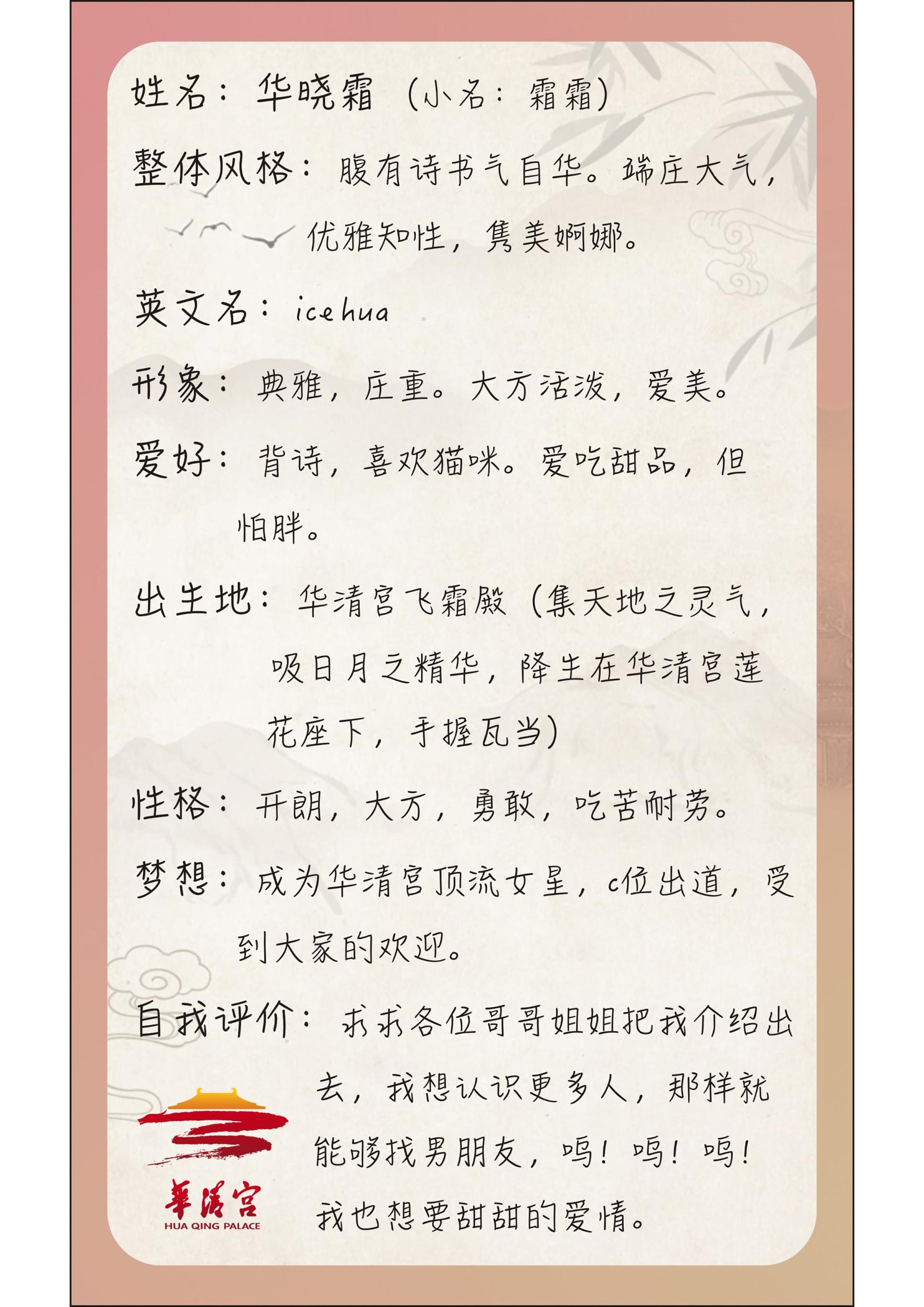 ‘Hua’ - born in Hua Qing Palace, so the character image from the ‘Hua’ family name, Hua is also a hundred surnames in the real existence of the family name!
