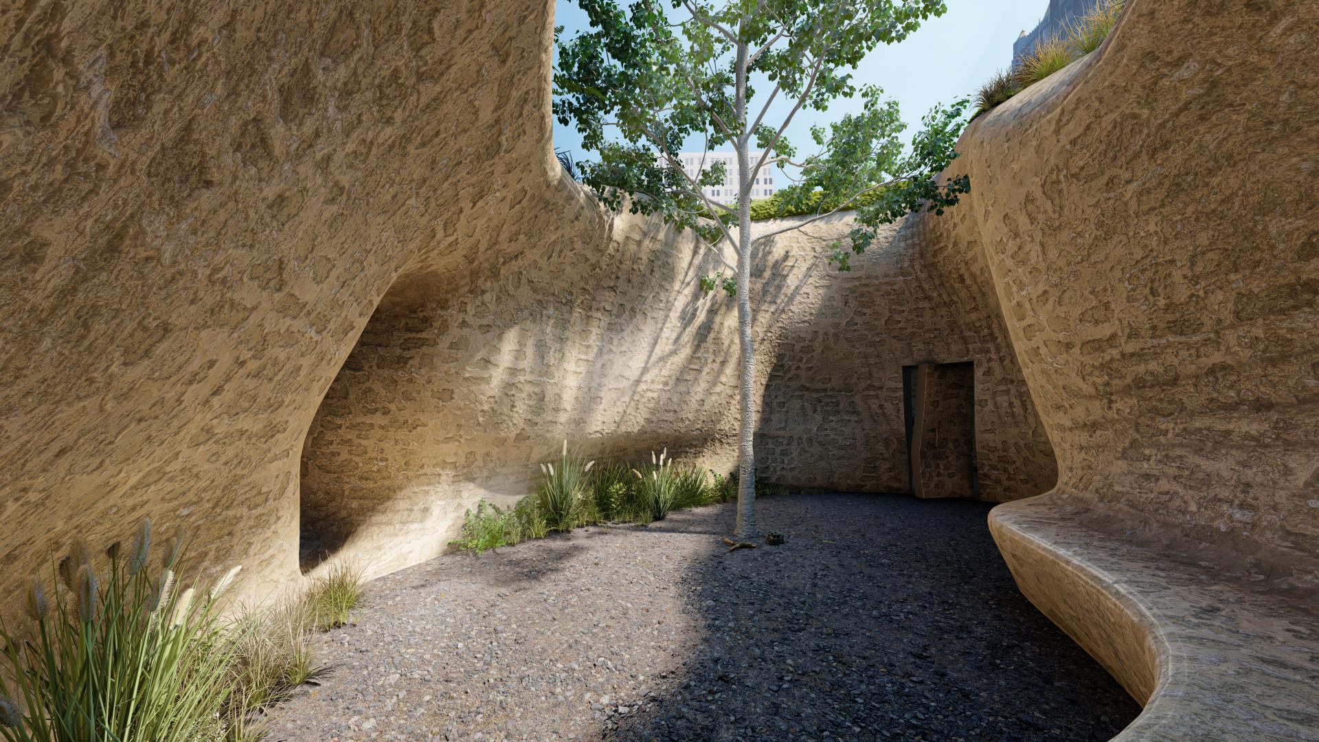 Our design aims to offer a momentary sanctuary within the bustling urban environment of Manhattan, envisioning a structure that resembles a primitive cave, crafted from natural materials that blend seamlessly with the park's landscape. The exterior, with its raw and unrefined aesthetic, contrasts sharply with the surrounding urban architecture, inviting visitors to step away from the city's hustle and into a space of calm and reflection. Inside, the space is designed to evoke tranquility and a deep connection to nature. Soft, diffused lighting mimics the gentle play of sunlight filtering through foliage, while earthy textures and organic forms create a tactile, immersive environment.