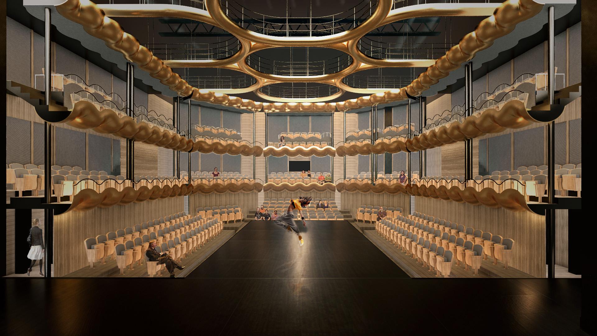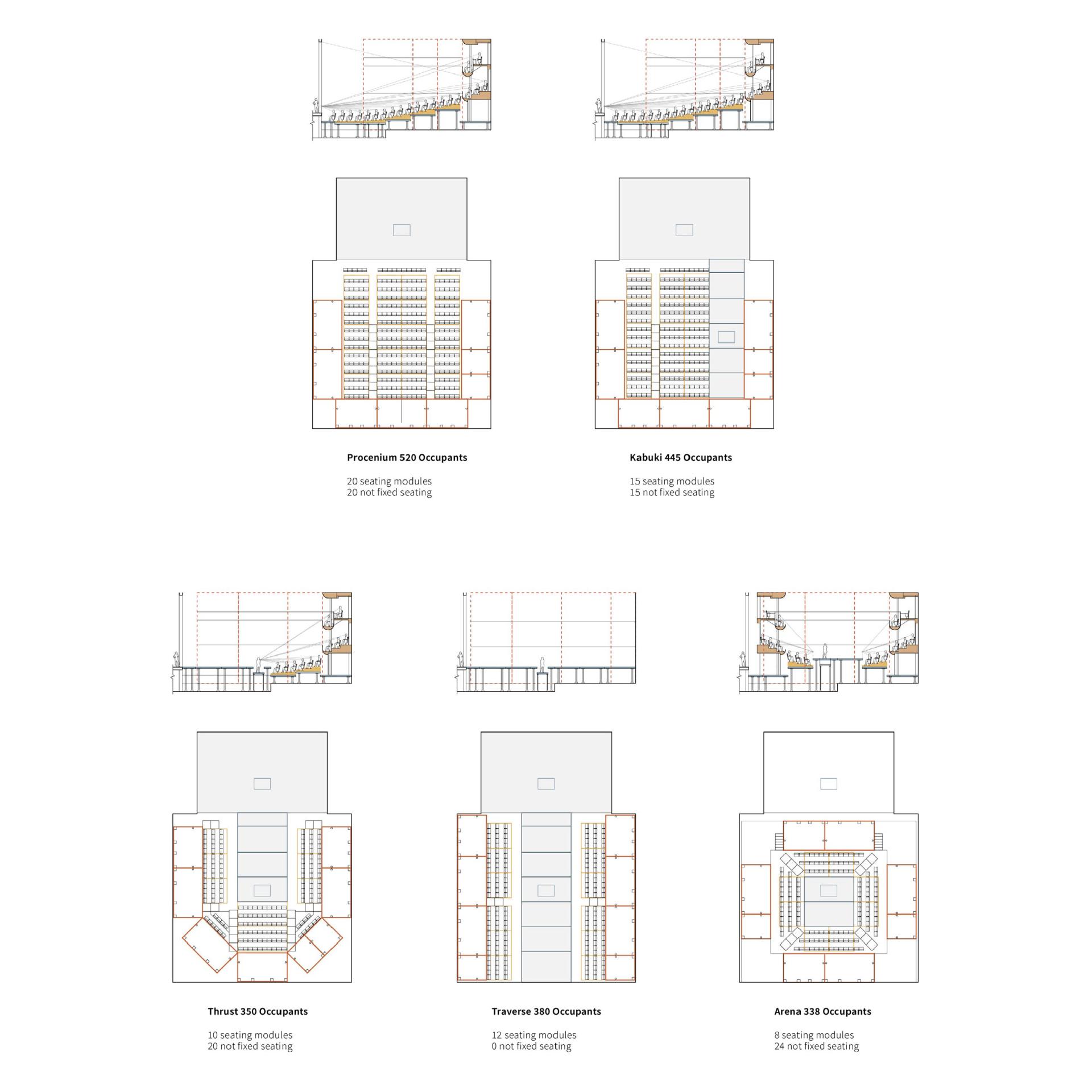 The theatre space is fully modular, allowing for flexible reconfiguration to achieve diverse spatial effects suited to various types of performances. Inspired by Chicago's Yard Shakespeare project, the design features eight tower modules that can be lifted and repositioned using air bearings. Additionally, the modular floor can be adjusted vertically, enabling the creation of raked seating or an expanded stage area. This adaptability allows the theatre to transform from a grand proscenium setup accommodating over five hundred spectators to a more intimate arena stage with seating for three hundred.