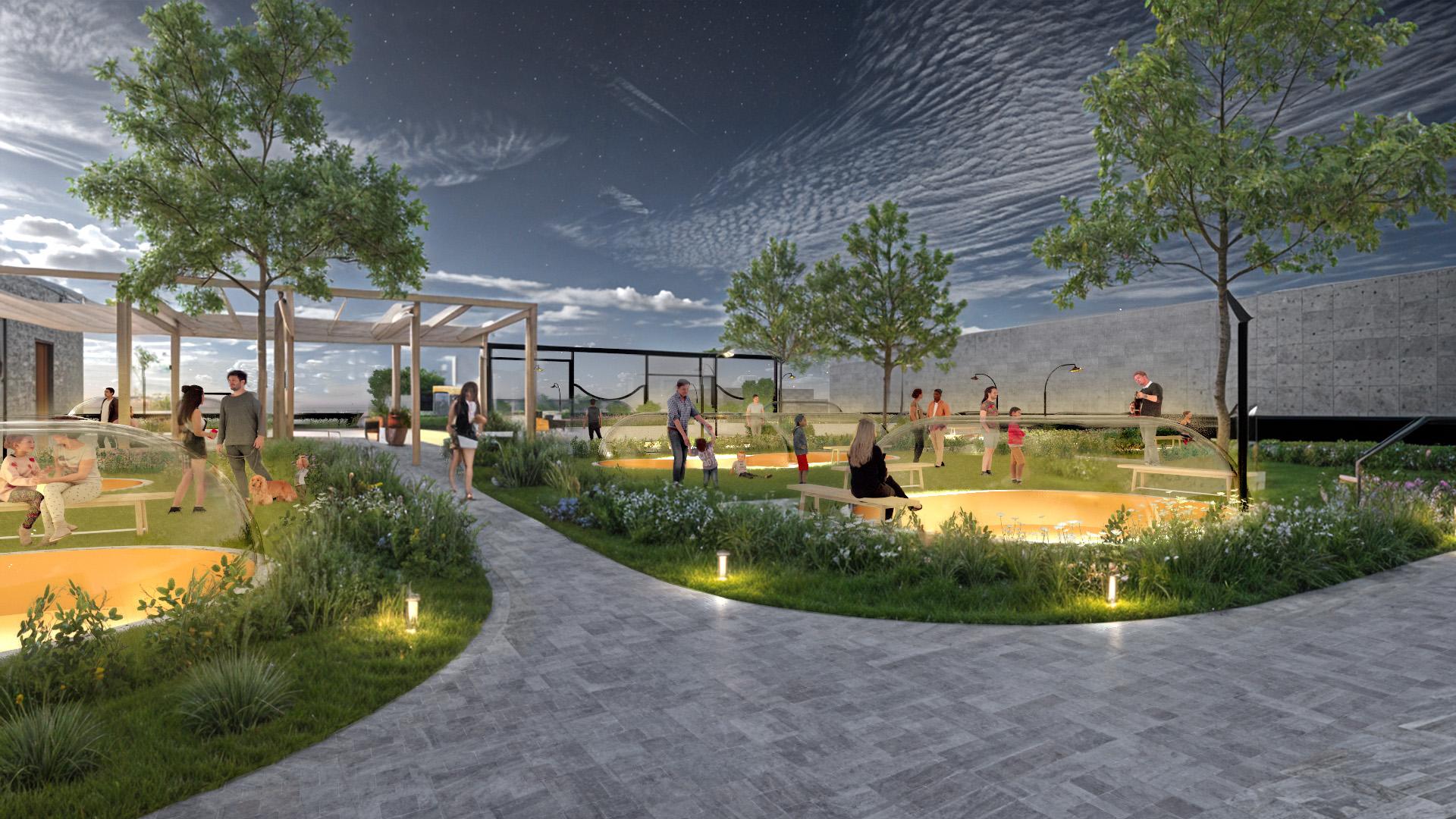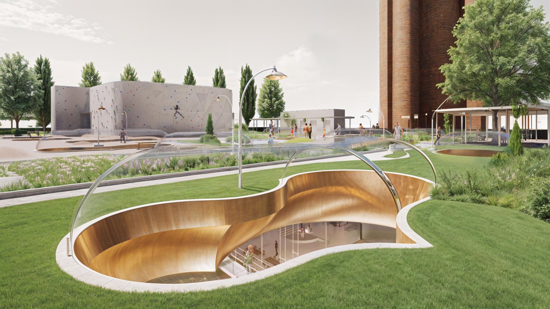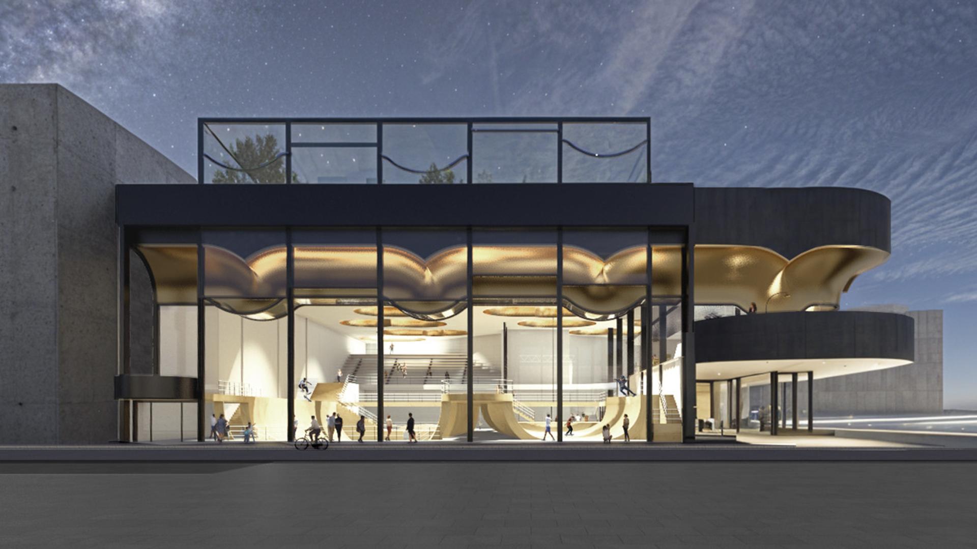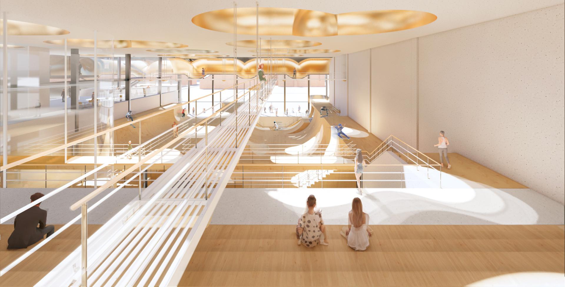 The concave and convex forms typical of skateparks serve as a recurring design motif throughout the project. On a larger scale, this motif inspired the skylight bubbles on the roof, allowing visitors in the rooftop garden to peer into the skatepark below while casting natural spotlights that animate the skatepark as a theatrical stage. At a smaller, furniture scale, the same motif is reflected in the design of the modular theatre seating and catwalk.
