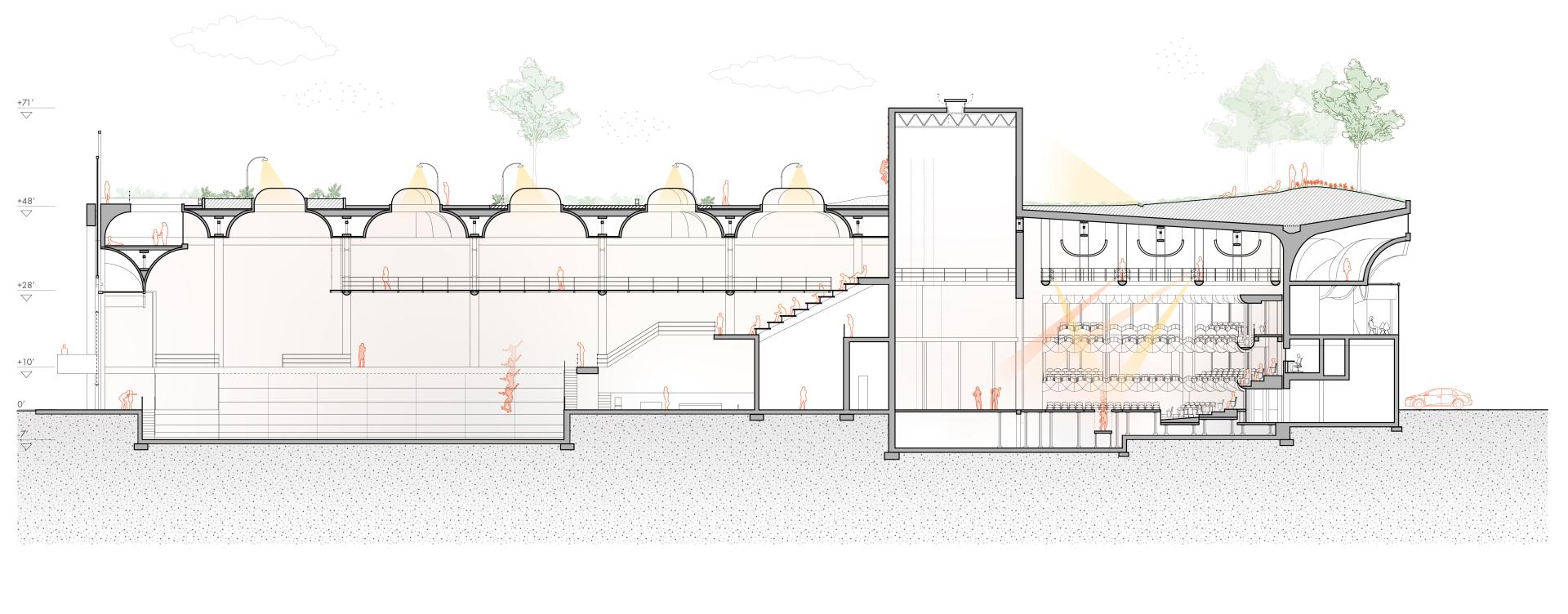 Theatricality relies on the tension between actors and viewers, and theatre space stages this tension. Located at the corner of the New Haven nine-square grid and in close proximity to the highway and Union Train Station, this performing arts center questions who can be considered an actor within its boundaries, as the site’s location offers the potential for a diverse demographic mix. By combining a skatepark with a modular theater capable of transforming into multiple stage configurations, the design invites both skaters and community members to become active participants. The project focuses on relationships between foreground and background, contrasting movement speeds, and creating a dialogue between street culture and high art.