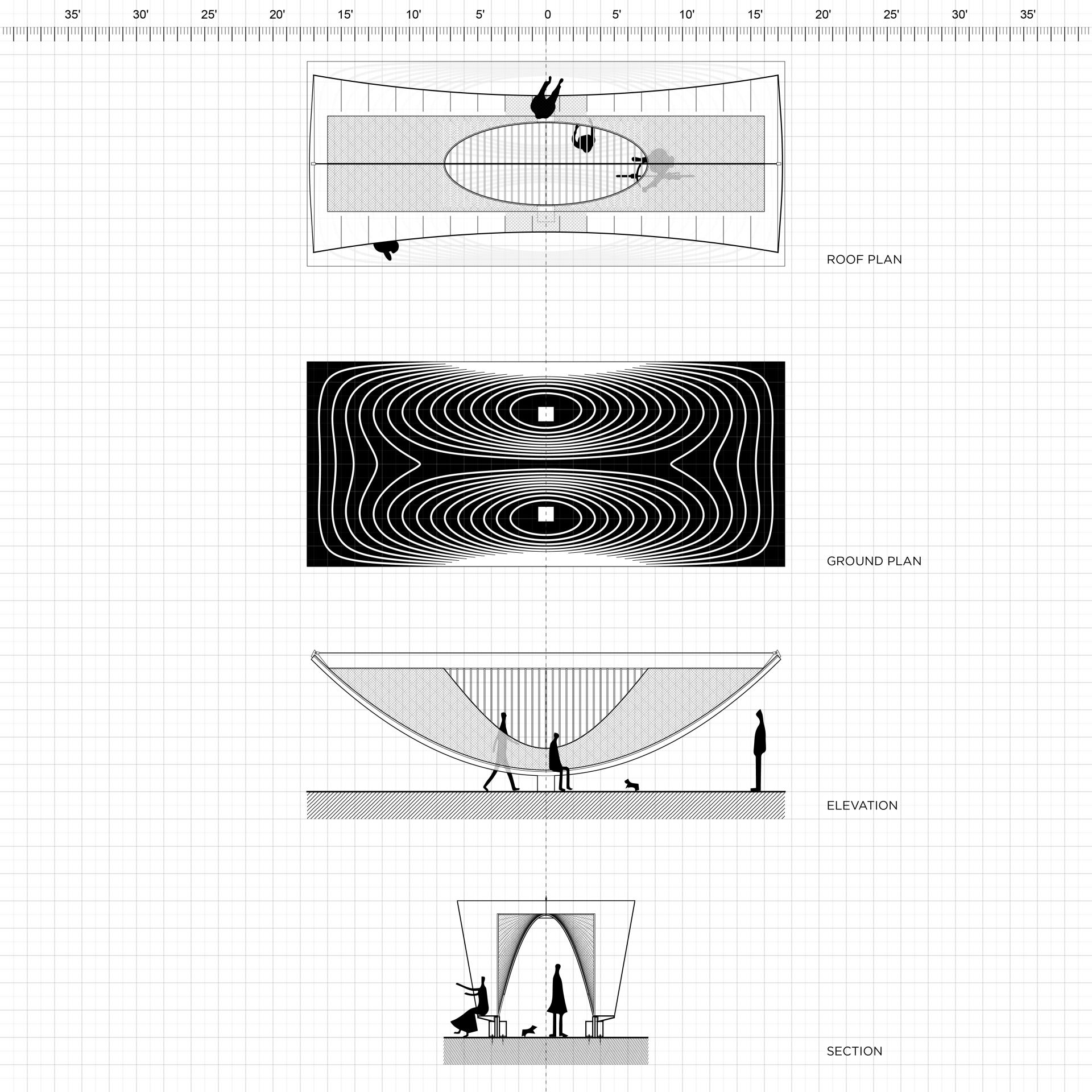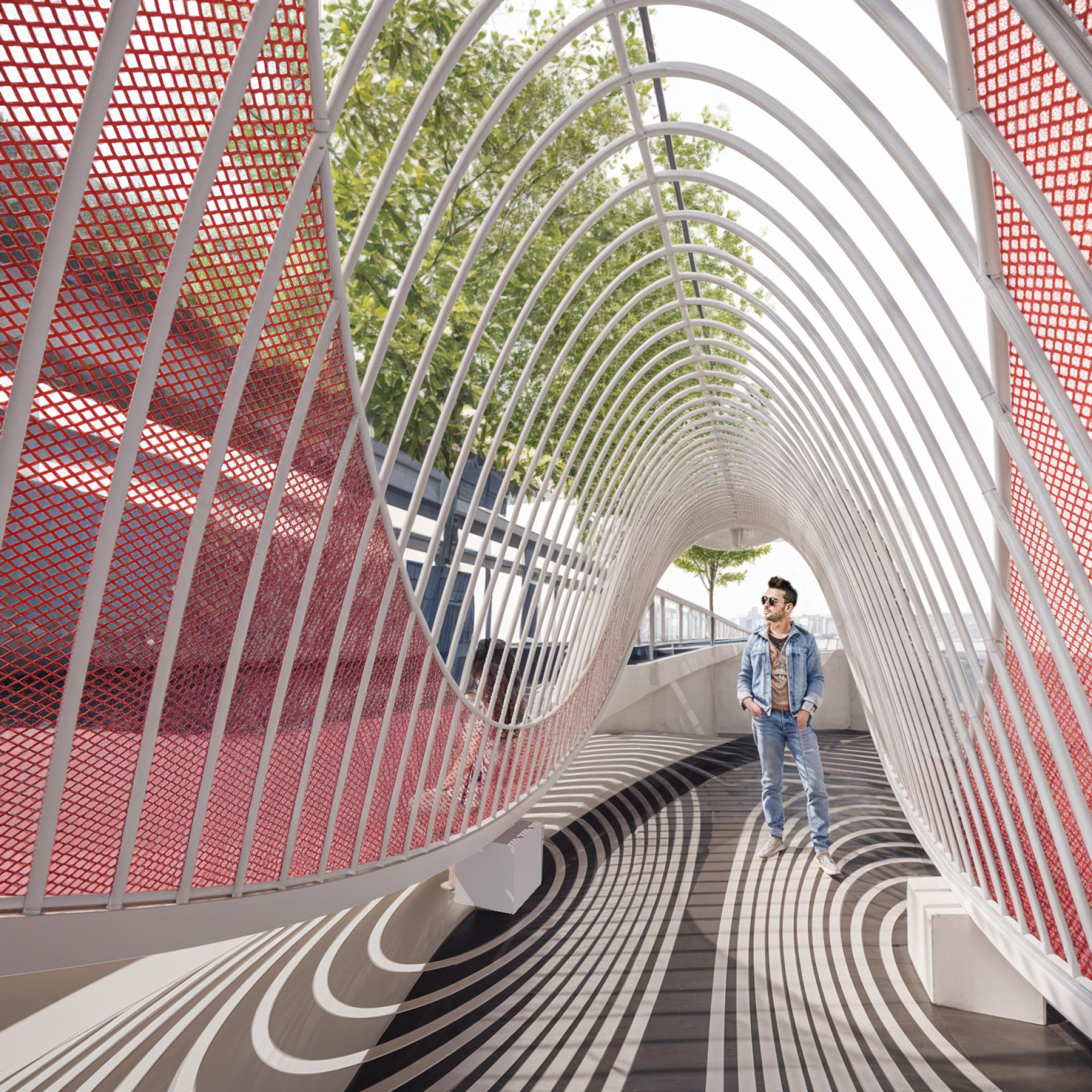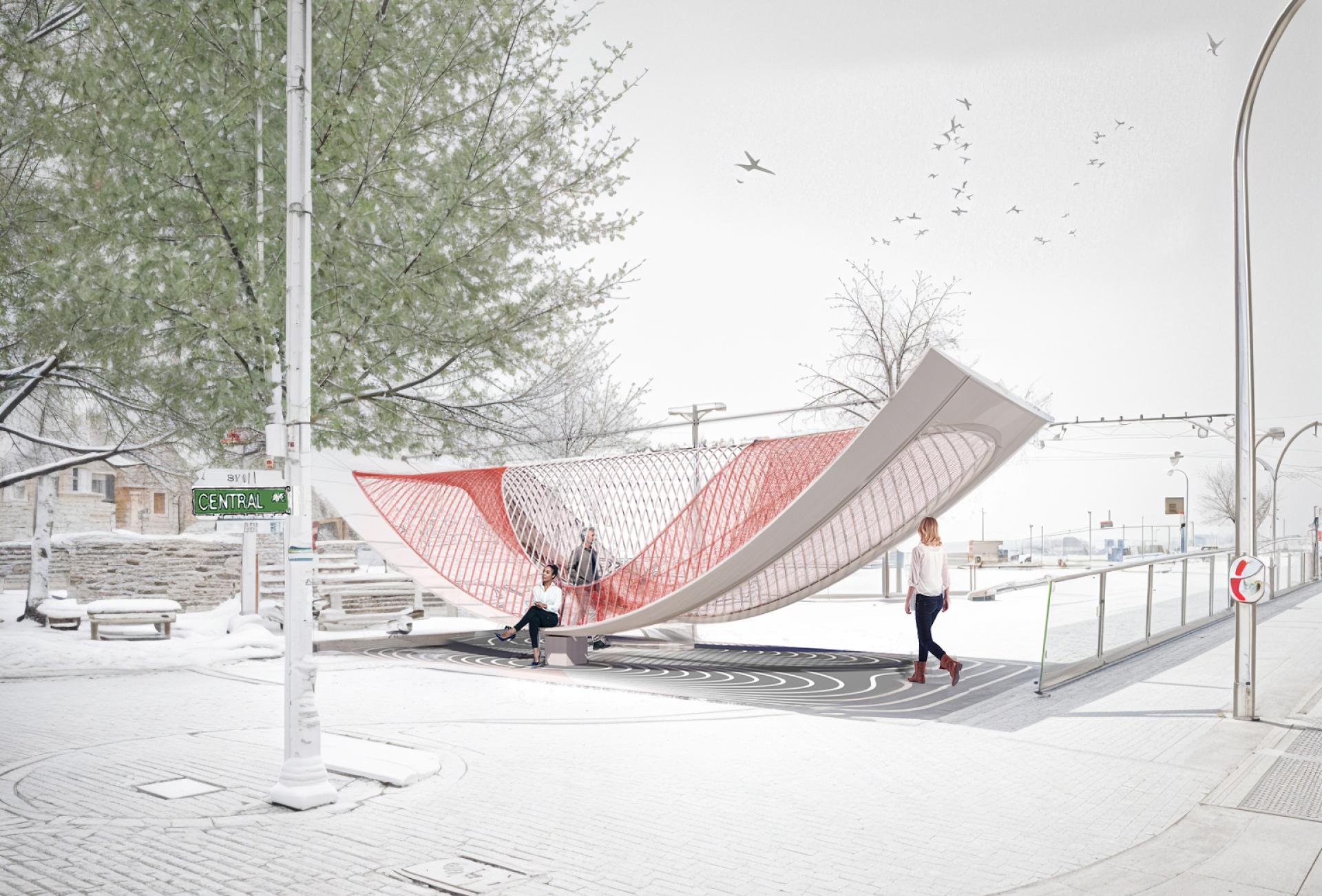52 Hertz is a public art pavilion in Surrey, Canada. The form evokes the graceful skeleton of a whale and creates an urban icon that’s simultaneously captivating and welcoming. Originally envisioned as a floating urban canopy, this art pavilion echoes the flow of the adjacent sky train across City Parkway and engages the ground with a minimal footprint. Cantilevered at both ends and anchored at the center, it provides integrated seating that encourages pedestrians to pause and interact with the installation.
