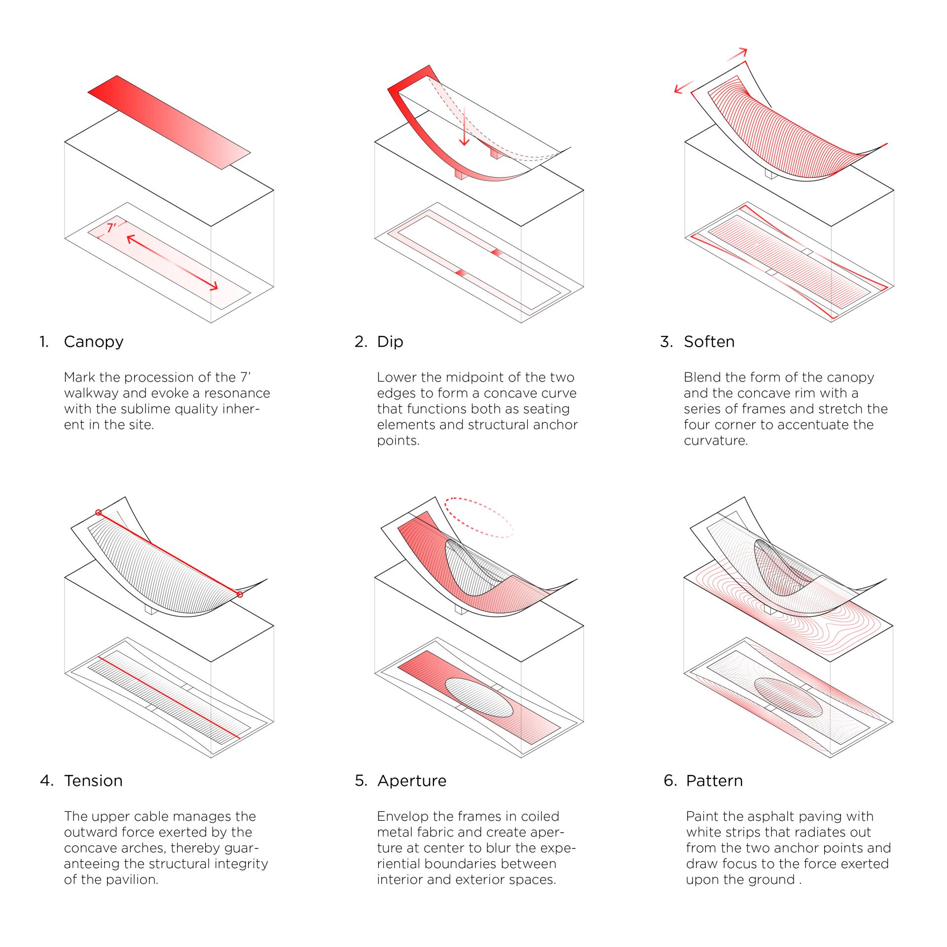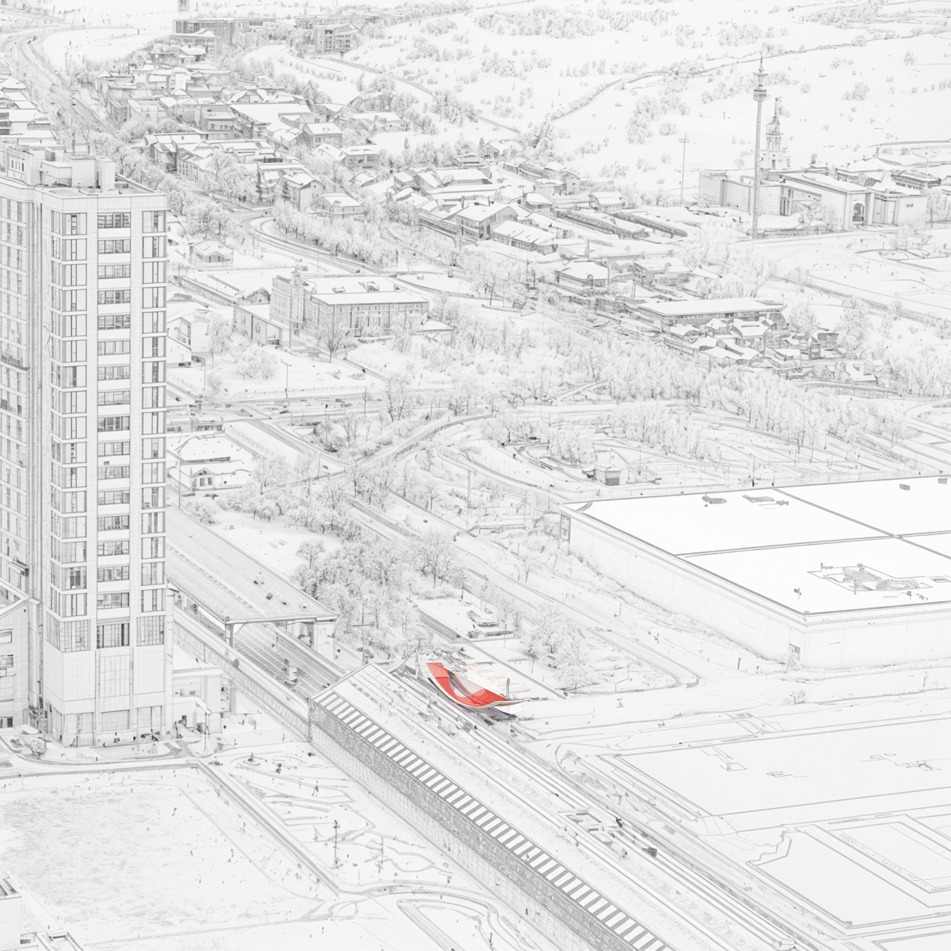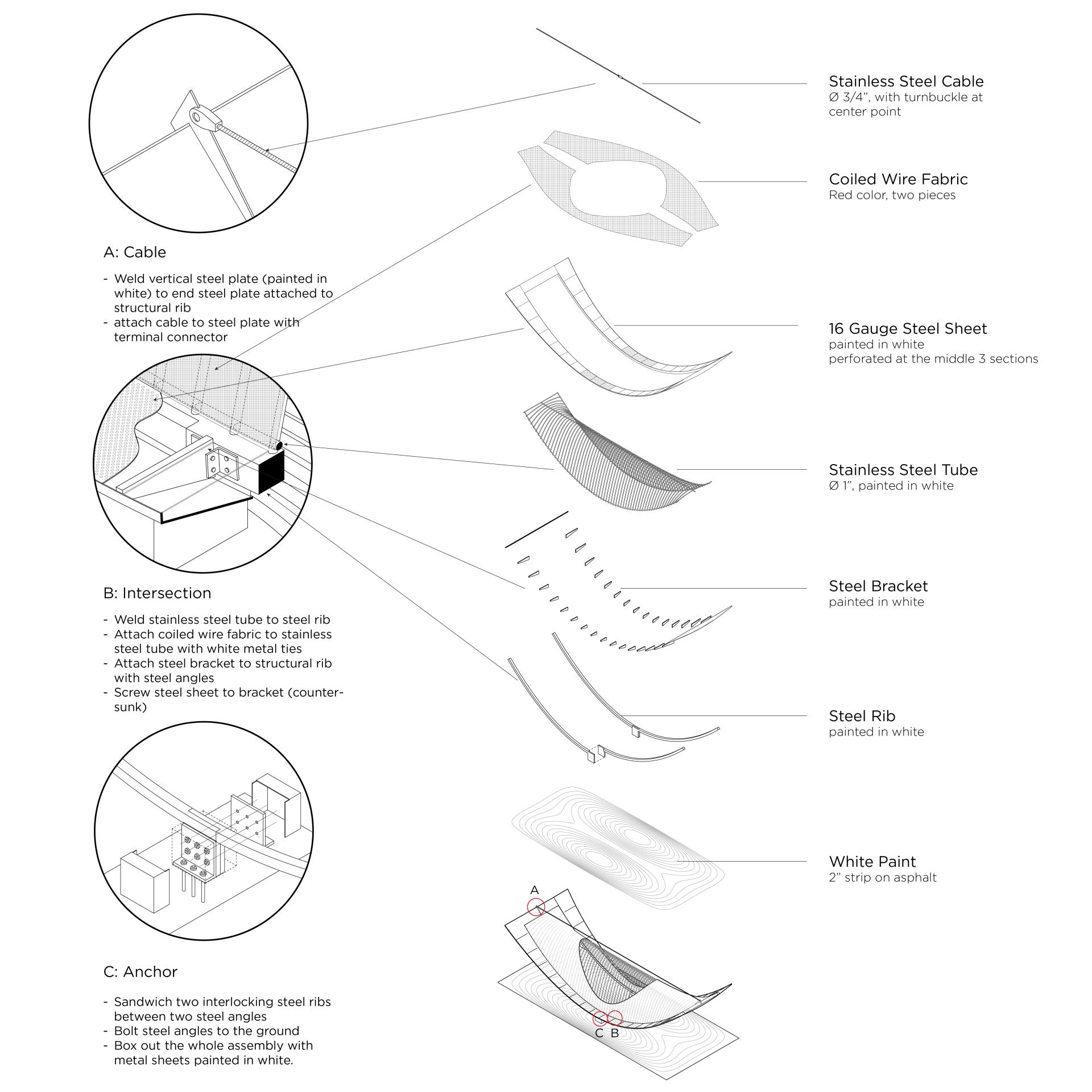 52 Hertz is a public art pavilion in Surrey, Canada. The form evokes the graceful skeleton of a whale and creates an urban icon that’s simultaneously captivating and welcoming. Originally envisioned as a floating urban canopy, this art pavilion echoes the flow of the adjacent sky train across City Parkway and engages the ground with a minimal footprint. Cantilevered at both ends and anchored at the center, it provides integrated seating that encourages pedestrians to pause and interact with the installation.