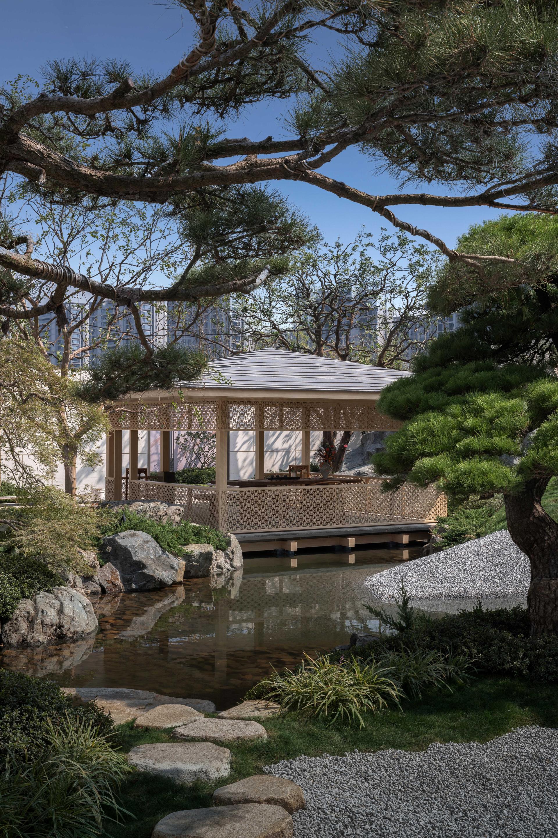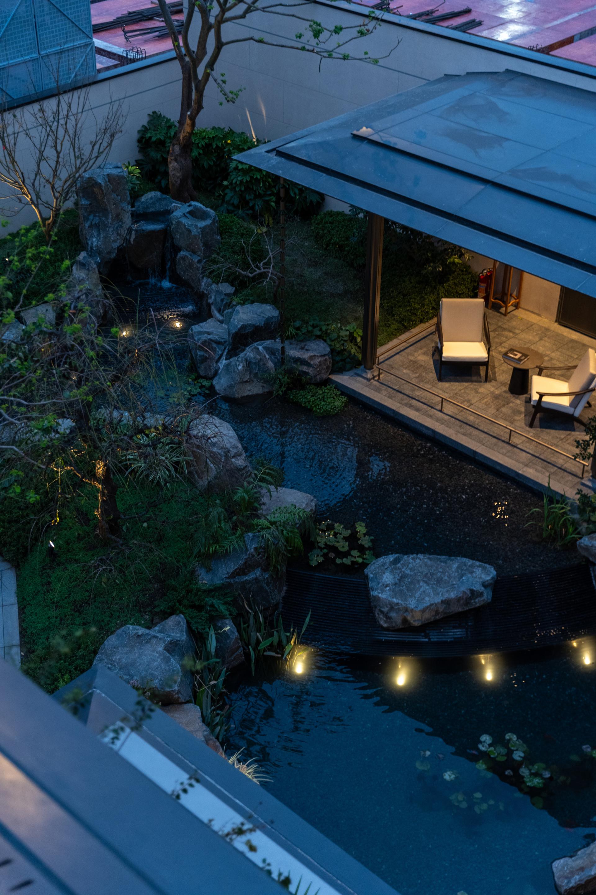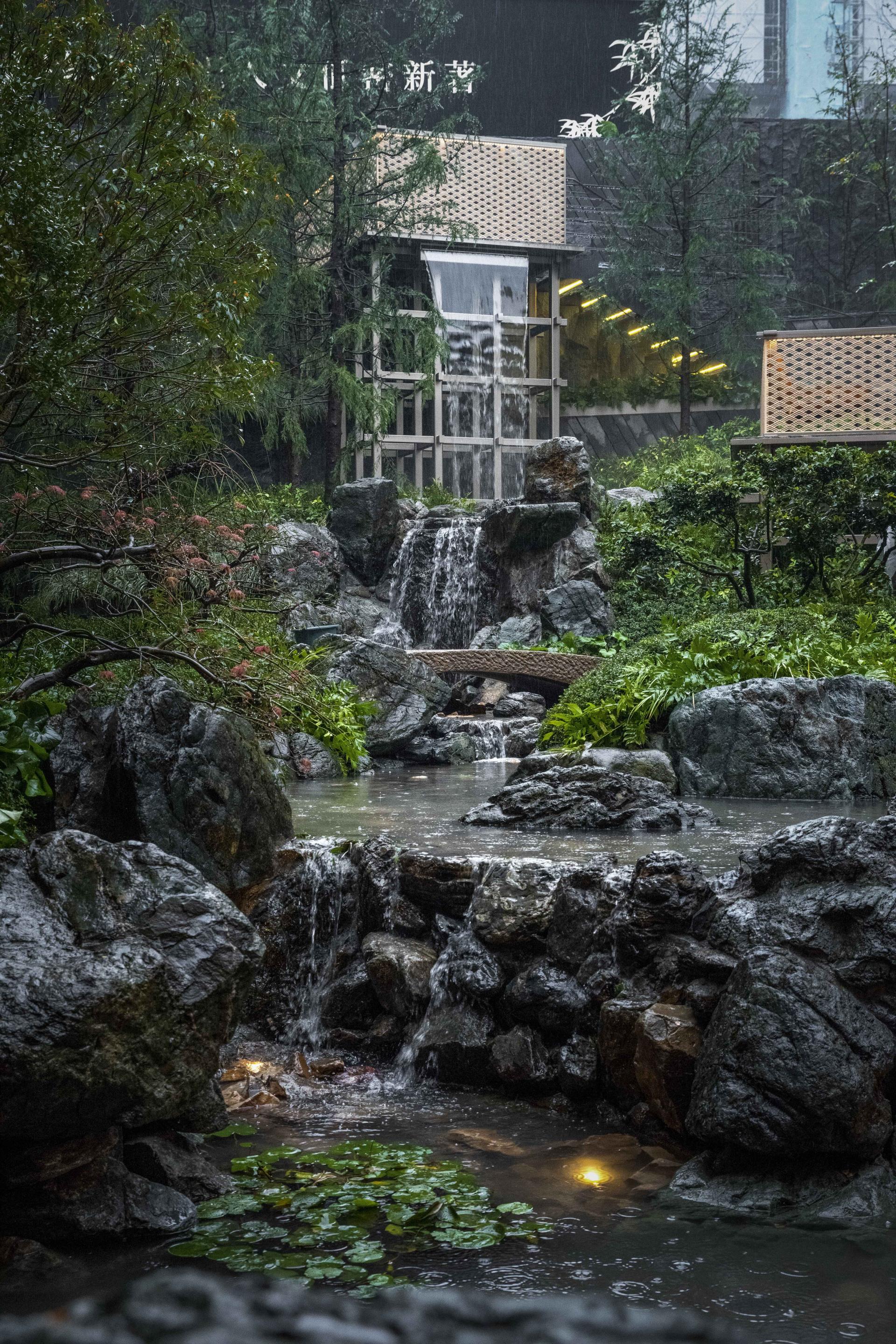 The landscapes of the central water court and sunken garden were designed by Ueyakato, while the model home garden and public areas were designed by LANSONG. Based on mutual coordination, both parties worked meticulously to refine and implement the designs, jointly creating the "Cloud Pavilion Water Realm" with great craftsmanship. We have integrated oriental painting aesthetics into the garden's artistry, allowing one to see the grandeur of the country's rivers, lakes, and seas within the garden. The expanse of the central water courtyard resembles the East China Sea, adorned with lush black pines and accompanied by moss and gravel. A pavilion stands by the water, offering a splendid view of the mountains and water, inviting contemplation of one's inner self. Following the natural elevation changes, a three-dimensional sunken garden is created with rock formations and cascading water. The three-tiered viewing platform offers multiple spaces for dialogue with nature. Waterfalls cascade continuously, with the scenery unfolding layer by layer like a scroll. Throughout the garden, one can see trickling water streams, inviting strolls where the rhythm of water engages in a dialogue with nature, evoking the true meaning of life.