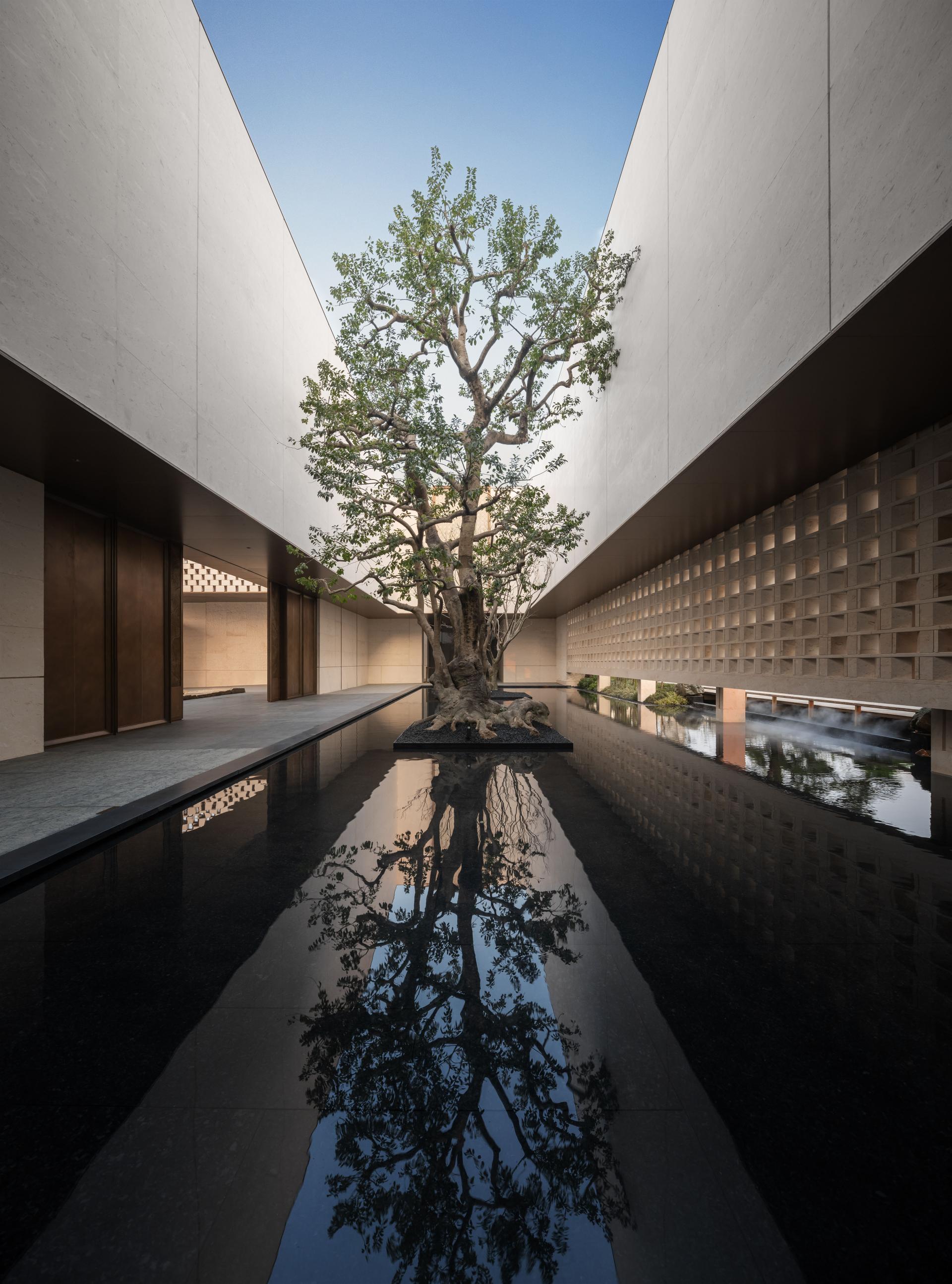 The grand entrance archway embodies the elegance of Song-style rooftops, with stone inscriptions greeting visitors beneath the eaves, signifying a respectful and honorific sequence. In the central courtyard, a pool of mirror-like water reflects the sky, surrounded by ancient trees intertwined.