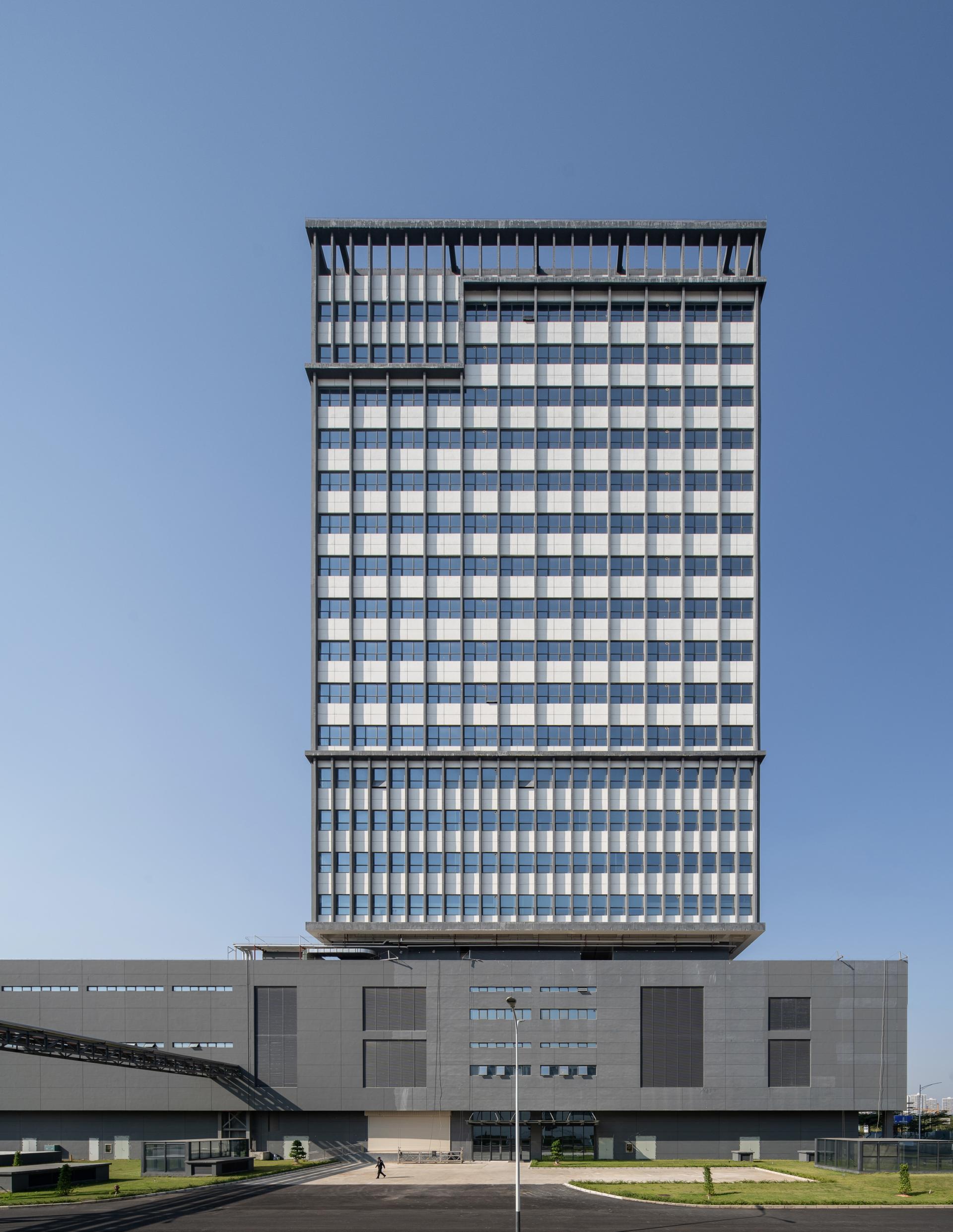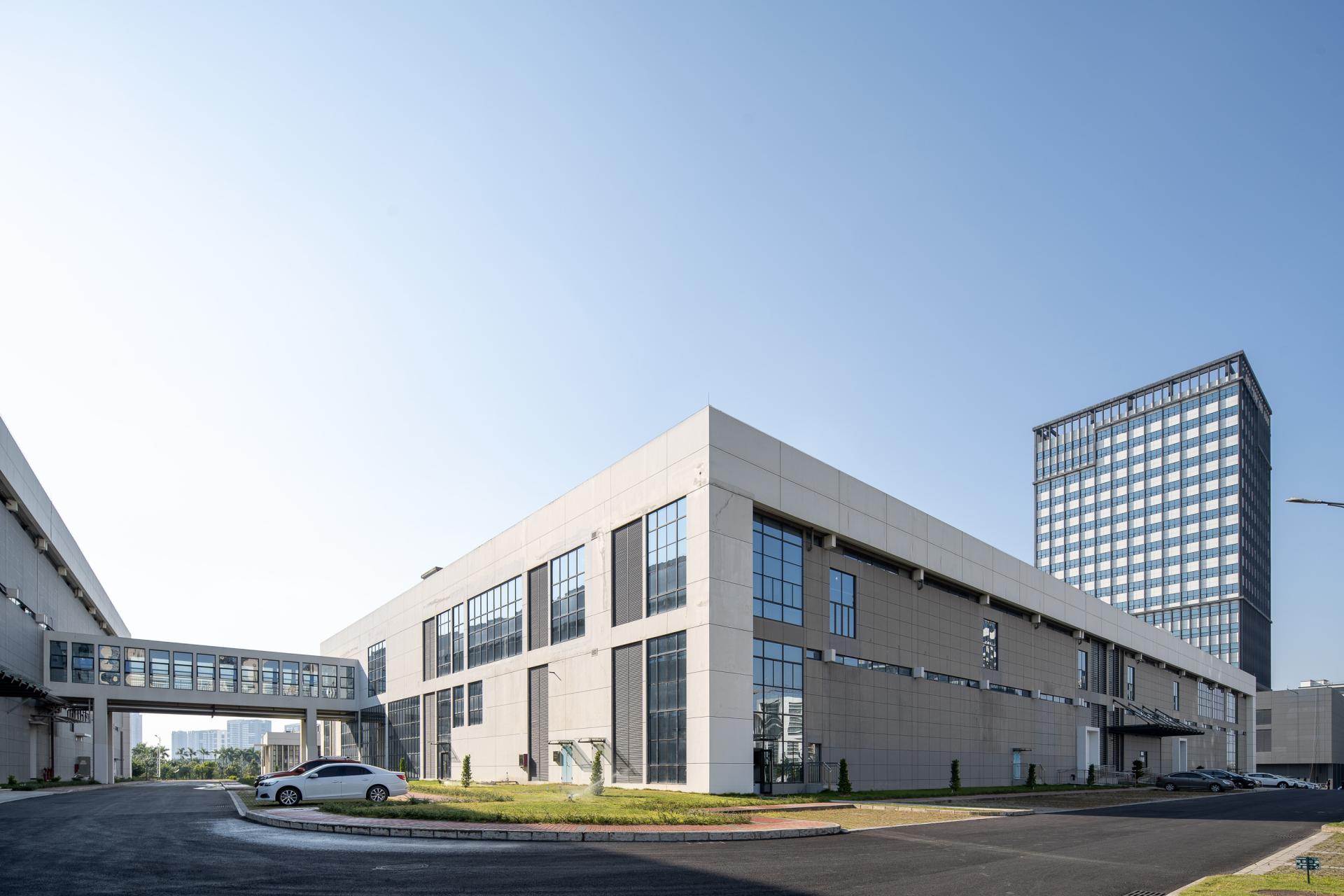 Building 1 and Building 2, used as workshops, are connected via a corridor on the second floor. Their facades are mainly composed of strip windows and grey and white coatings with aluminum-like textures, showcasing a simplistic image. On the south side of Building 1, a spacious freight yard was designed for 16-meter-long trucks to load and unload goods, while a smaller one was set on the west side of Building 2 for trucks with smaller capacity.