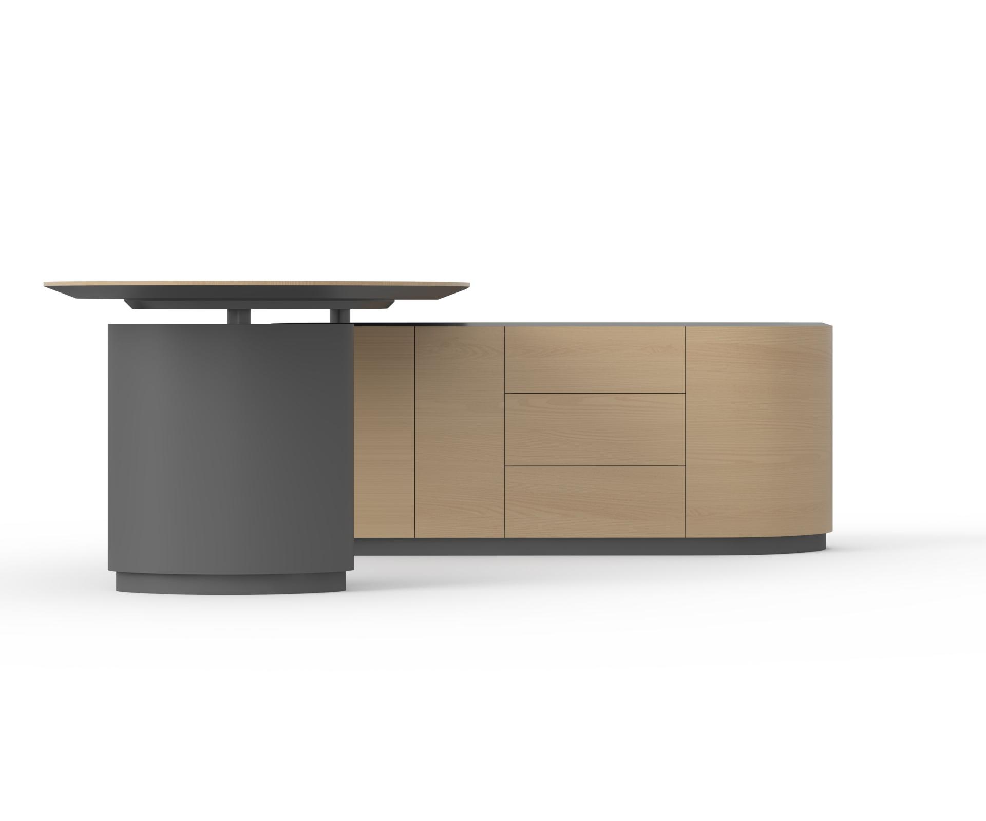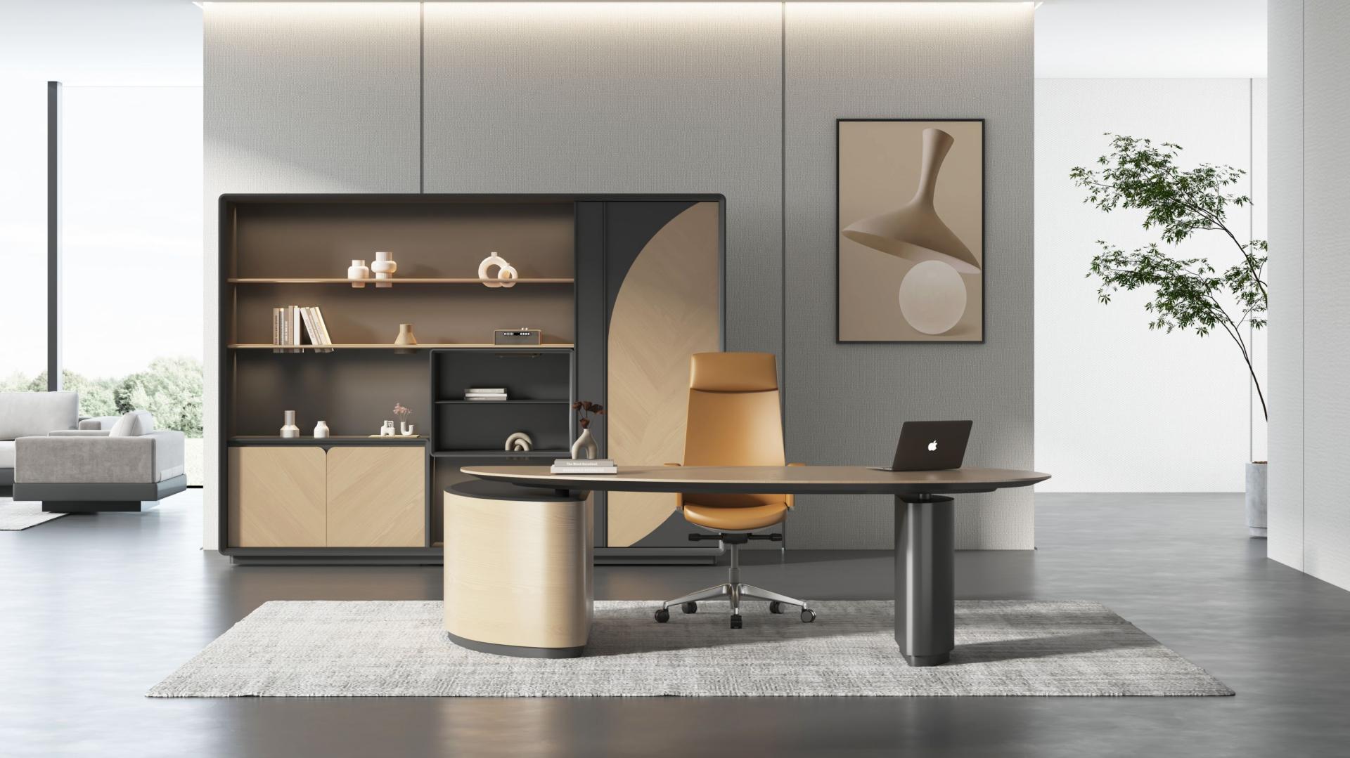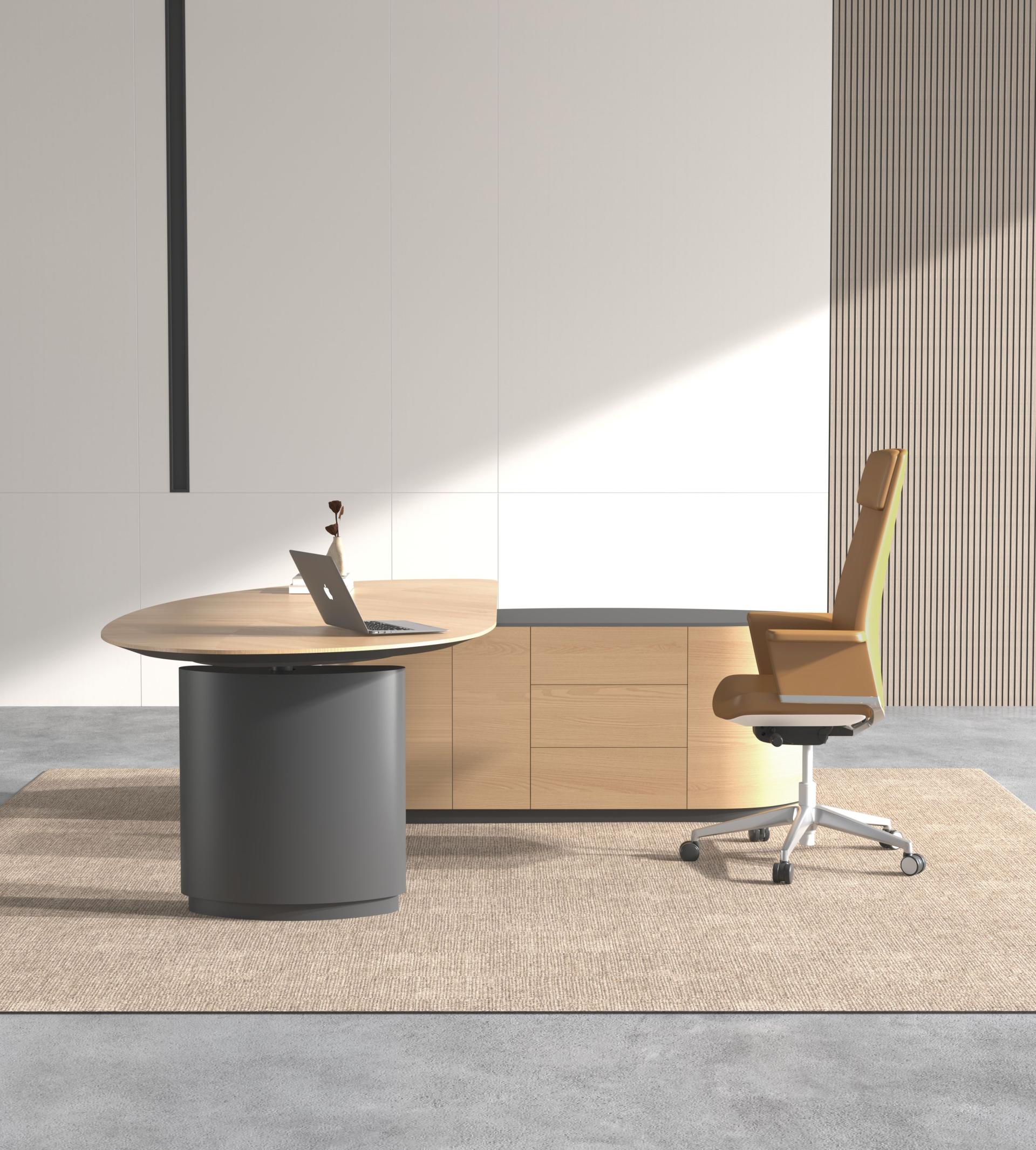 To maintain an organized workspace, a multifunctional cable management box is integrated into the side of the desktop, addressing various electrical needs. The side cabinets' drawers and doors feature an elegant concealed no-pull handle design that reflects the simplicity inherent in contemporary design.