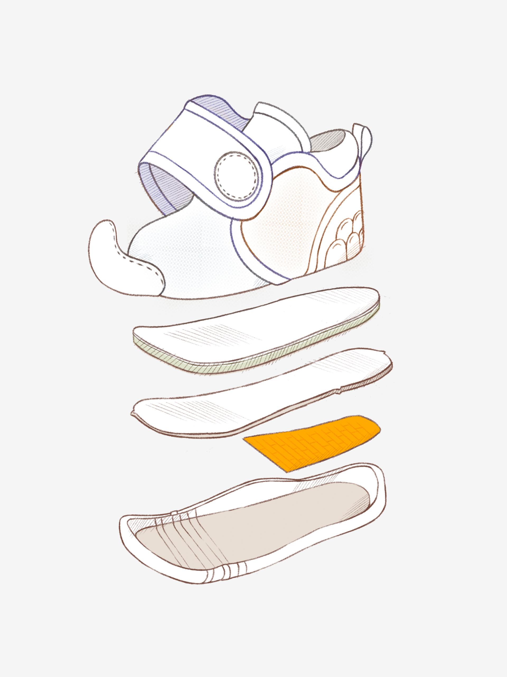 The outsole is also packed with thoughtful details. The front one-third area is designed to flex easily, mimicking the natural bending motion of the metatarsophalangeal joint. This design achieves 98% barefoot-level efficiency in force application, encouraging proper gait development. The ultra-thin 3.2mm outsole, combined with a zero-drop profile, maximizes ground contact, effectively enhancing sensory feedback for tiny feet. High-quality rubber is used to ensure excellent anti-slip performance, delivering reliable grip on both smooth and slippery surfaces for optimal safety. Moreover, the toe area is crafted using high-strength, impact-resistant materials for 180° protection, and widened to prevent squeezing delicate toes, allowing them to stretch naturally.