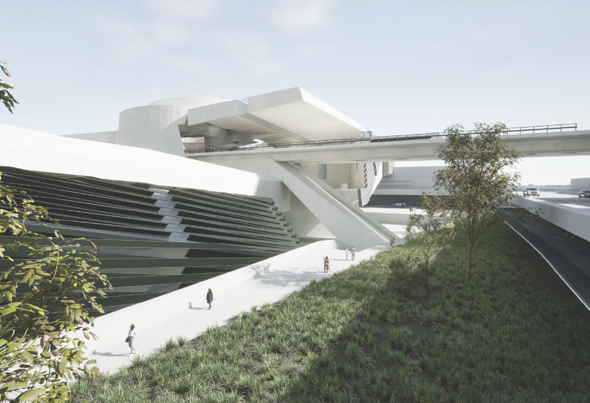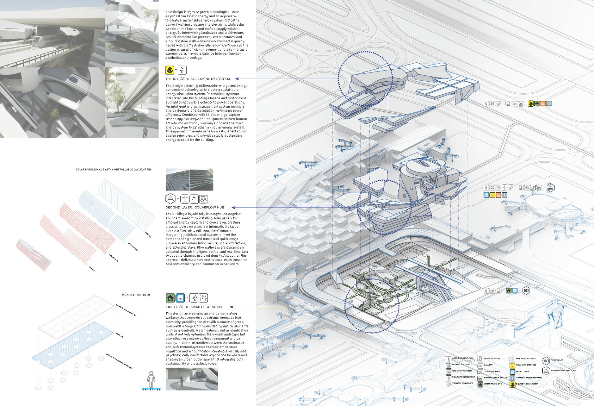 The design features an innovative energy system that combines pedestrian kinetic energy harvesting and solar power. Footpaths embedded with kinetic tiles convert walking pressure into electricity, while solar panels on the façade and rooftop supply clean, renewable energy. Together, these technologies form a self-sustaining energy cycle that powers the structure efficiently.