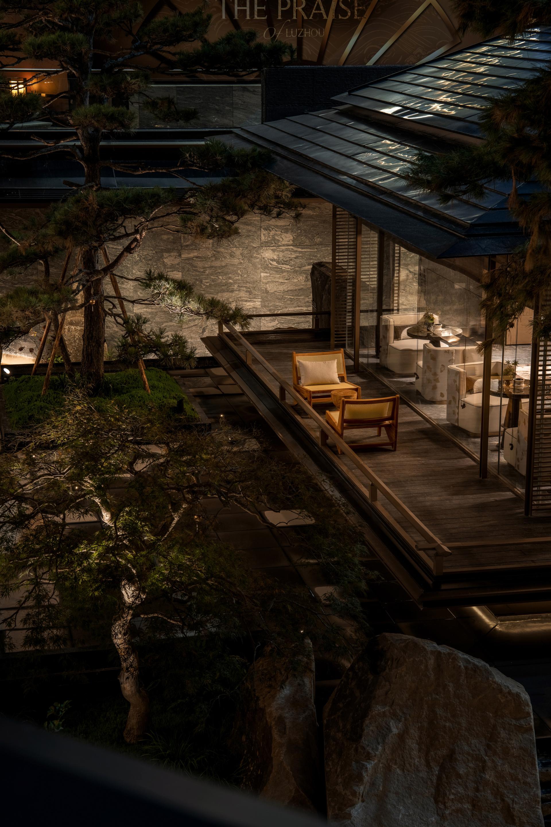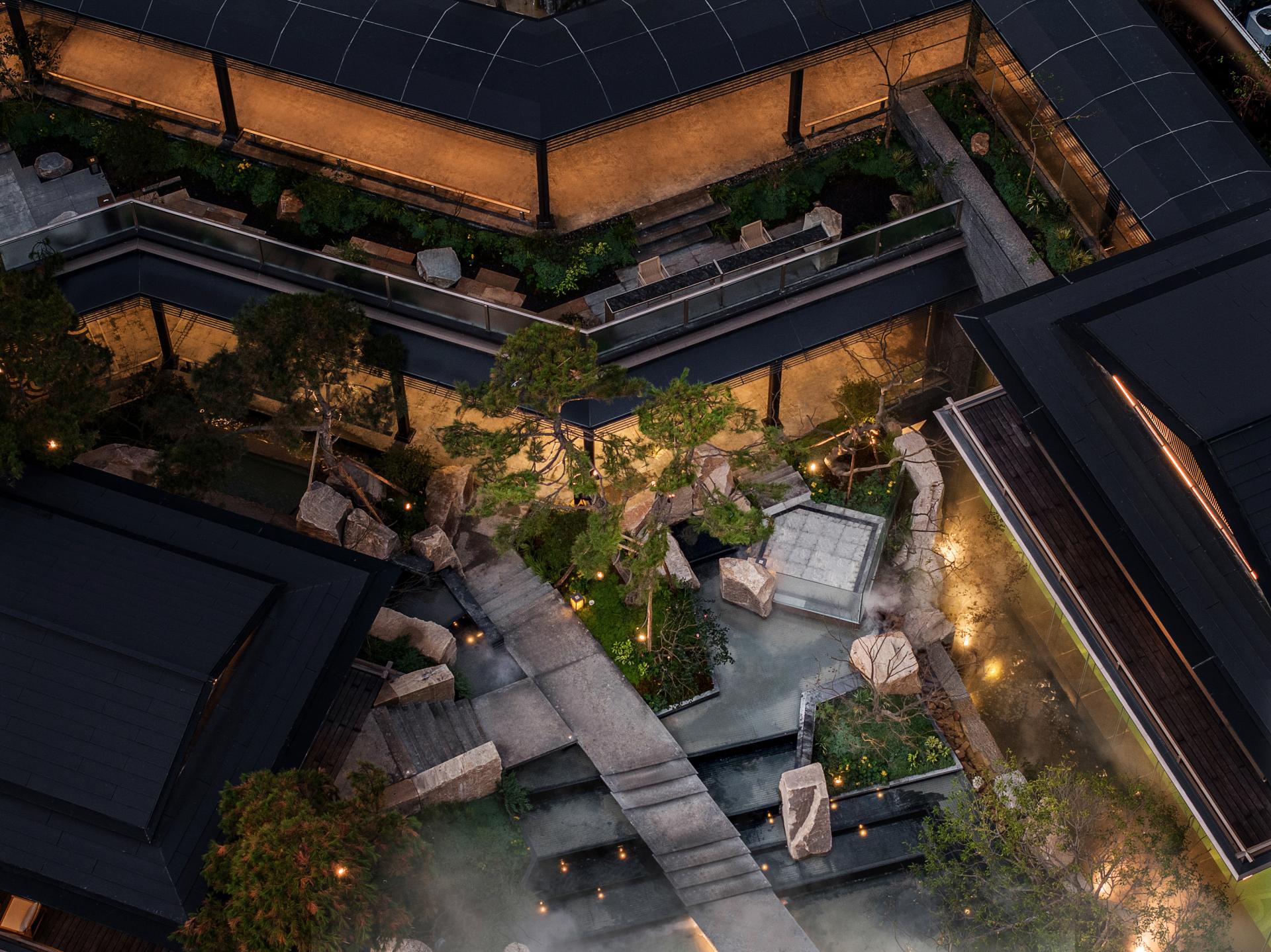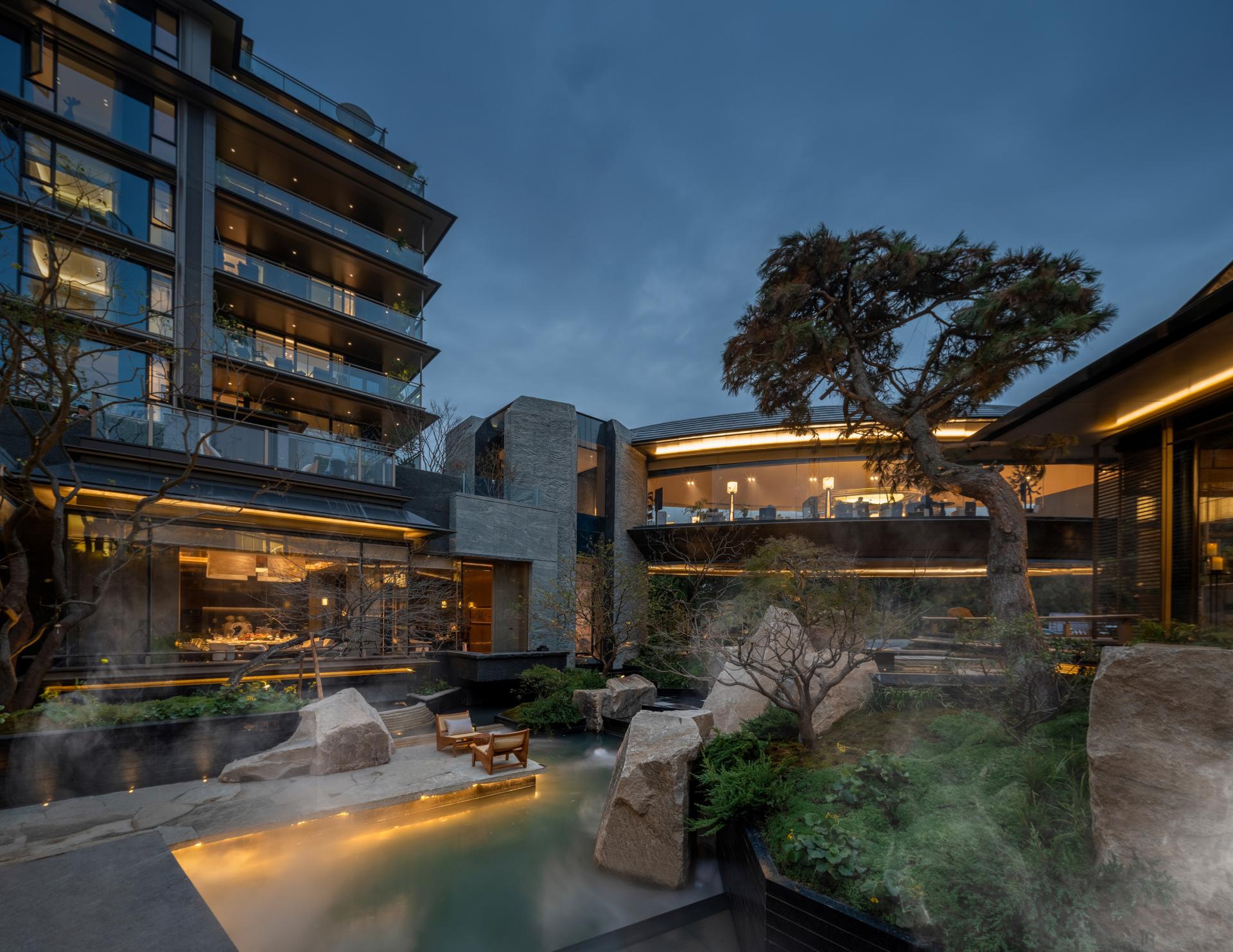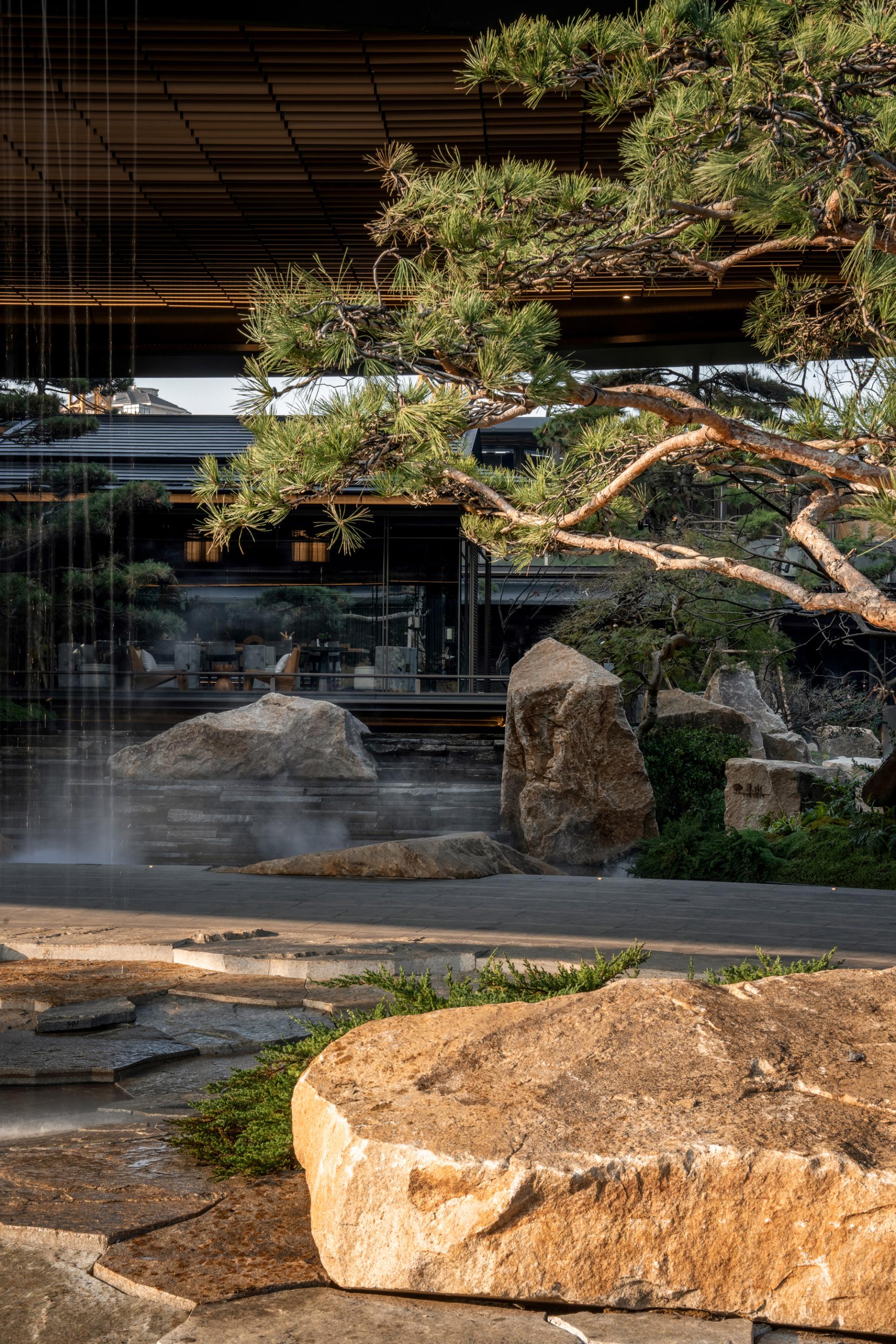 Taking advantage of the topographical elevation differences, the central water courtyard is designed after the Zhan Garden in Nanjing, using rock walls, springs, waterfalls, stepping stones, streams, and bridges as its framework. The water system is used to lay out the base tone of the water courtyard, constructing a three-dimensional landscape painting that evokes the charm of living amidst mountains and forests. A tea pavilion stands atop cascading waters, and sitting in it, you can enjoy a garden of mountains and waters, and enjoy the charm of natural scenery.