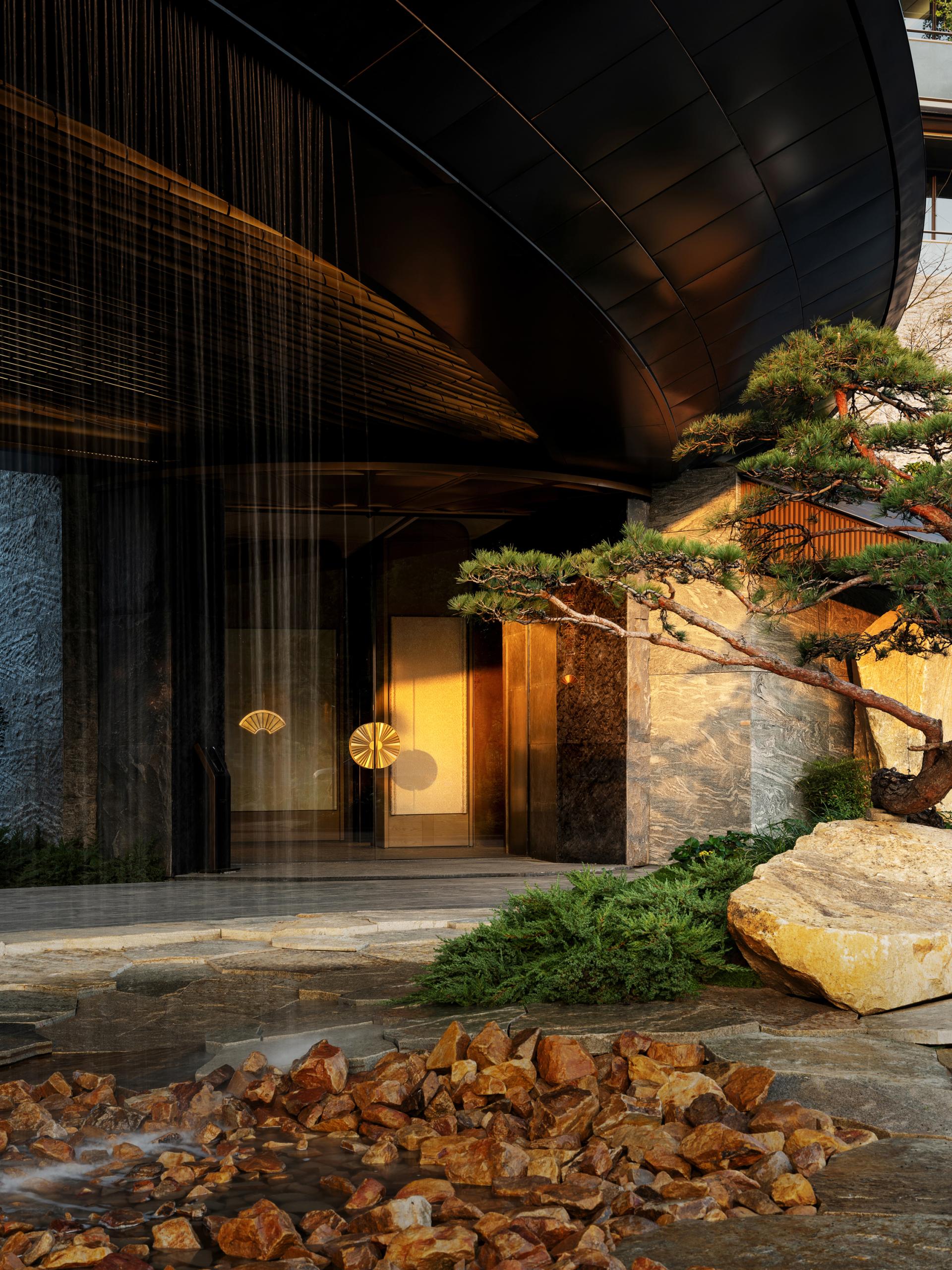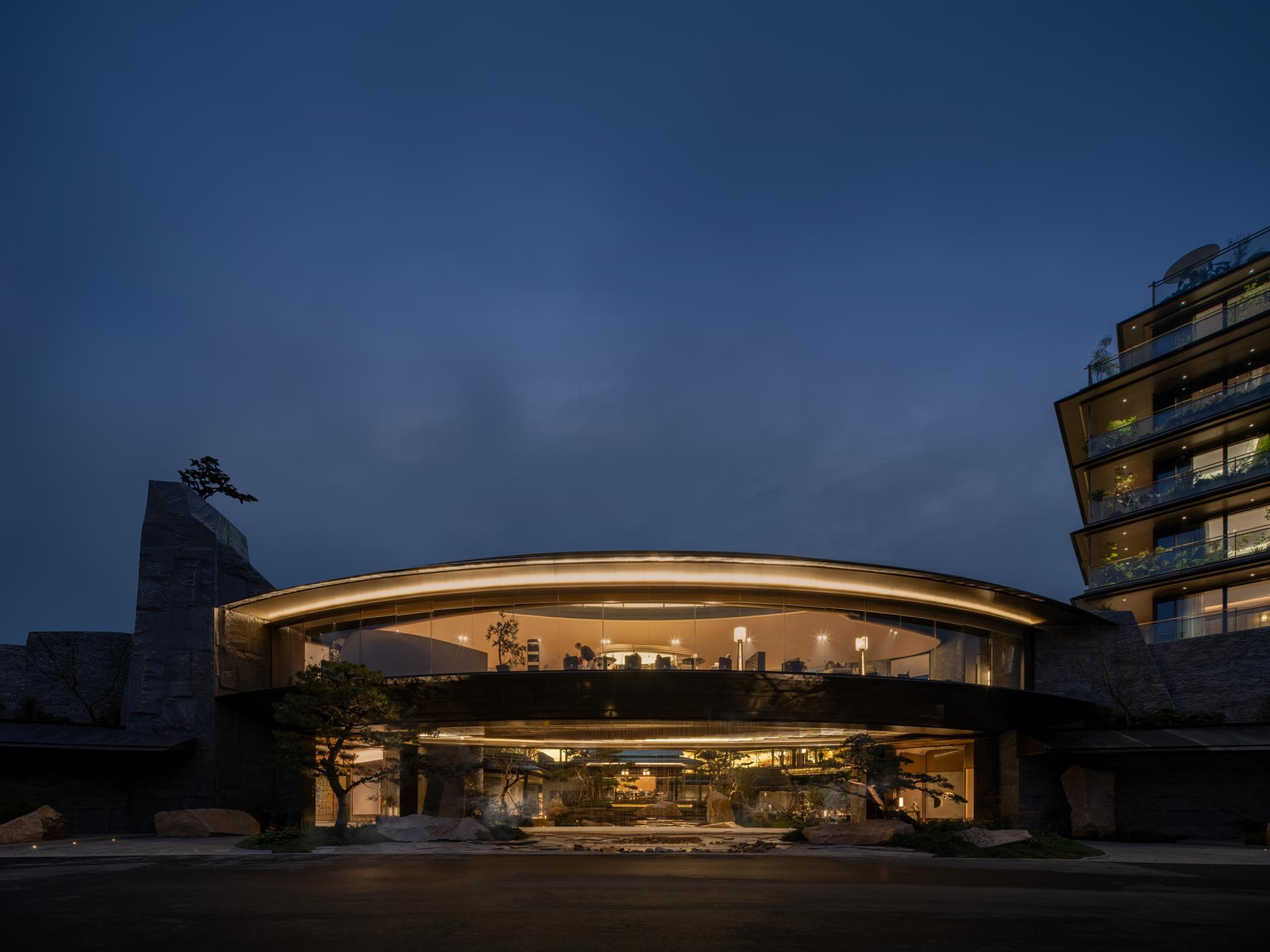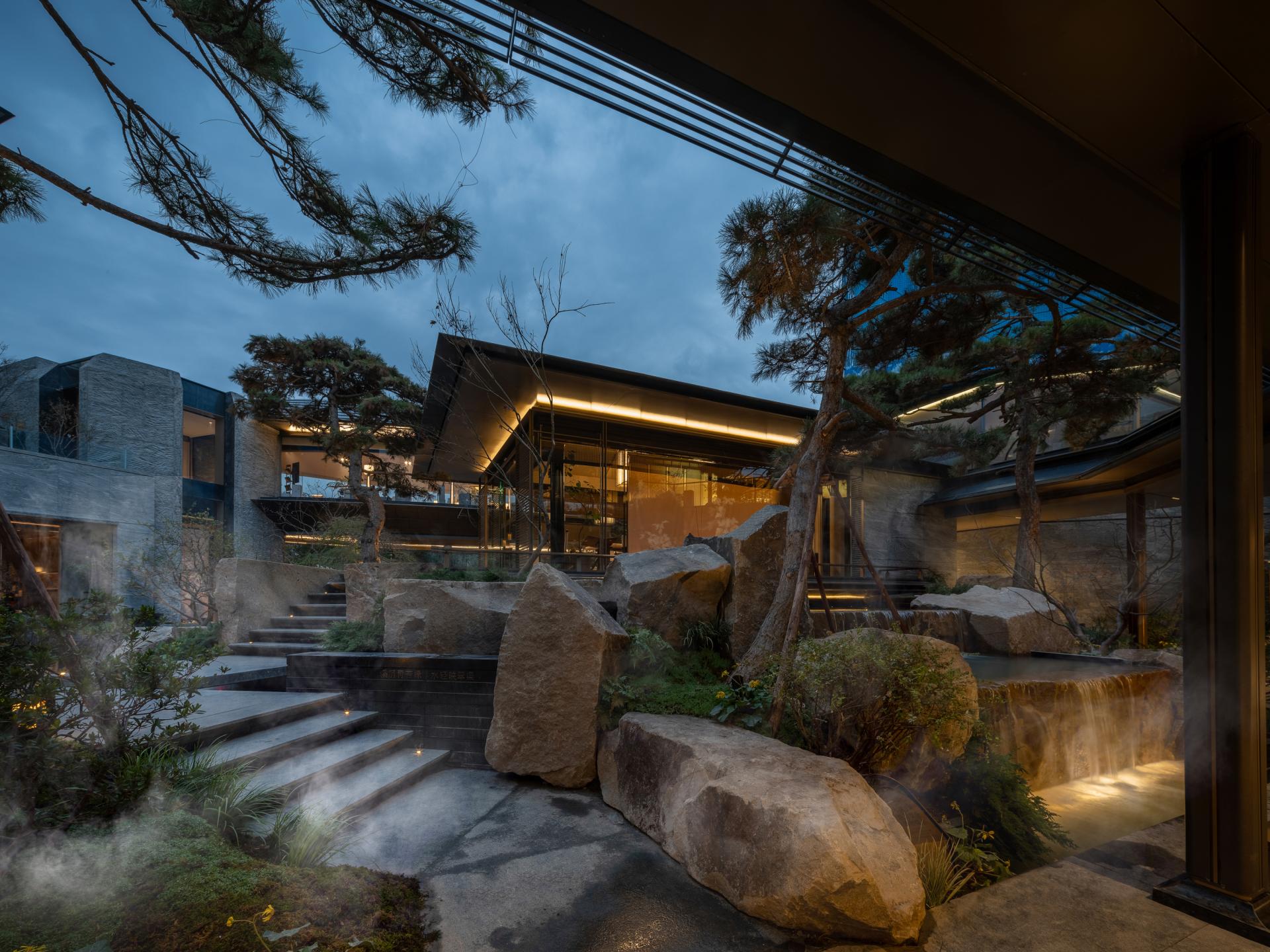 The main entrance features a curved, fan-like structure spanning approximately 35 meters, serving as an aerial arrival hall that offers panoramic views of both the interior and exterior landscapes of the community. On either side, the cliffs are connected with scenic walls, with pines perched atop the cliffs. Beneath a pavilion, a gentle waterfall cascades down, while pines and rocks greet visitors, and the waterfall collects in a pebble beach. Through the misty waterfall, the view of the rear water courtyard is faintly visible, shrouded in water vapor, creating a picturesque scene reminiscent of a misty rain painting.