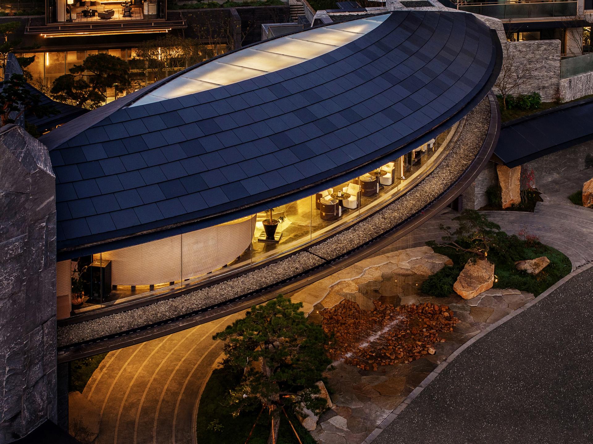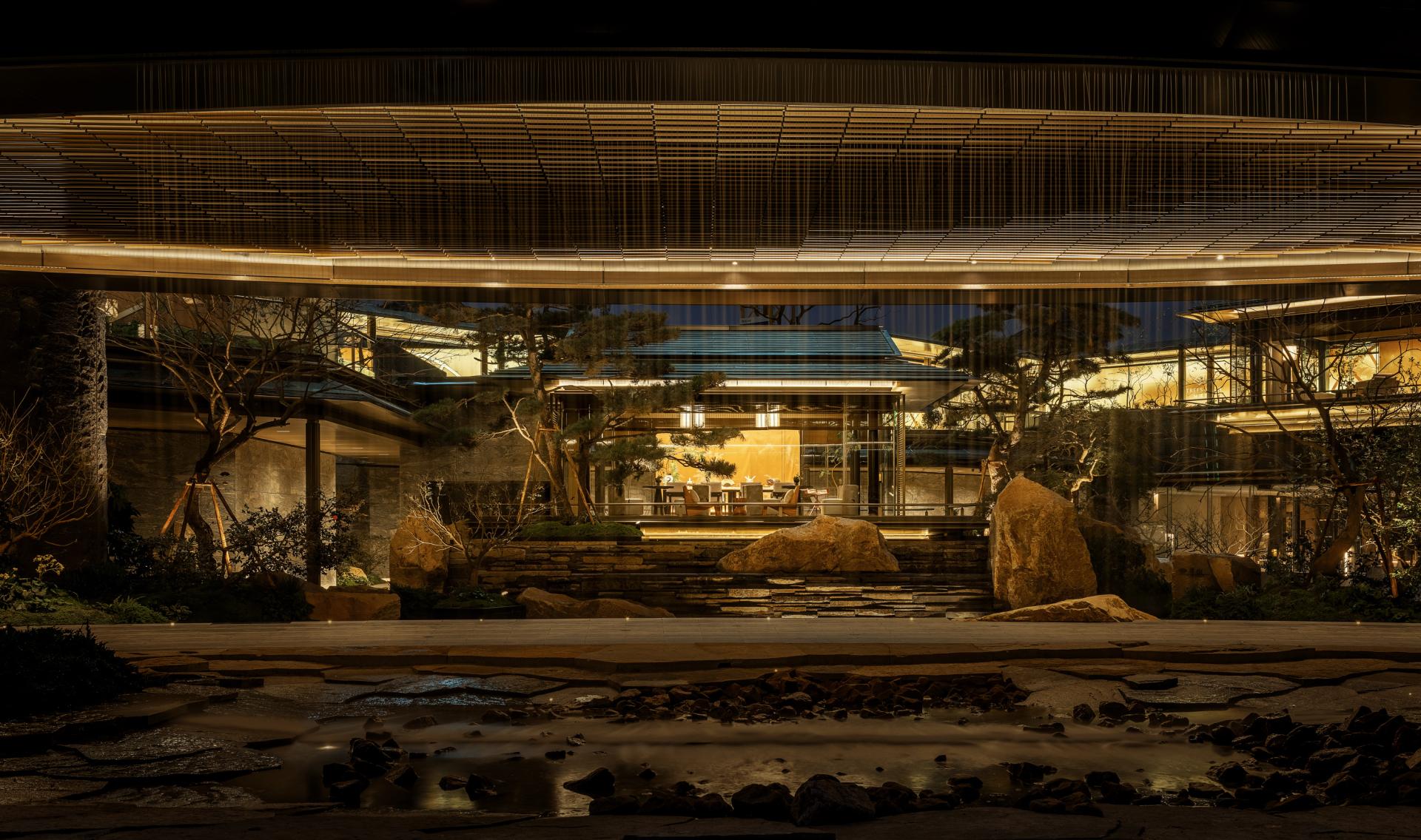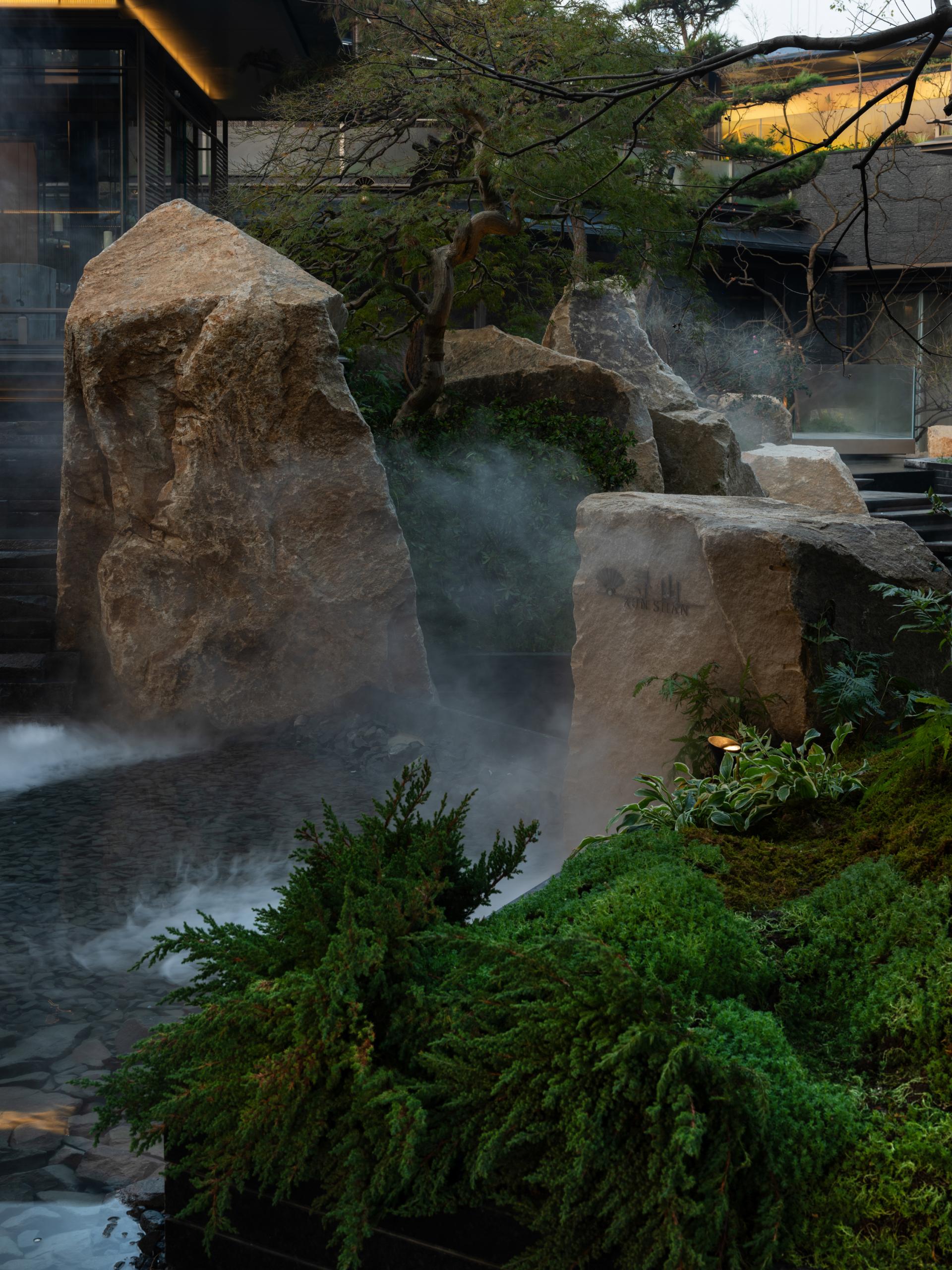 The main entrance features a curved, fan-like structure spanning approximately 35 meters, serving as an aerial arrival hall that offers panoramic views of both the interior and exterior landscapes of the community. On either side, the cliffs are connected with scenic walls, with pines perched atop the cliffs. Beneath a pavilion, a gentle waterfall cascades down, while pines and rocks greet visitors, and the waterfall collects in a pebble beach. Through the misty waterfall, the view of the rear water courtyard is faintly visible, shrouded in water vapor, creating a picturesque scene reminiscent of a misty rain painting.