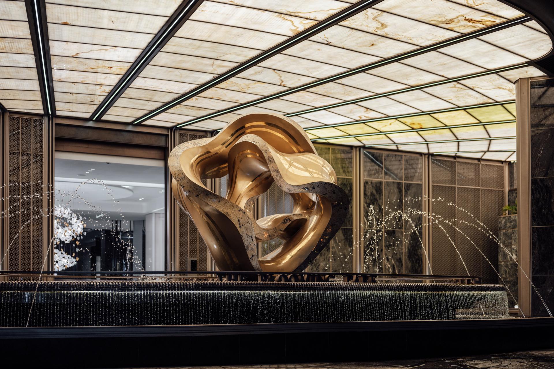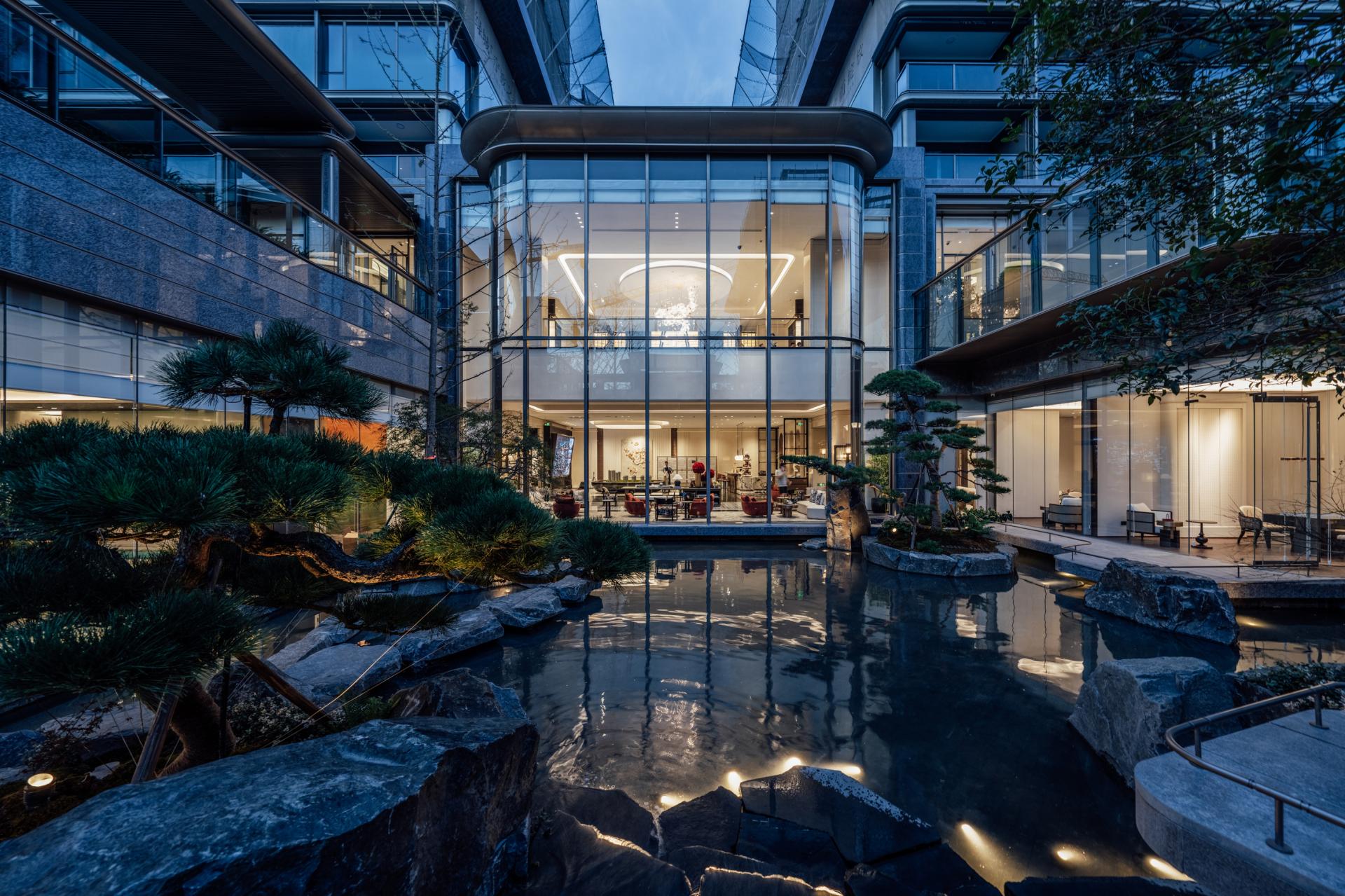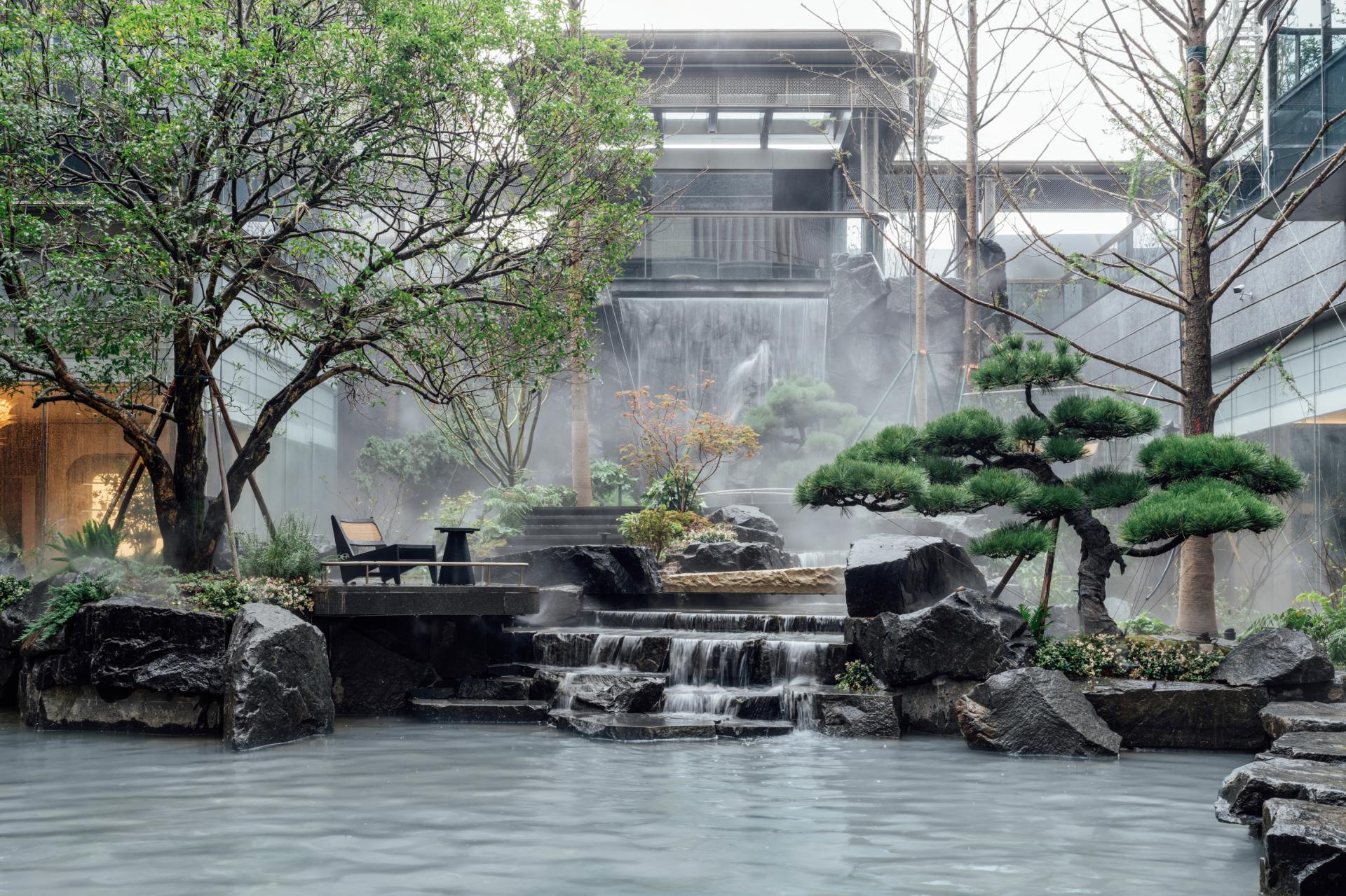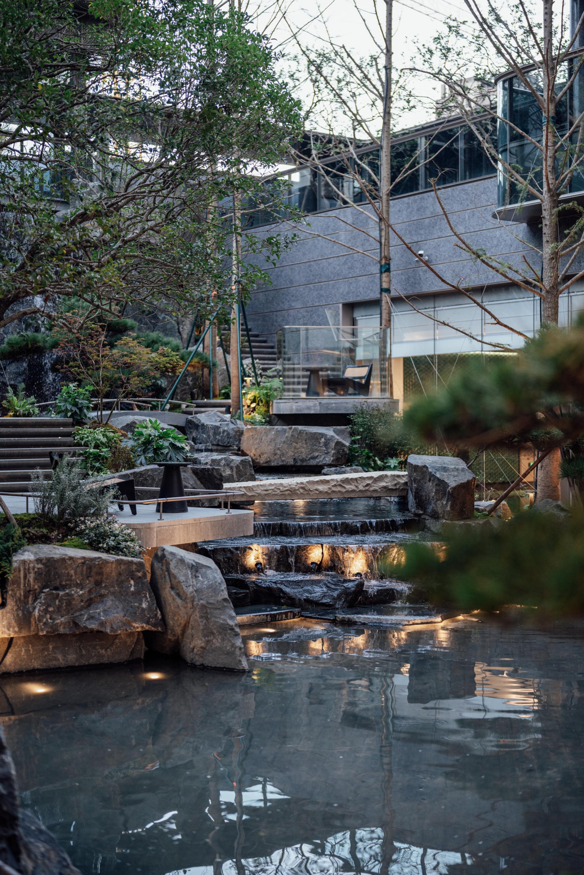 The nearly 60-meter-wide entrance facade is grand and majestic, inspired by Ningbo's city flower, the camellia. The petal-shaped architectural gateway and the central water feature complement each other, creating a main interface with tremendous aesthetic appeal and visual impact. On both sides of the gateway, three-dimensional cascading waterfalls stretch horizontally, framed by century-old osmanthus trees, together forming a modern landscape scroll. Through the integration and stacking of mountains, water, stones, and trees, the design delivers a strong visual impact in various forms, constructing a natural-style three-dimensional courtyard that hides within the city. Taking advantage of the terrain, rich elevation differences are set in the sunken space. An exhilarating waterfall cascades from the bottom of the upper landscape pavilion, flowing through multiple levels before converging into the Moon Lake. Paths wind through the forest, and small bridges span the cascading water, enriching the garden exploration route. Clusters of old osmanthus trees canopy over the cantilevered viewing platform, creating an independent woodland realm. Above the sunken courtyard, a delicate and serene terrace garden is constructed. Various forms of rest spaces are incorporated into the space, presenting scenes where nature and life harmoniously coexist.