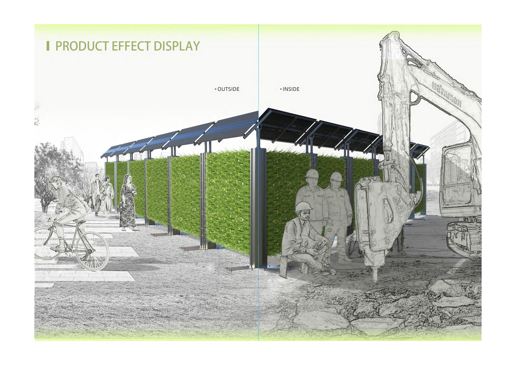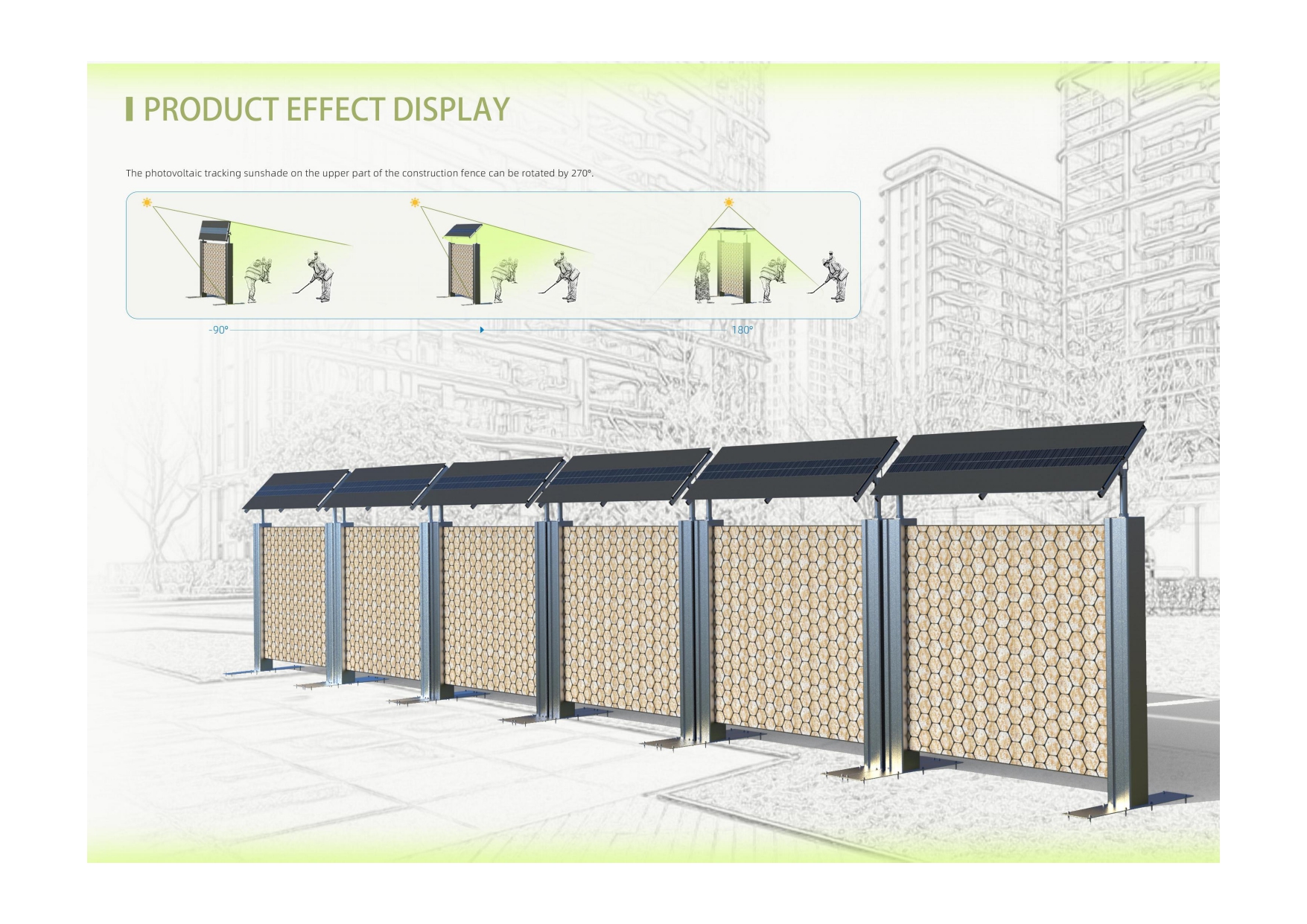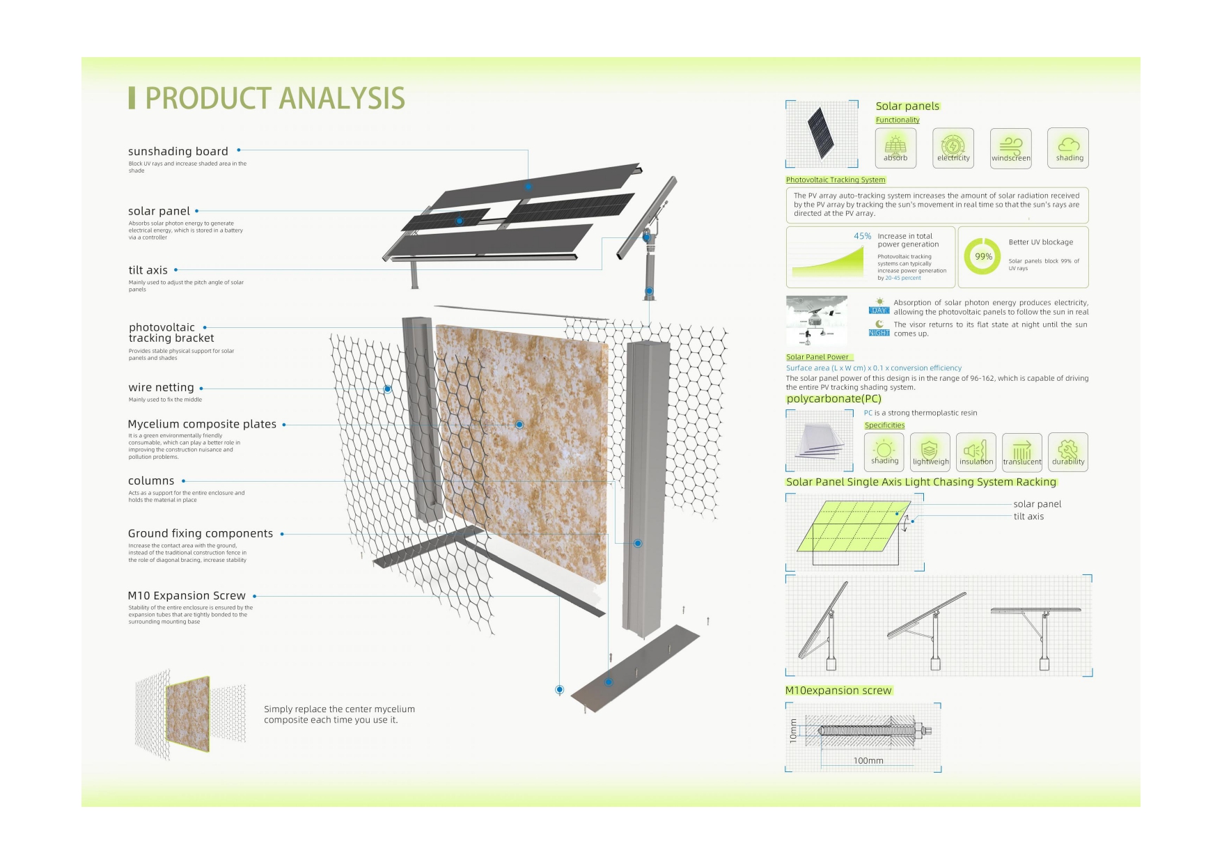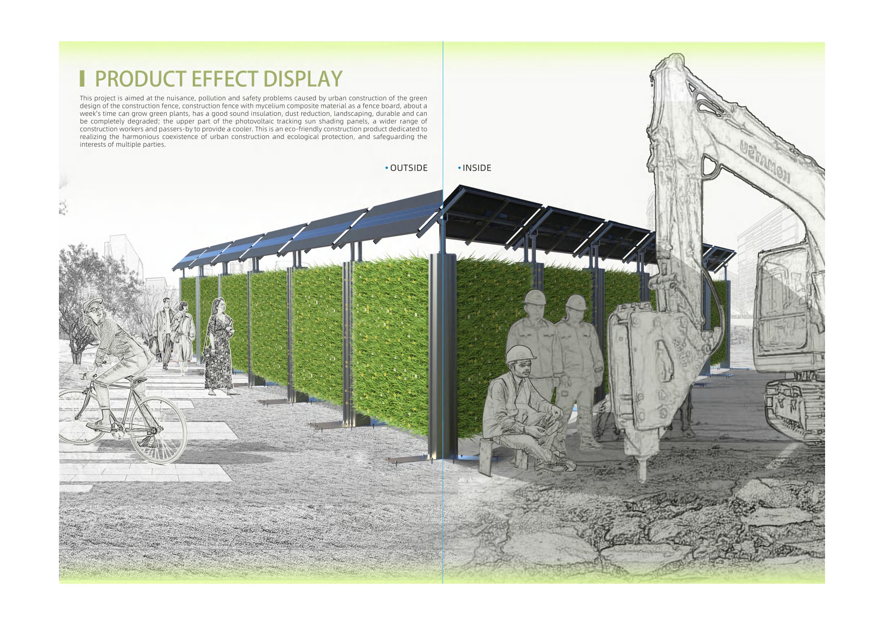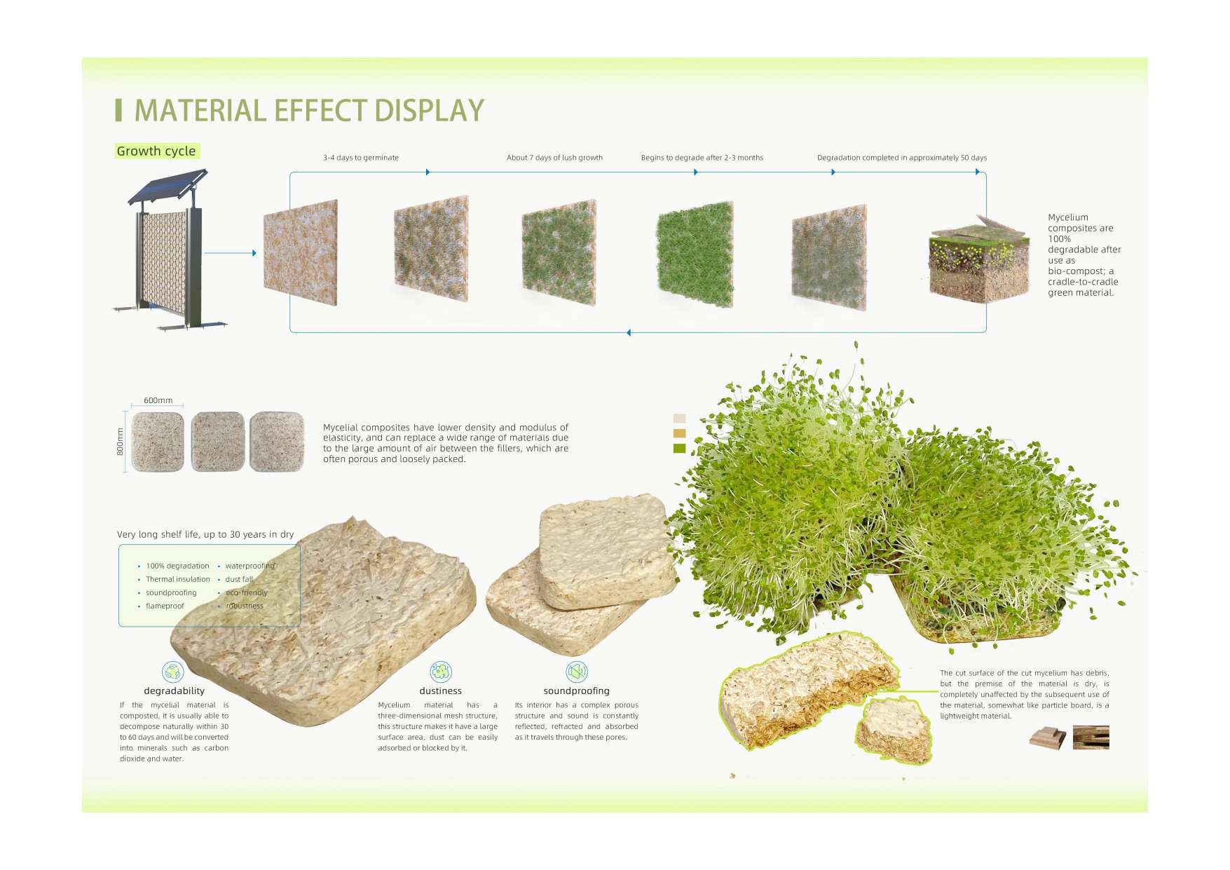 With the rapid development of urban construction, the amount of urban construction has increased dramatically, and it is common to see multiple construction hoardings with long construction periods, resulting in the destruction and pollution of the urban environment, inconvenience to nearby residents and even affecting the psychology of the residents. This leads to urban construction in the improvement of urban infrastructure at the same time but by people's resentment. This construction enclosure uses mycelium composite material as the enclosure board, which is committed to realizing the harmonious symbiosis between urban construction and ecological protection. Material, after experiments, planted seeds on the mycelium fence board about a week's time can grow lush green plants, with better sound insulation, dust reduction, landscaping effect, and mycelium composite material itself has good mechanical properties, durable, effective isolation of the construction area, to protect the safety of the construction and the surrounding order, while mycelium composite material in the end of the construction of biodegradation, each time you use only need to replace the middle of the mycelium composite material as a fence board. Each time it is used, only the middle mycelium barrier plate needs to be replaced, avoiding the problem of construction waste after the removal of traditional barriers; functionally, the upper part of the construction barrier is equipped with solar-powered photovoltaic tracking shading panels, which provides a greater range of construction workers and passers-by with coolness.