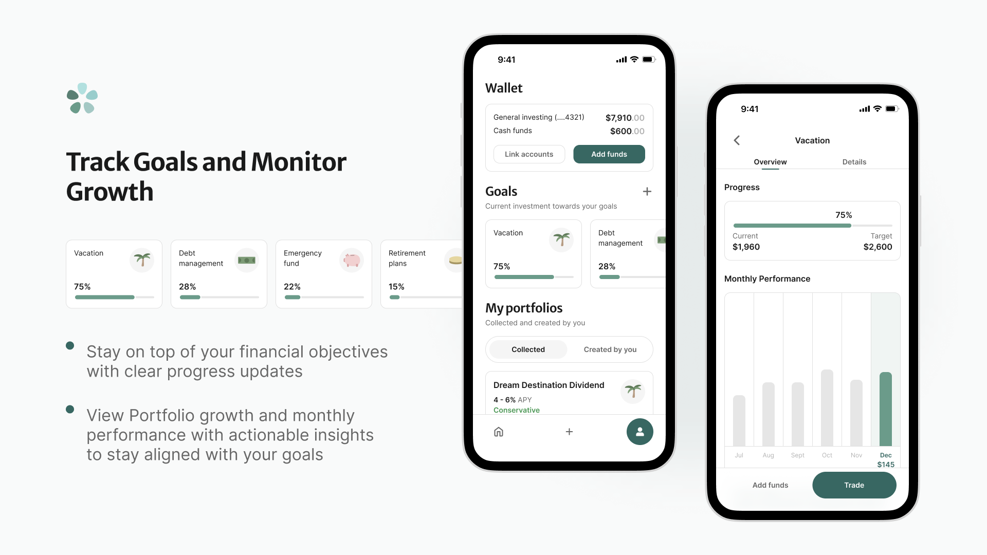 We designed holistic, end-to-end user flows with unique features. We crafted a clean, professional look and feel in both light and dark mode to make the experience delightful and seamless. From selecting a stock to evaluating the total projected value, we considered every step of the user experience to enhance the impact of their financial decisions with informed insights and confidence.