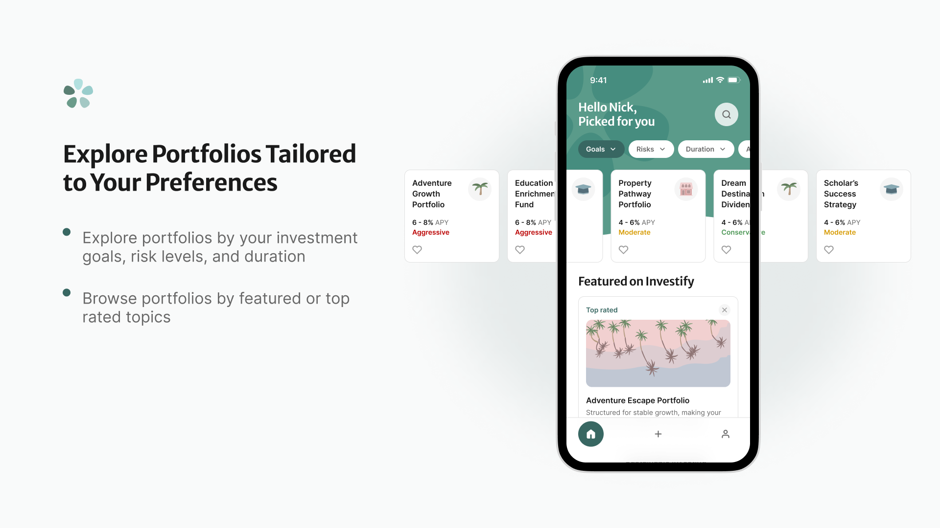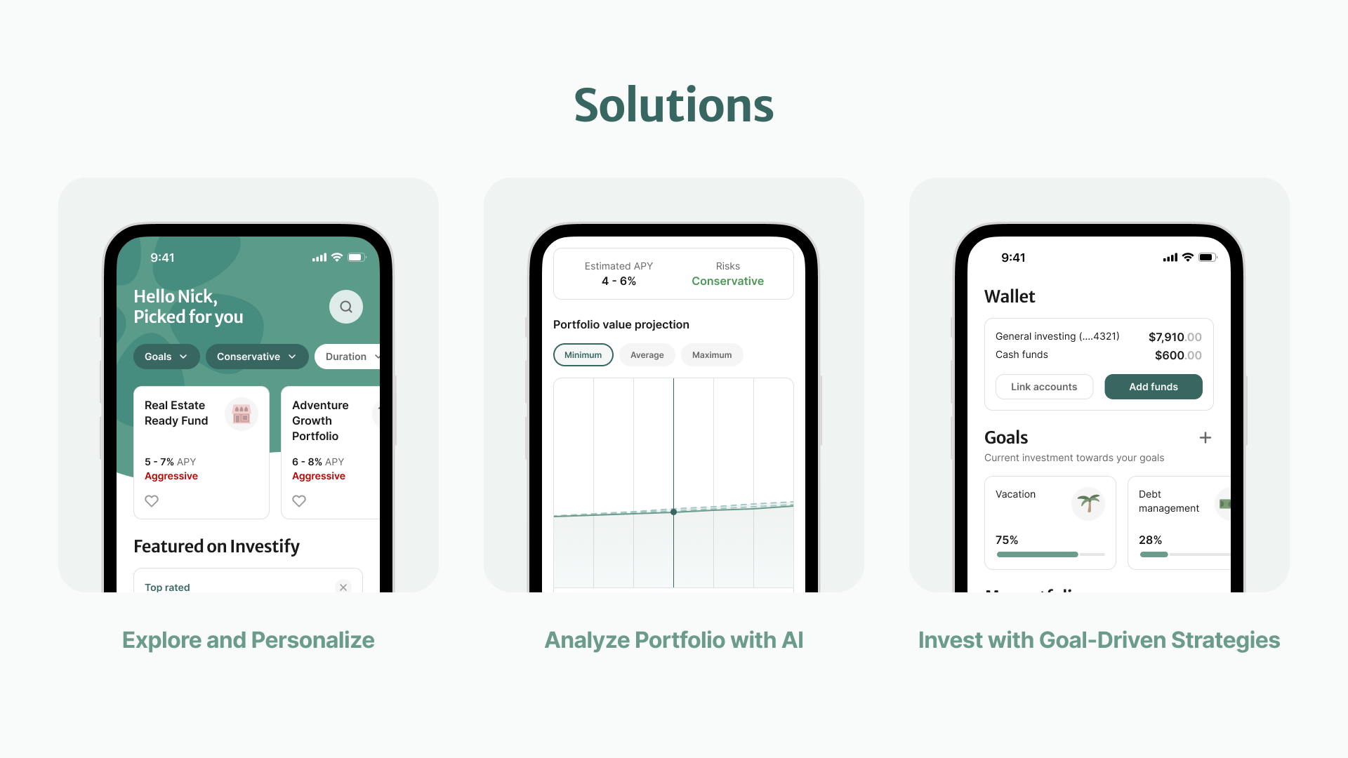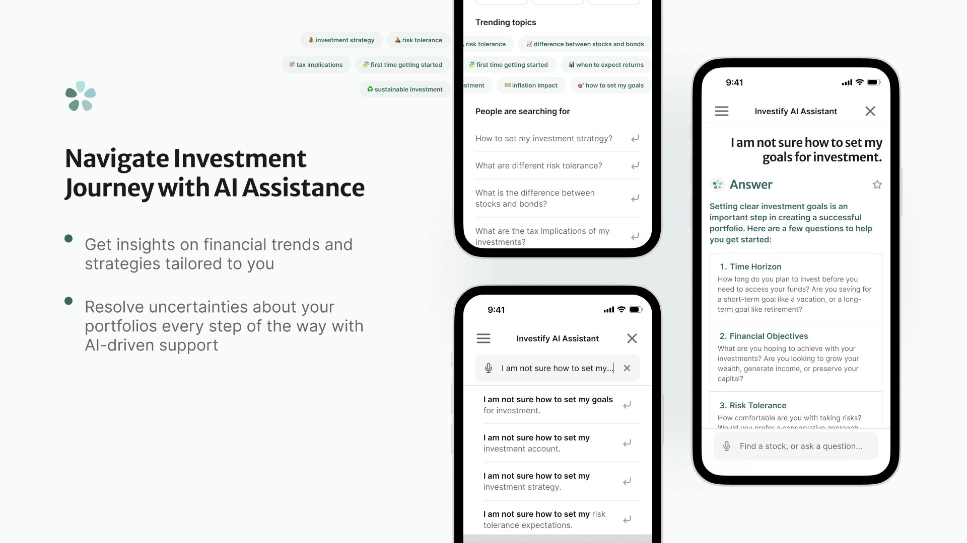Our design approach focuses on creating an intuitive, accessible, and engaging mobile experience. The user-friendly interface removes barriers for investors to offer clear guidance at every stage of their financial journey. AI-powered analysis provides recommendations, while continuous support from an integrated AI assistant ensures users feel supported and informed. With Investify.ai, building a portfolio is straightforward, empowering, and effective.