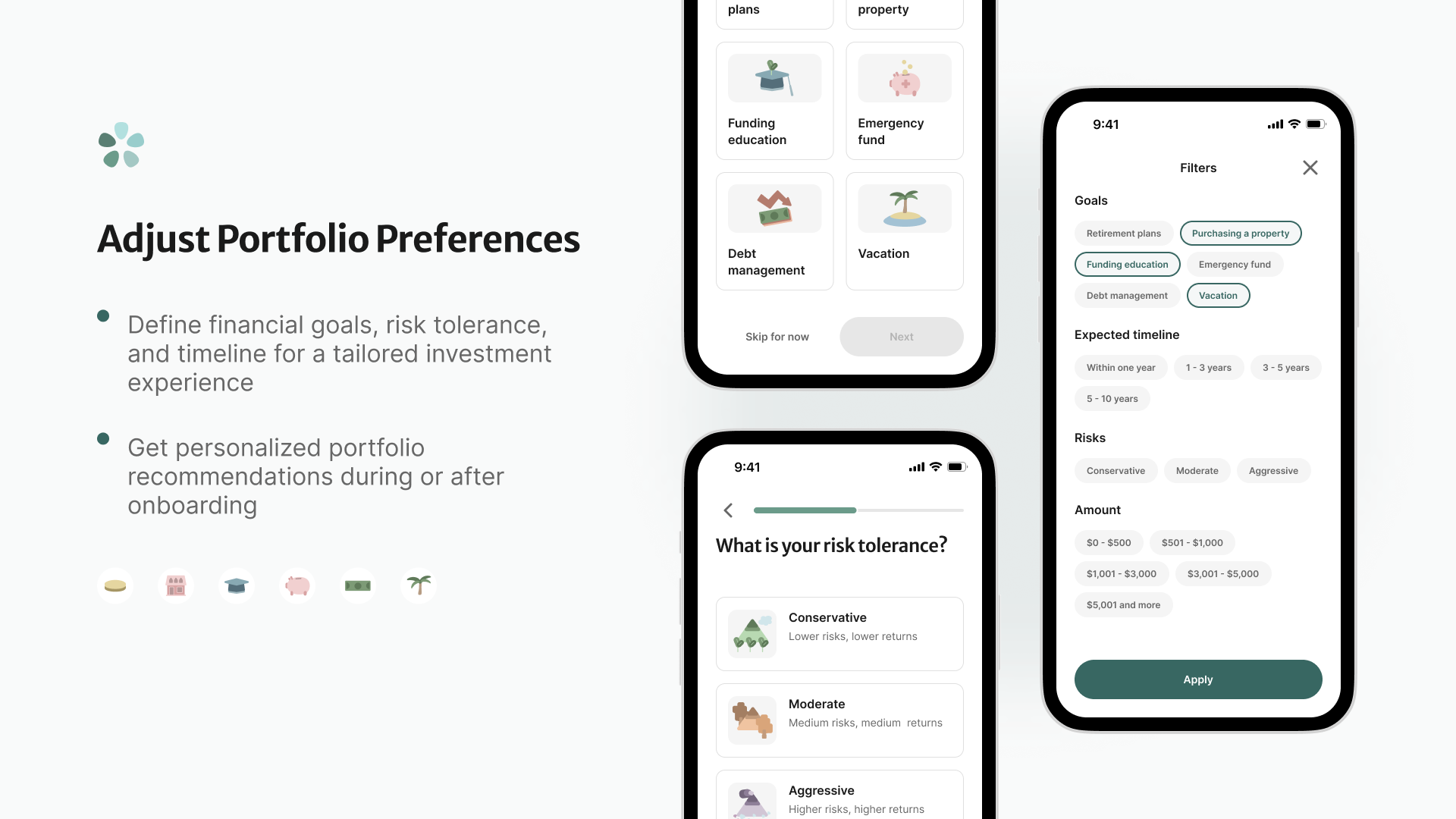 Based on our experience in the financial services industry, mobile users often feel frustrated by the lack of option to personalize their preferences throughout the experience. Users also feel confused by overwhelming investment products, particularly when starting to build a portfolio, making it difficult to optimize their next best action.