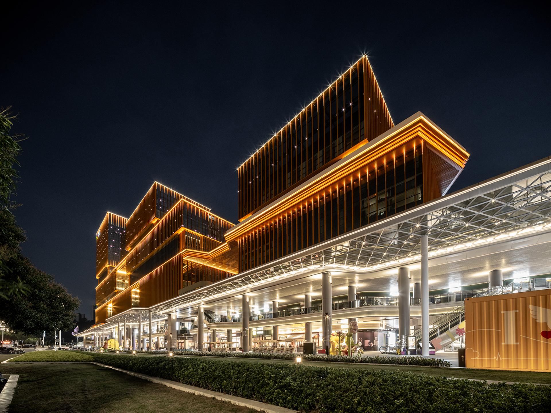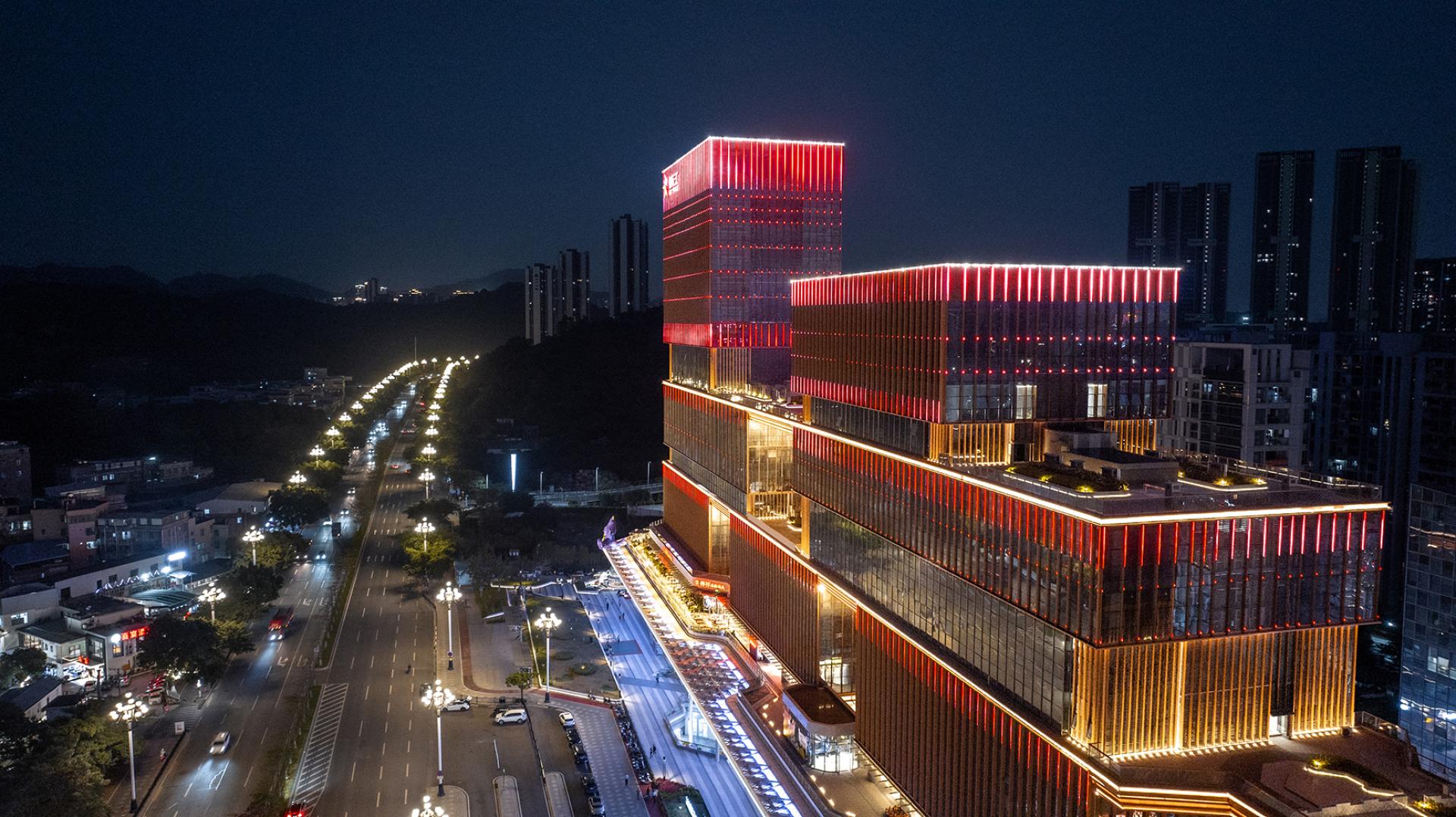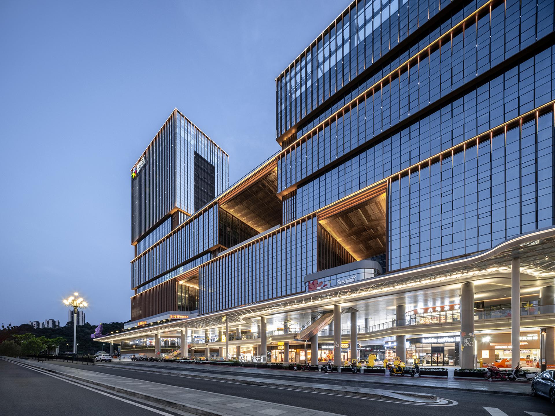 The façade’s minimalist design uses stacked “box” structures and terraced platforms, creating a rhythmic yet modern urban aesthetic. Advanced LED technology enhances the interplay of light and architecture, utilizing embedded spotlights, linear accents, and vertical lighting to highlight the building’s contours. The design carefully balances function and artistry with dynamic lighting tones—4000K for building exteriors and 3000K for pedestrian spaces—ensuring a vibrant yet inviting atmosphere.
