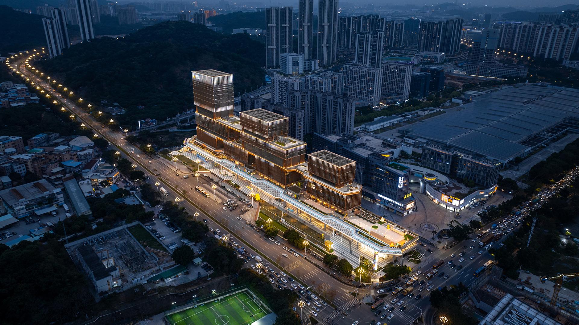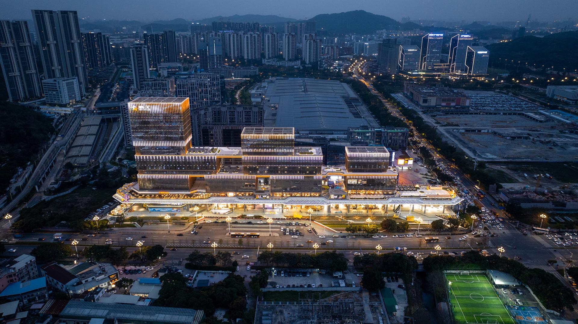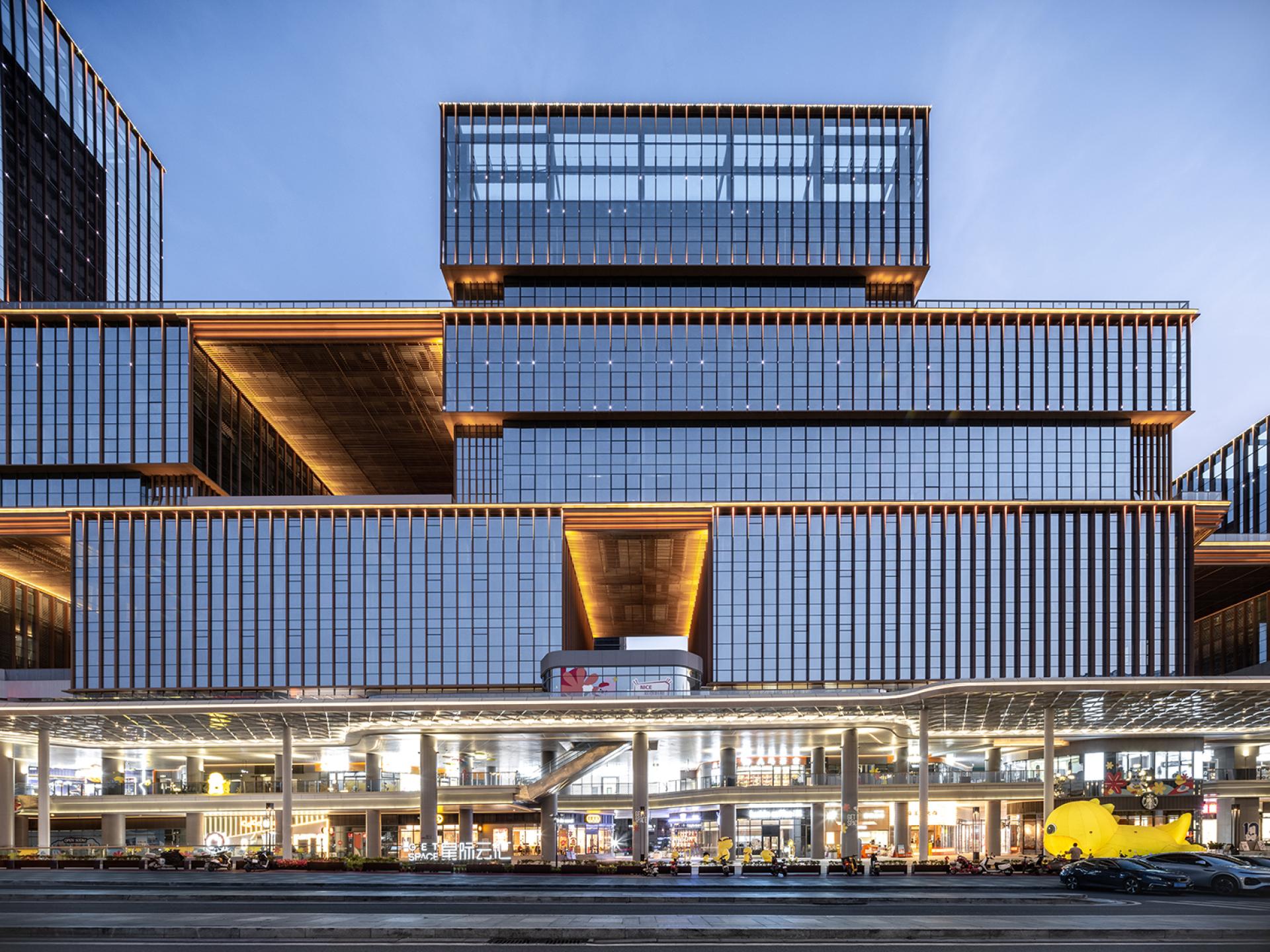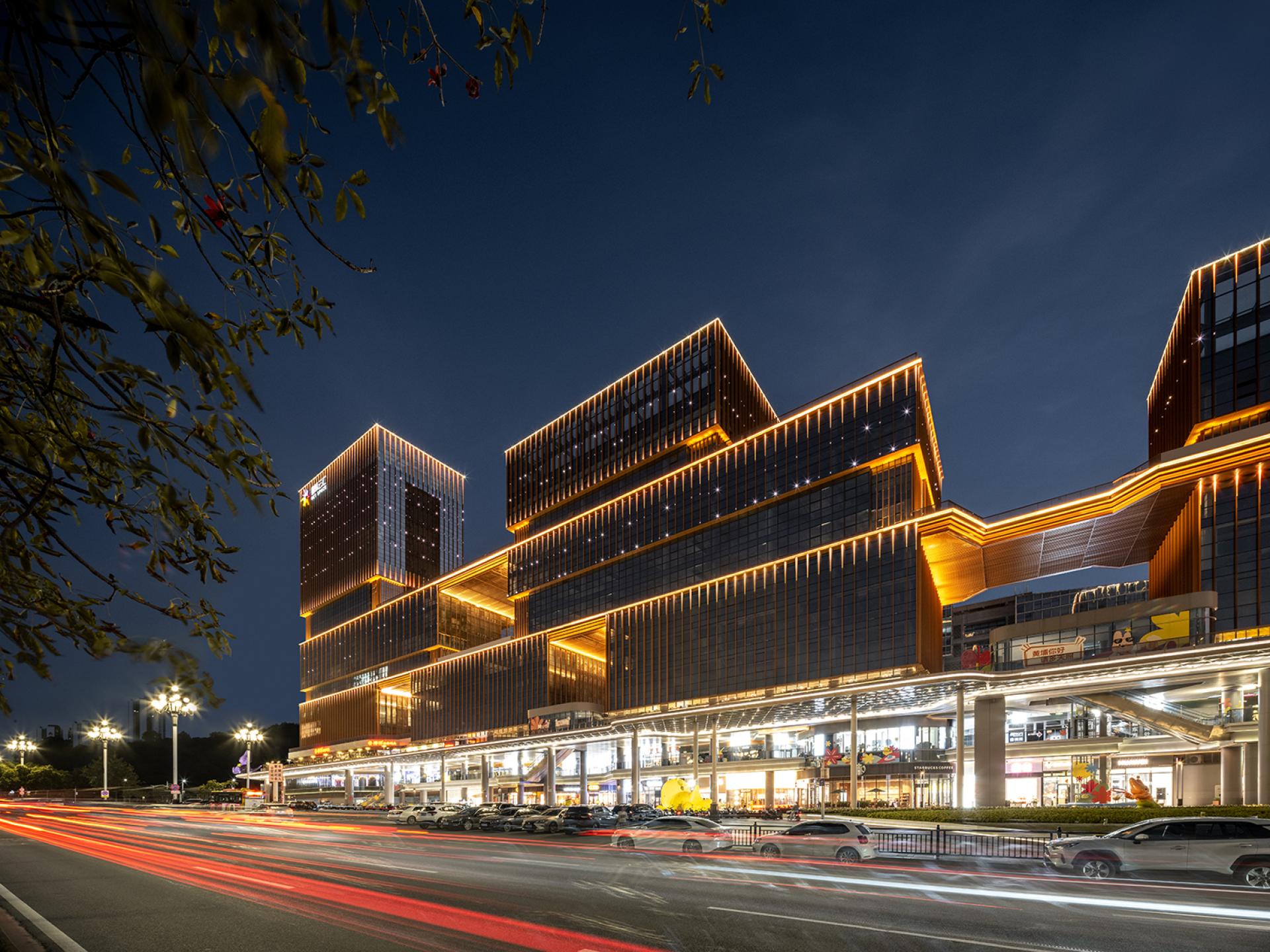 The façade’s minimalist design uses stacked “box” structures and terraced platforms, creating a rhythmic yet modern urban aesthetic. Advanced LED technology enhances the interplay of light and architecture, utilizing embedded spotlights, linear accents, and vertical lighting to highlight the building’s contours. The design carefully balances function and artistry with dynamic lighting tones—4000K for building exteriors and 3000K for pedestrian spaces—ensuring a vibrant yet inviting atmosphere.