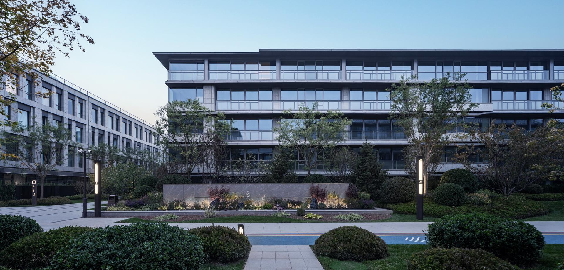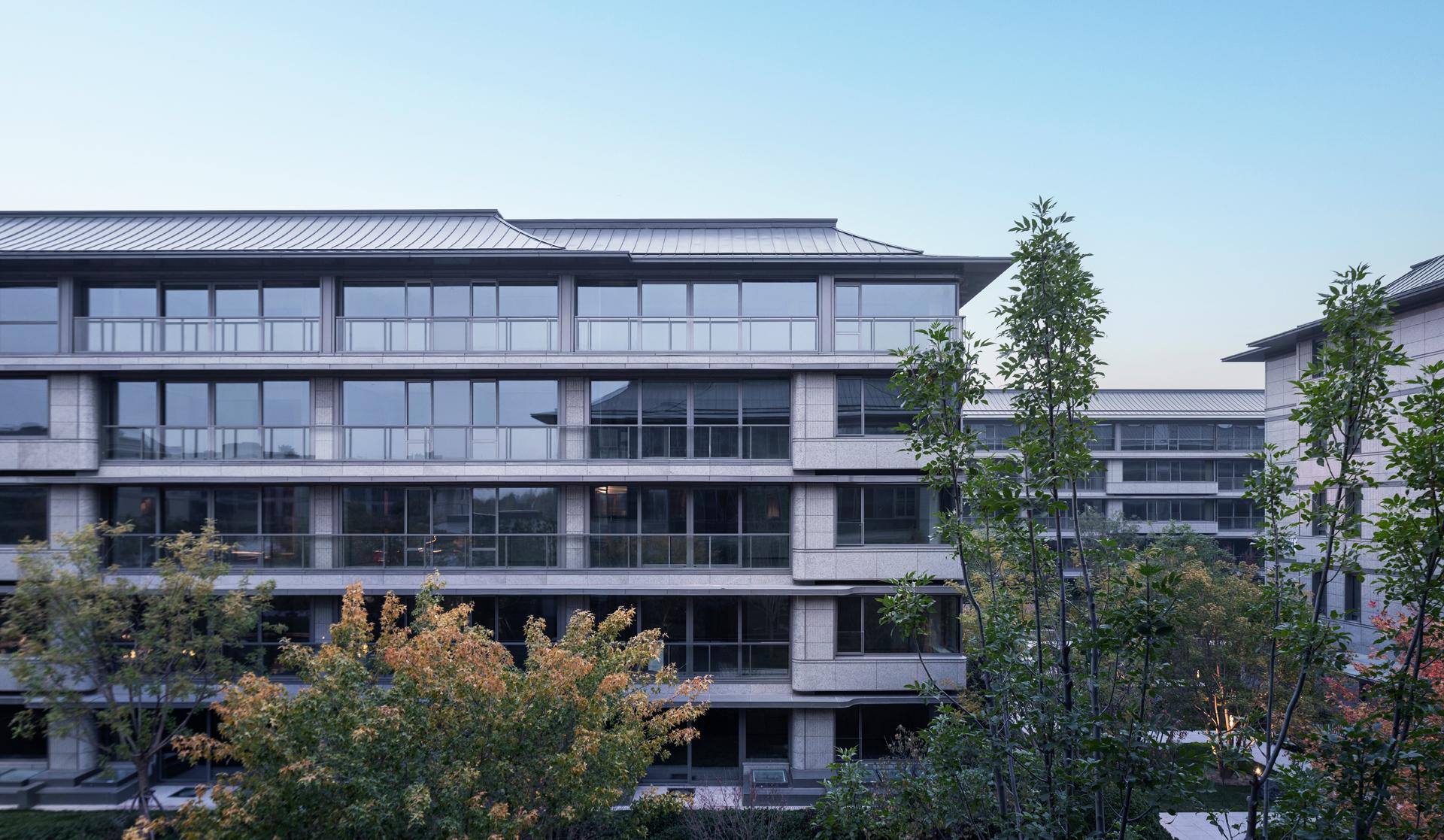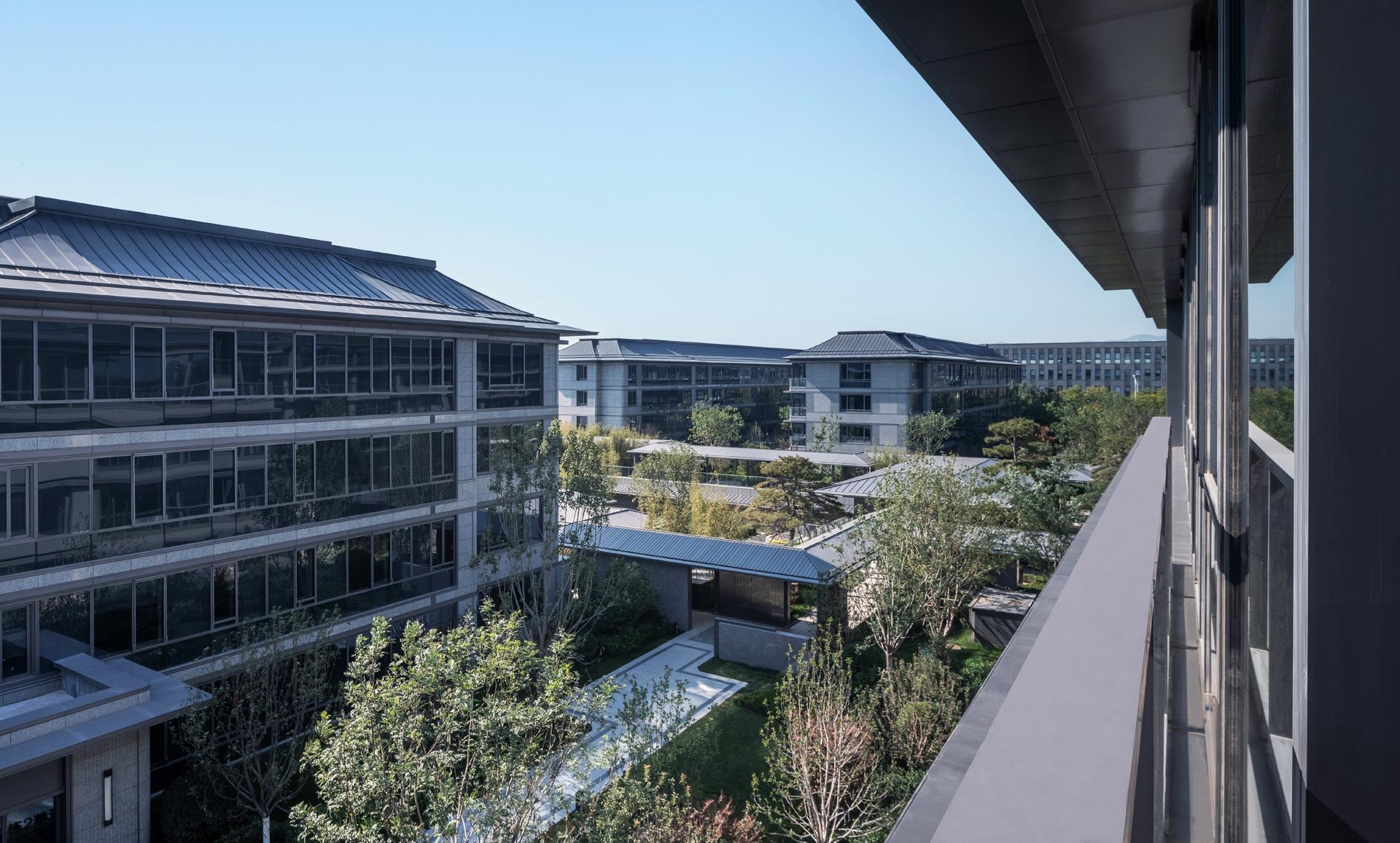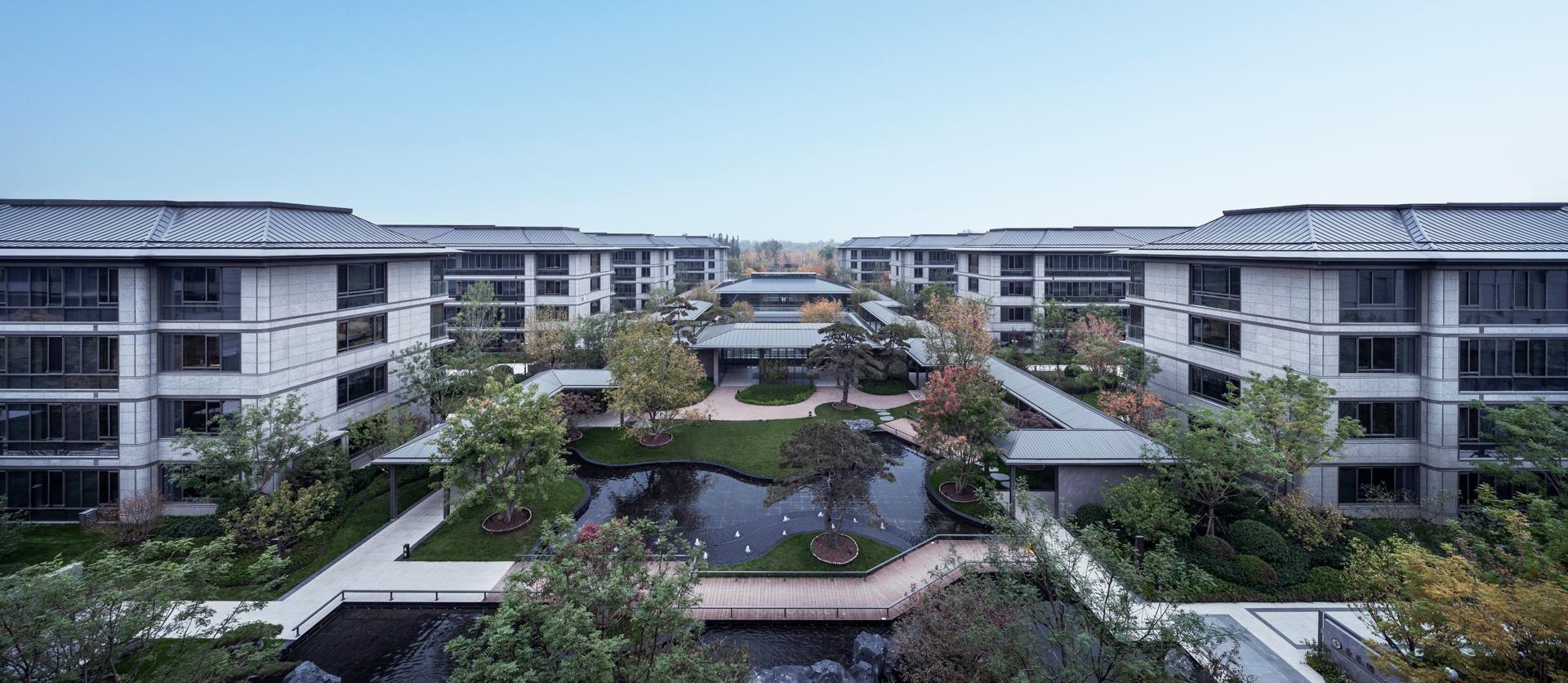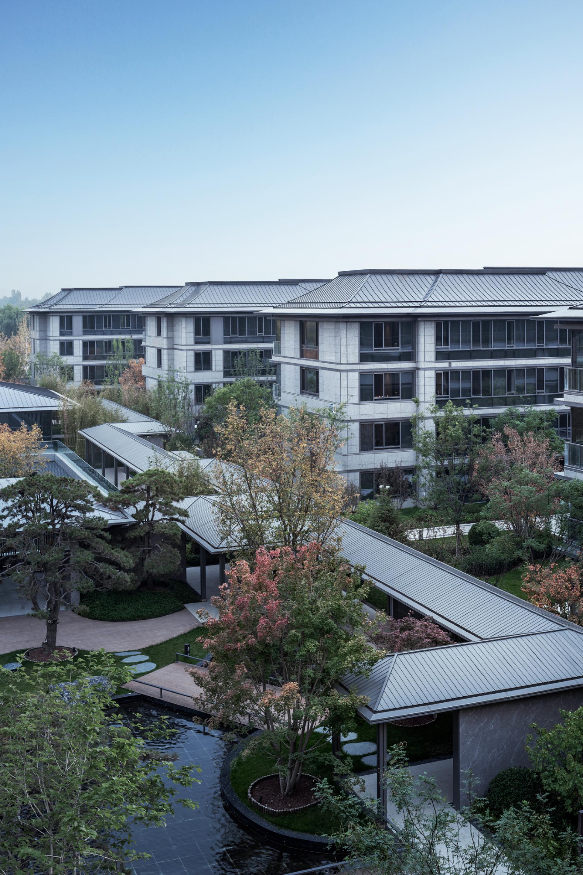 The Old Summer Palace One project sits 800 meters north of Beijing's Yuanmingyuan Park, nestled within the Three Mountains and Five Gardens Greenway and Hadian District’s Zhongguancun, often referred to as China’s Silicon Valley, where culture and technology converge. The original concept behind the design was to create a residence within the mountain gardens, paying homage to Beijing's century-old tradition of mountainous retreats. This reverence for nature was woven into every aspect of the design process, from site selection and modelling to landscaping and construction. After numerous simulations and comparisons, considering factors such as sunlight exposure, unit width, landscape resources, and land value, the plan opted to enclose the area with slab buildings along the north and south sides. This arrangement emphasizes a north-south axis, originating from the southern entrance. The central garden axis, stretching 170 meters long and comprising three courtyard sections, expands the central garden, creating a serene atmosphere. By differentiating the main axis facing south and the secondary axis facing north, the buildings seamlessly blend into the garden environment. Inspired by ancient Chinese architectural wisdom found in texts like "Yingzao Fashi," the facade design meticulously refines traditional roof techniques. At the same time, modern materials such as stone and glass are used to craft an elegant and transparent architectural volume, delicately poised as if floating above the forest canopy.