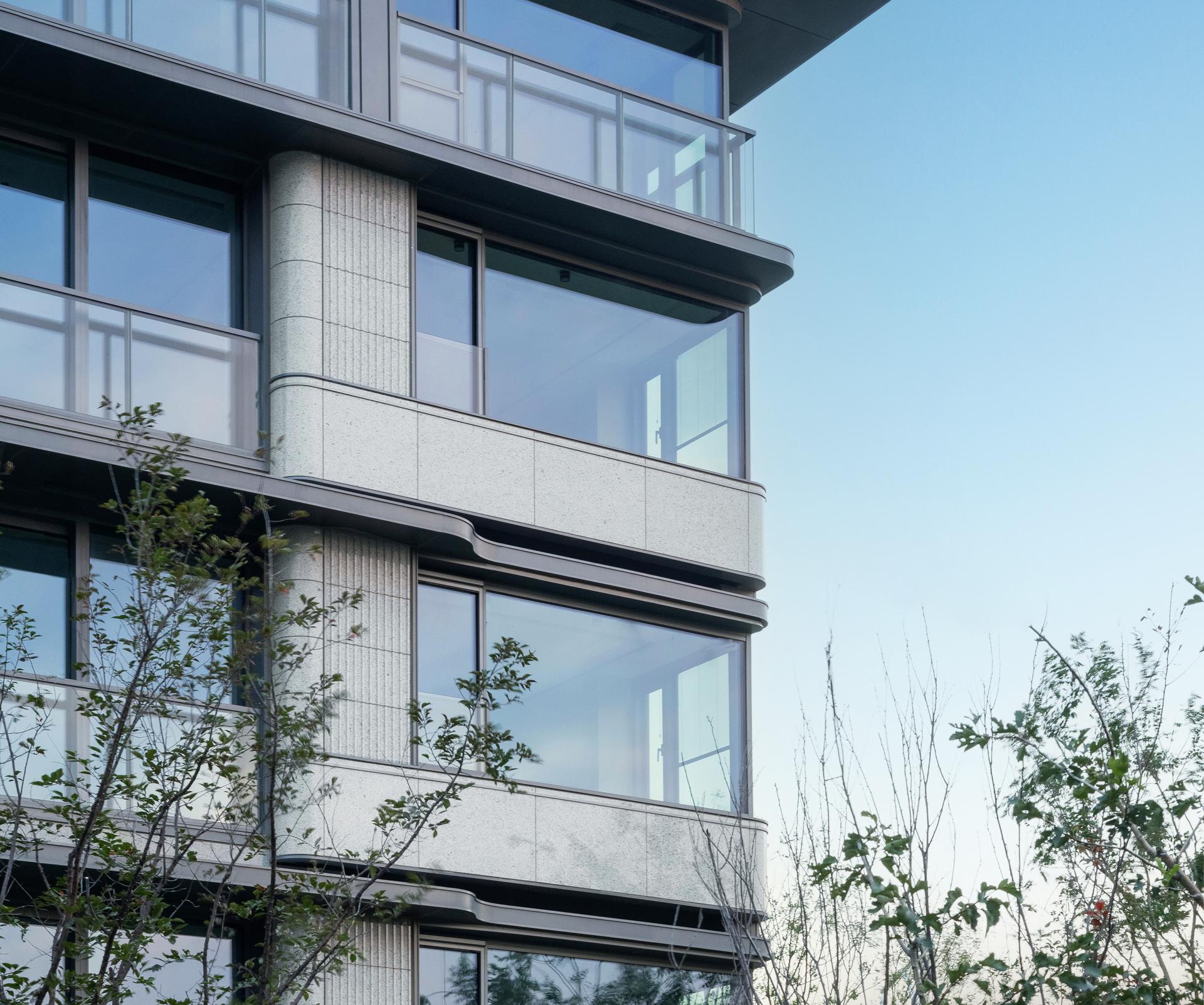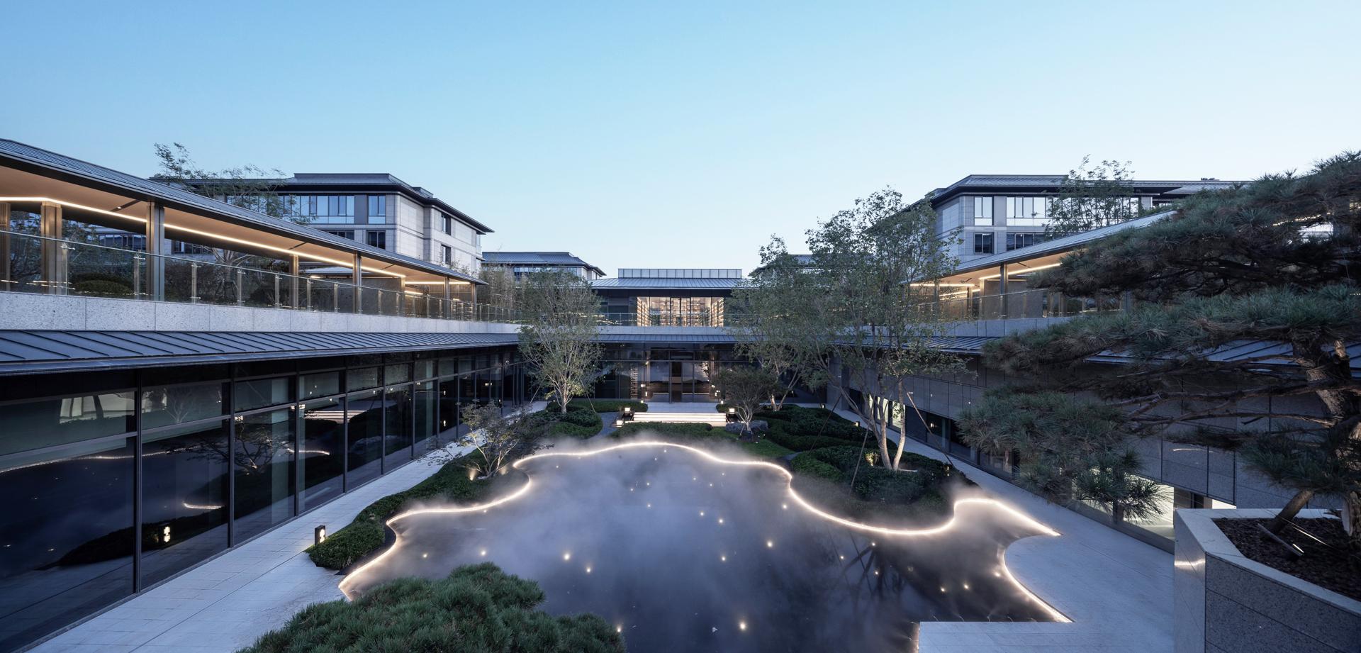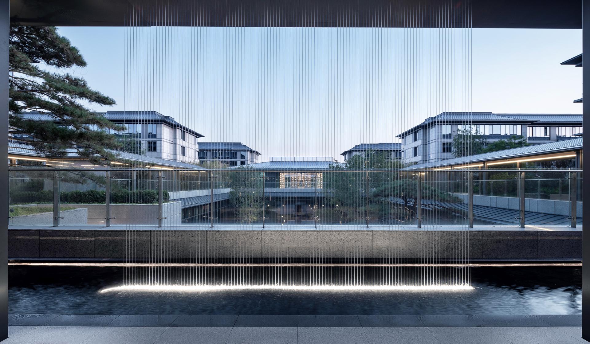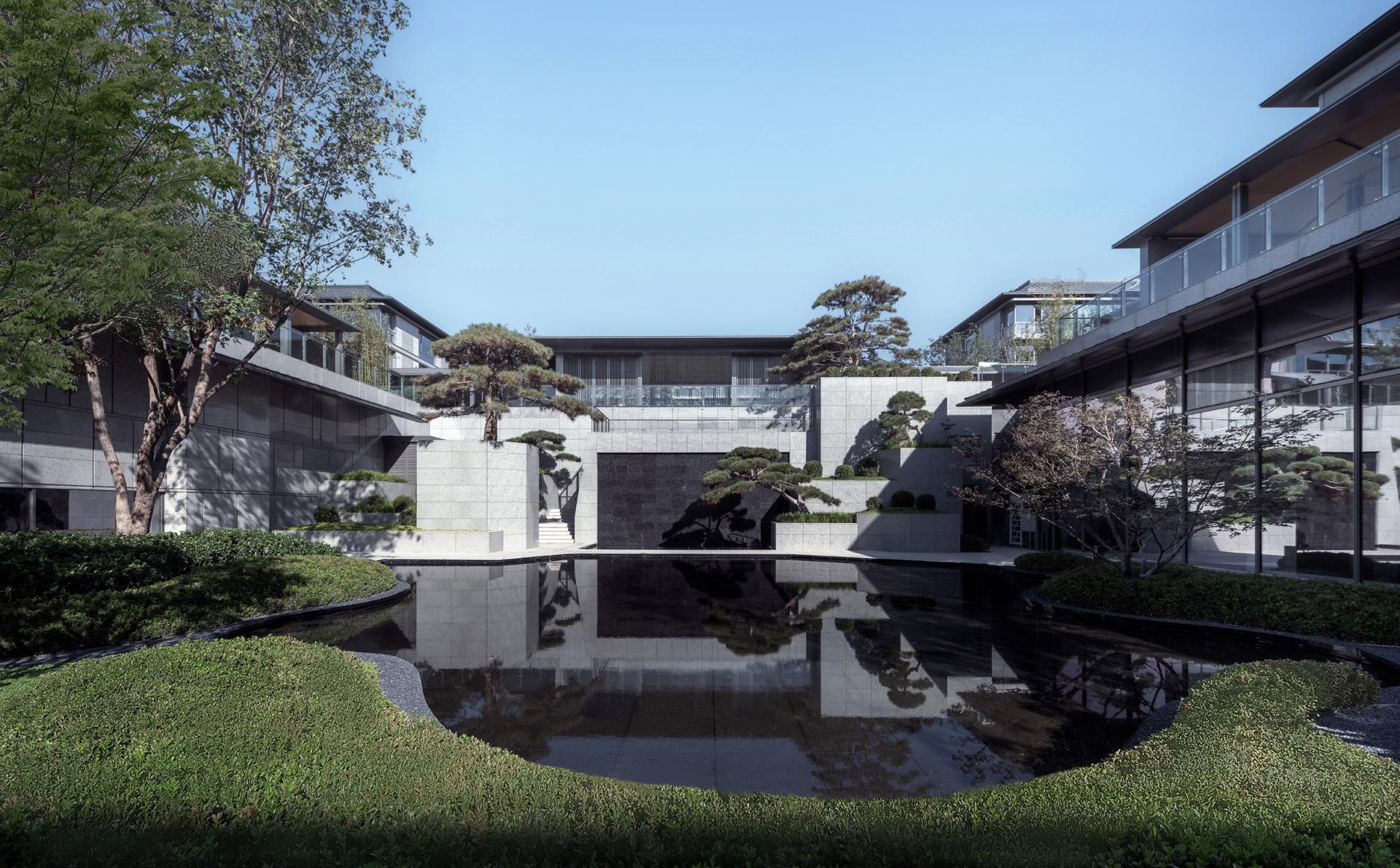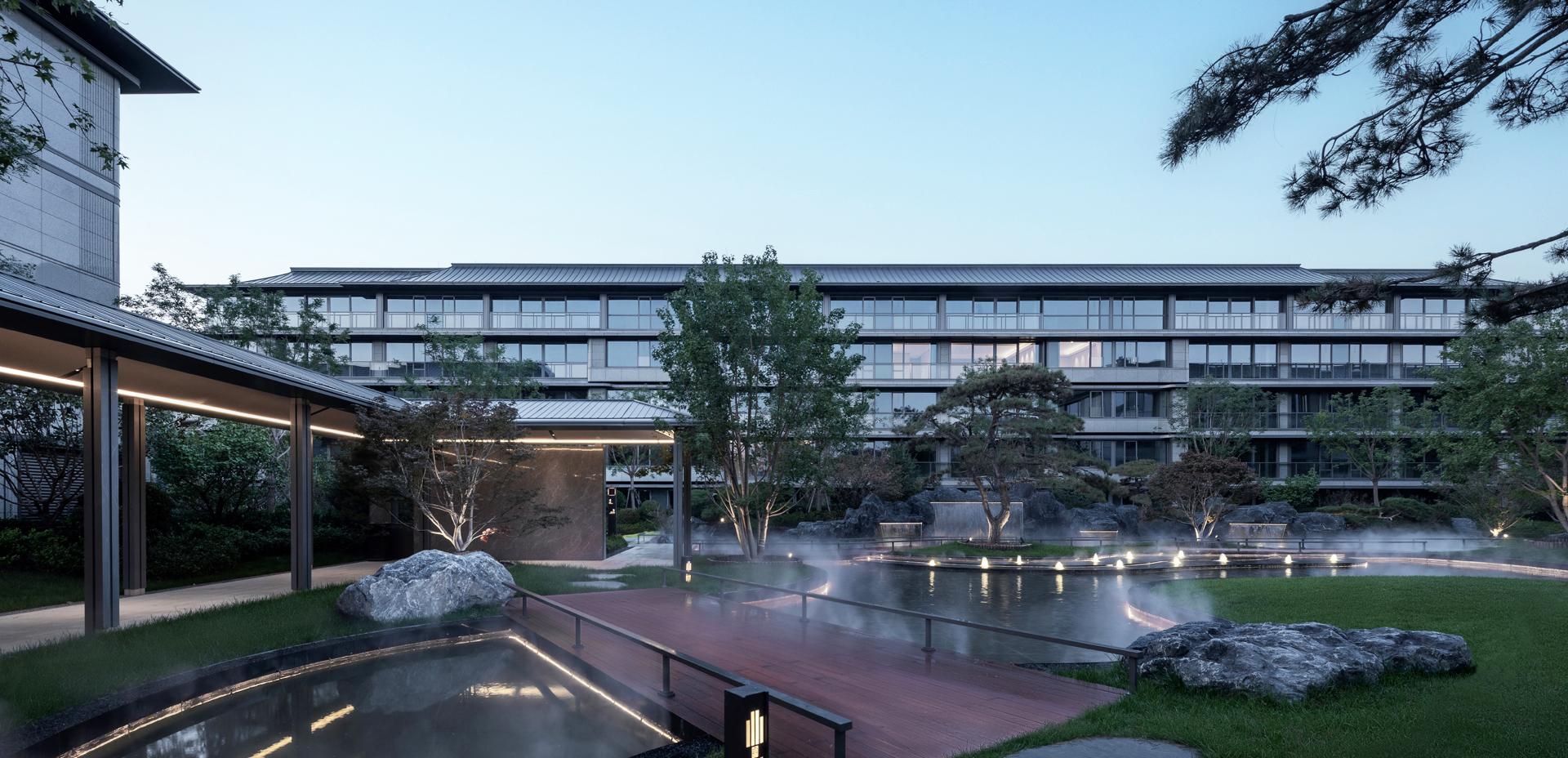 The Old Summer Palace One project sits 800 meters north of Beijing's Yuanmingyuan Park, nestled within the Three Mountains and Five Gardens Greenway and Hadian District’s Zhongguancun, often referred to as China’s Silicon Valley, where culture and technology converge. The original concept behind the design was to create a residence within the mountain gardens, paying homage to Beijing's century-old tradition of mountainous retreats. This reverence for nature was woven into every aspect of the design process, from site selection and modelling to landscaping and construction. After numerous simulations and comparisons, considering factors such as sunlight exposure, unit width, landscape resources, and land value, the plan opted to enclose the area with slab buildings along the north and south sides. This arrangement emphasizes a north-south axis, originating from the southern entrance. The central garden axis, stretching 170 meters long and comprising three courtyard sections, expands the central garden, creating a serene atmosphere. By differentiating the main axis facing south and the secondary axis facing north, the buildings seamlessly blend into the garden environment. Inspired by ancient Chinese architectural wisdom found in texts like "Yingzao Fashi," the facade design meticulously refines traditional roof techniques. At the same time, modern materials such as stone and glass are used to craft an elegant and transparent architectural volume, delicately poised as if floating above the forest canopy.