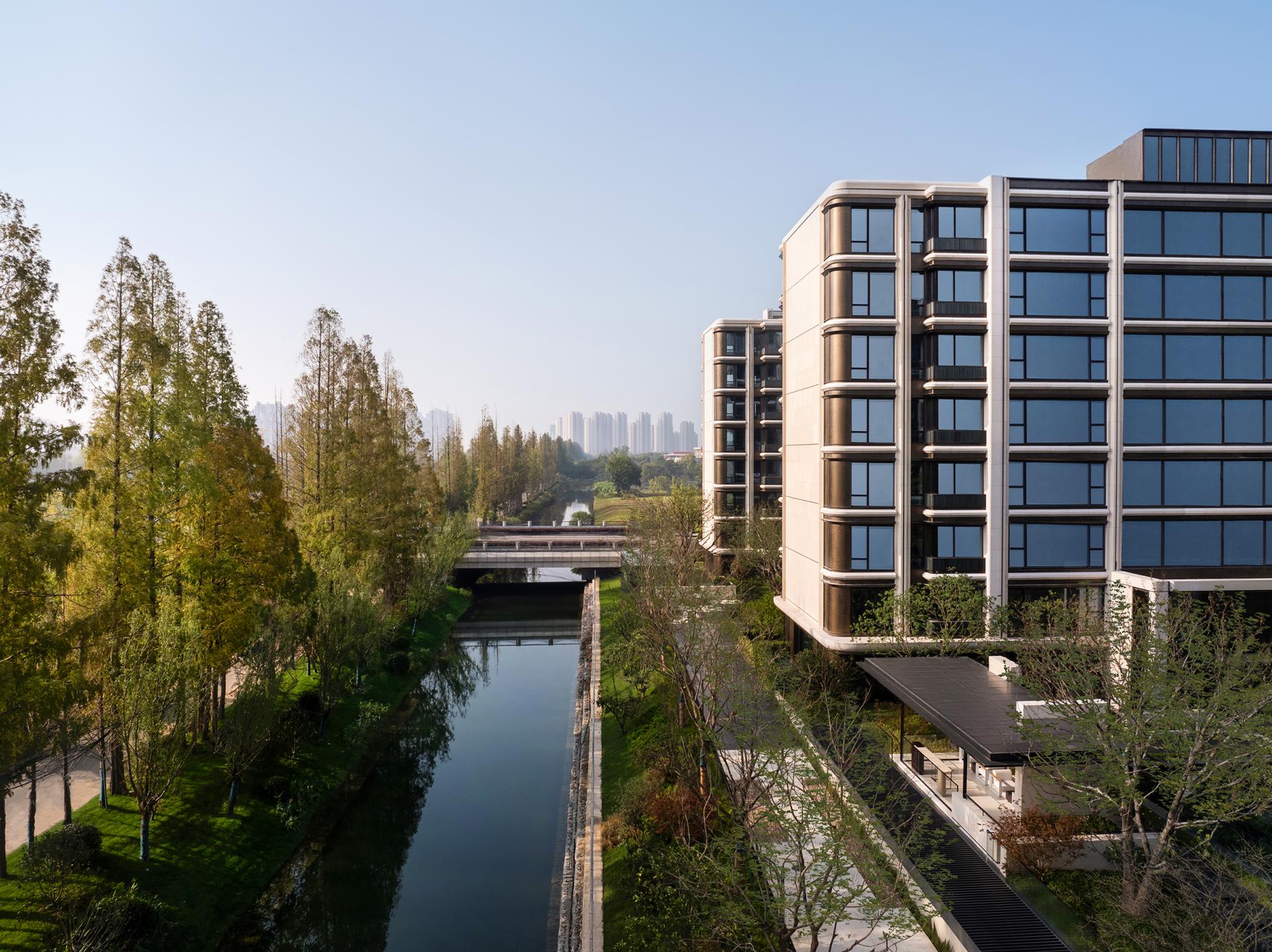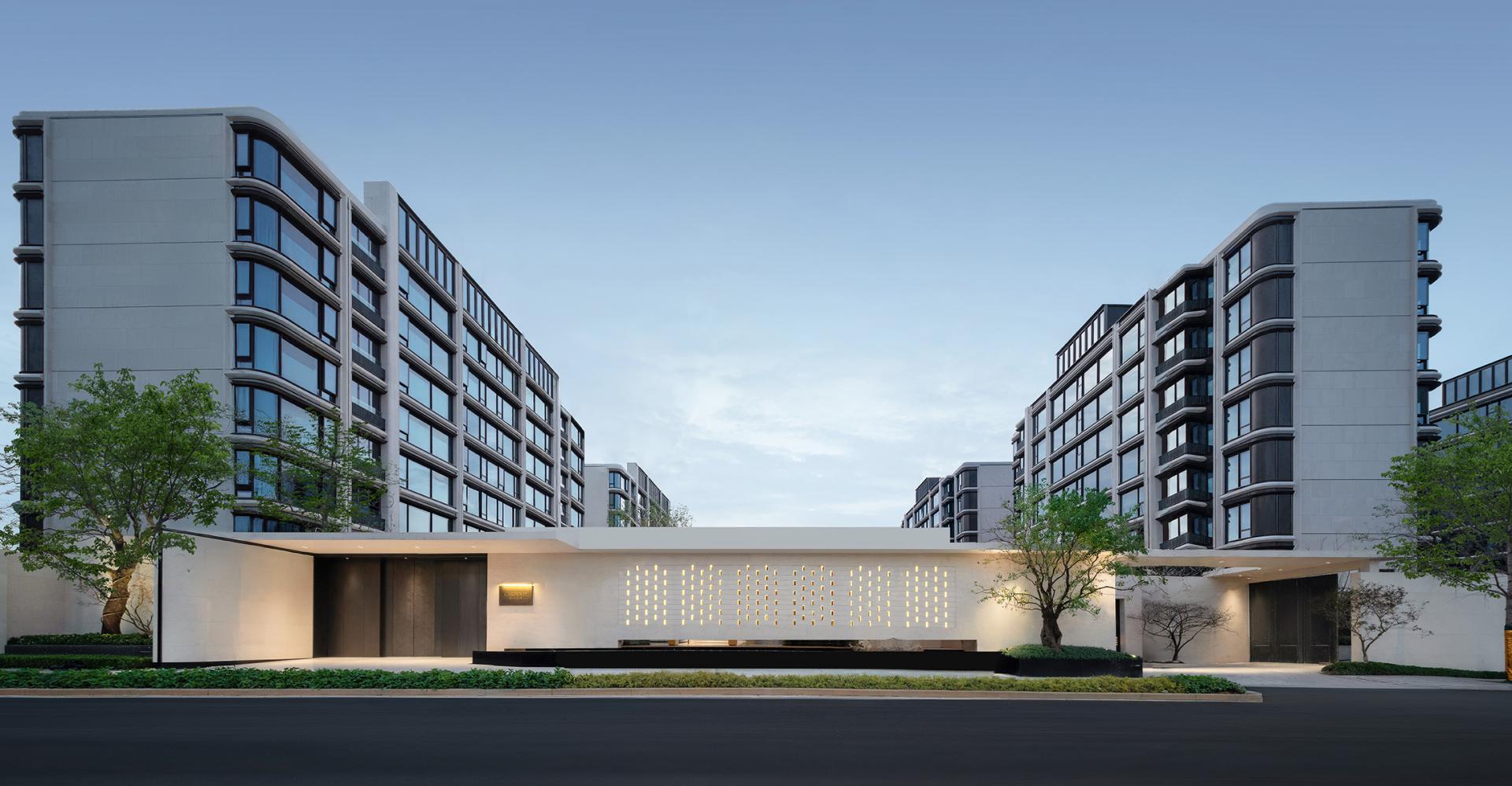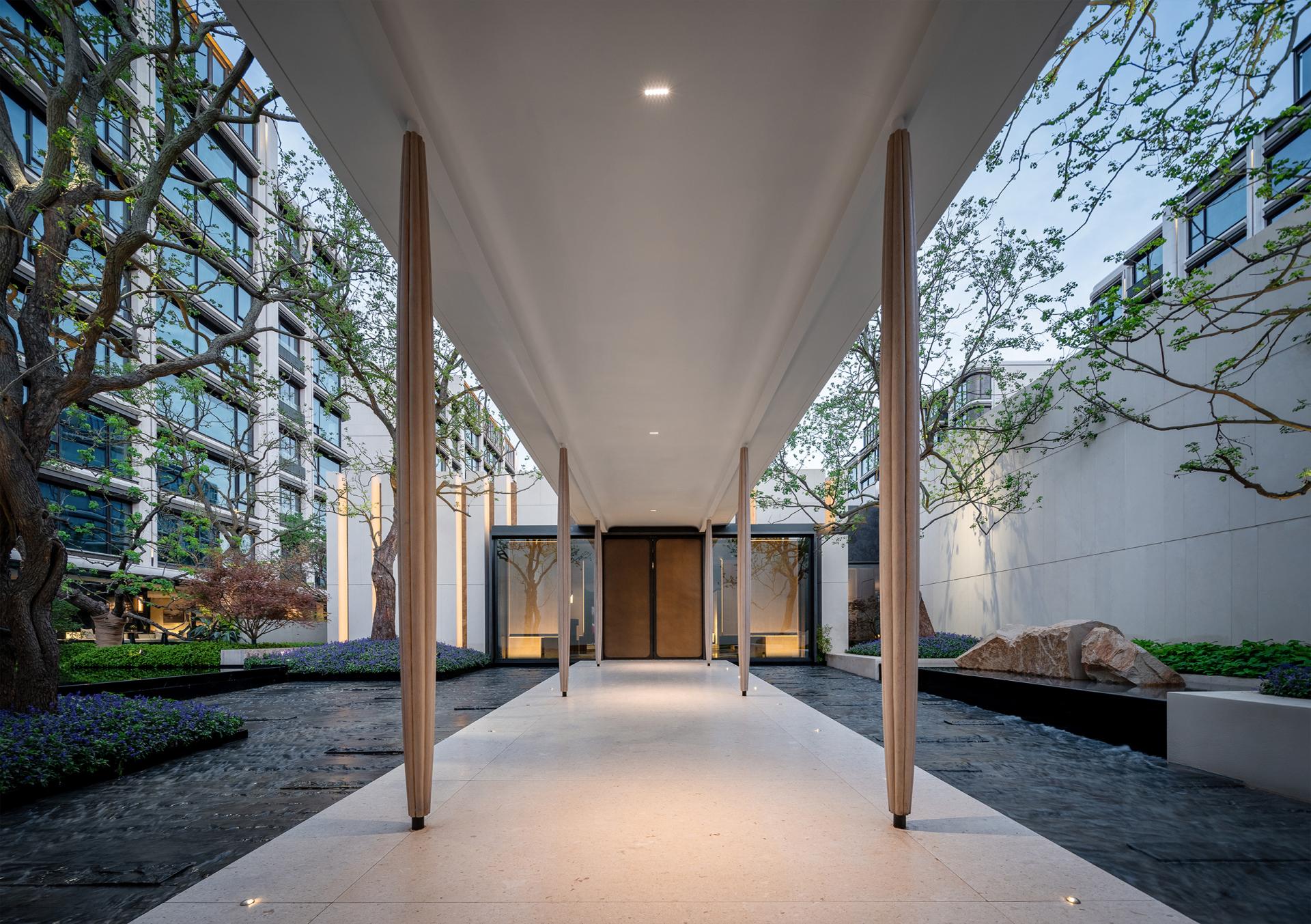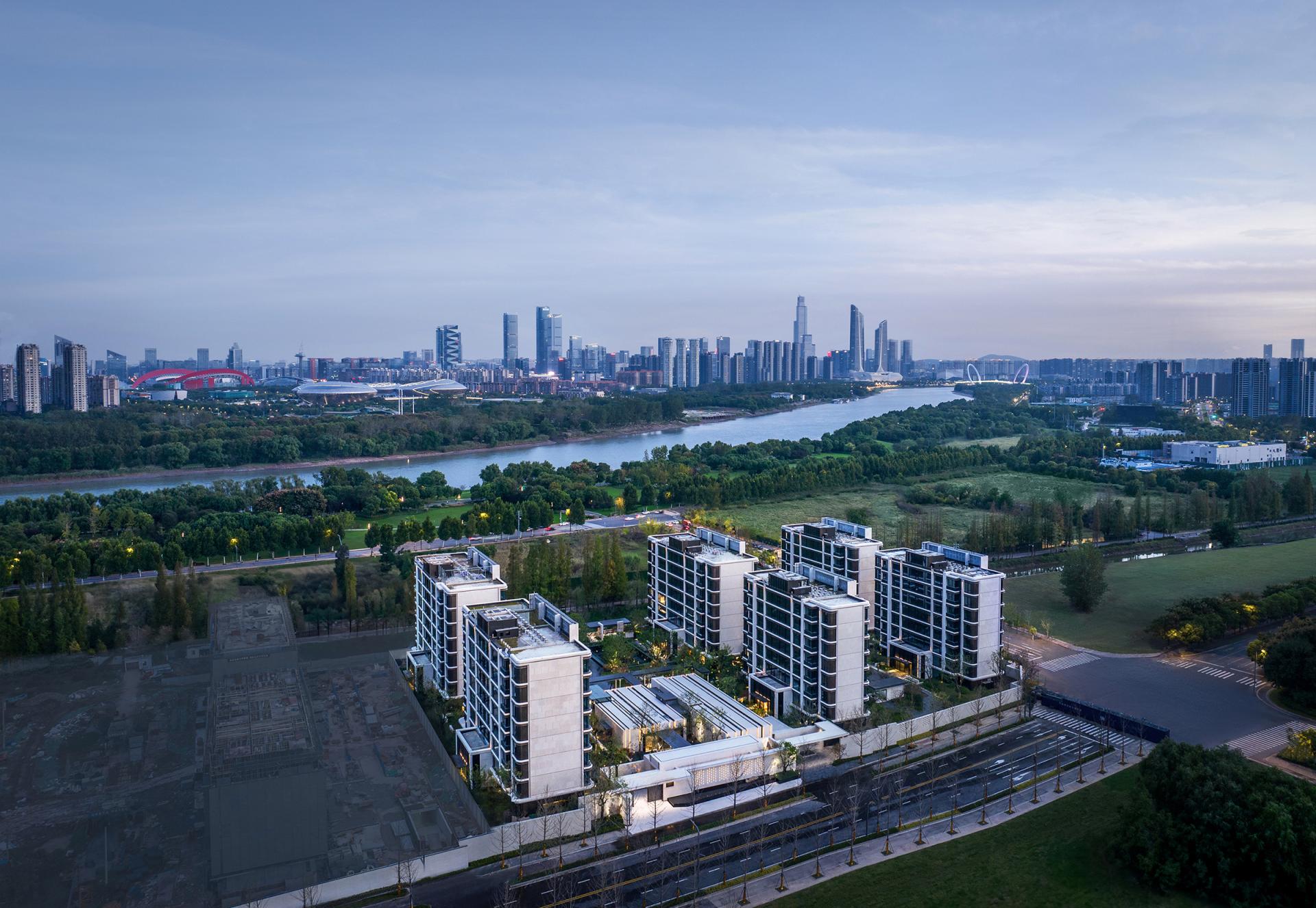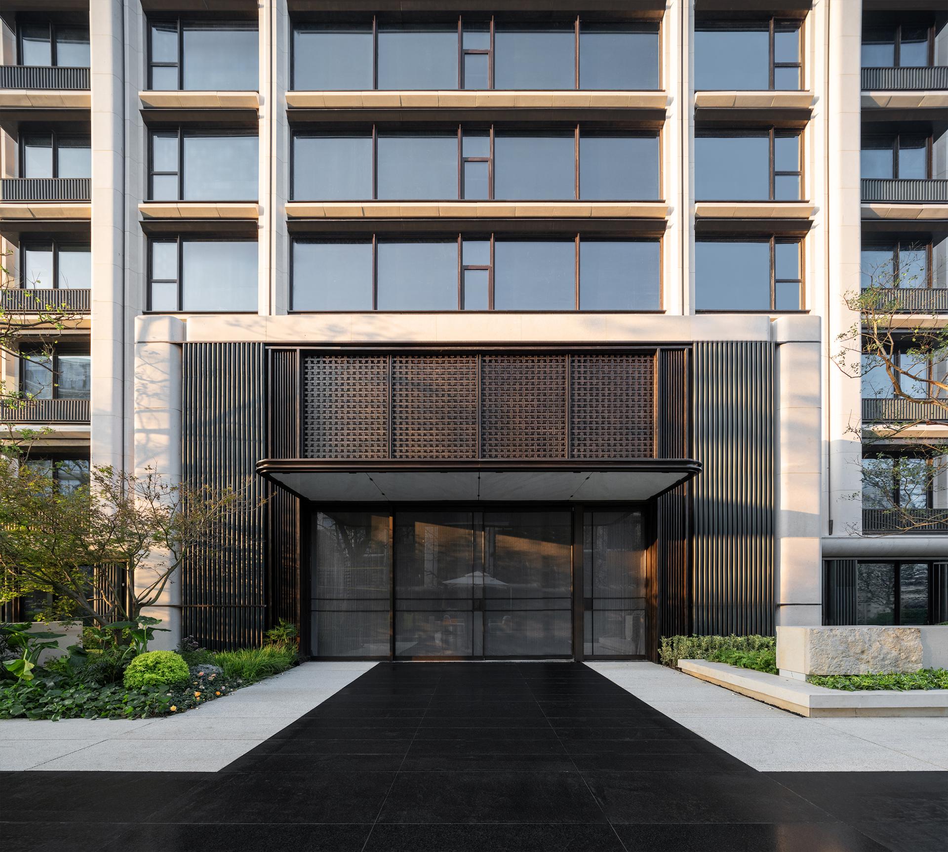 Nanjing, an ancient capital of six dynasties and a cradle of Chinese civilization, is a cultural city where history and modernity coexist. The cityscape reflects a harmonious blend of ancient and modern elements, East and West, and northern and southern styles. This project is located in the Jiangxinzhou area, surrounded by waterways on the north and east sides. A 200-meter walk eastward leads to Riverside Park, offering a prime scenic location. The project focuses on creating an exceptional internal and external environment, exquisitely customized residential units, a luxurious hotel-style service system, and high-quality architectural presentations, fostering a poetic and serene island living community. The homecoming system of the community begins at the main entrance, unfolding in a layered and progressive manner through the principles of "introduction, development, transition, and conclusion." At the central courtyard of the community lobby, it spreads out like a scroll, offering a sense of openness and expansiveness. The towering metasequoia forest along the eastern water system serves as a backdrop, employing modern techniques to create an Eastern garden-style path that is livable, walkable, and scenic. Public service spaces are organized within the elevated level of the main courtyard, enclosing the central courtyard's landscape. Surrounding the central water courtyard are scenic pavilions, tea houses, and bars, reminiscent of traditional garden structures like pavilions, terraces, towers, and verandas. The boundaries between indoor and outdoor spaces are blurred, with each permeating and depending on the other. The physical boundaries between architecture, people, water, and trees are also dissolved, with each becoming a part of the landscape. Everywhere one looks, there is a scene, giving this small community a grand and impressive spirit.In terms of architectural facade design, the buildings feature robust vertical stone columns combined with refined decorative columns, creating a beautifully proportioned framework. To embody the relaxed ambiance of waterfront living, curvilinear elements are extensively employed in the details, making the architecture more approachable and gentle. The materials include Portuguese beige stone paired with bronze-textured irregular metal accents, with curved stone columns at the corners crafted from single blocks of stone to enhance the sophisticated and modern aesthetic.