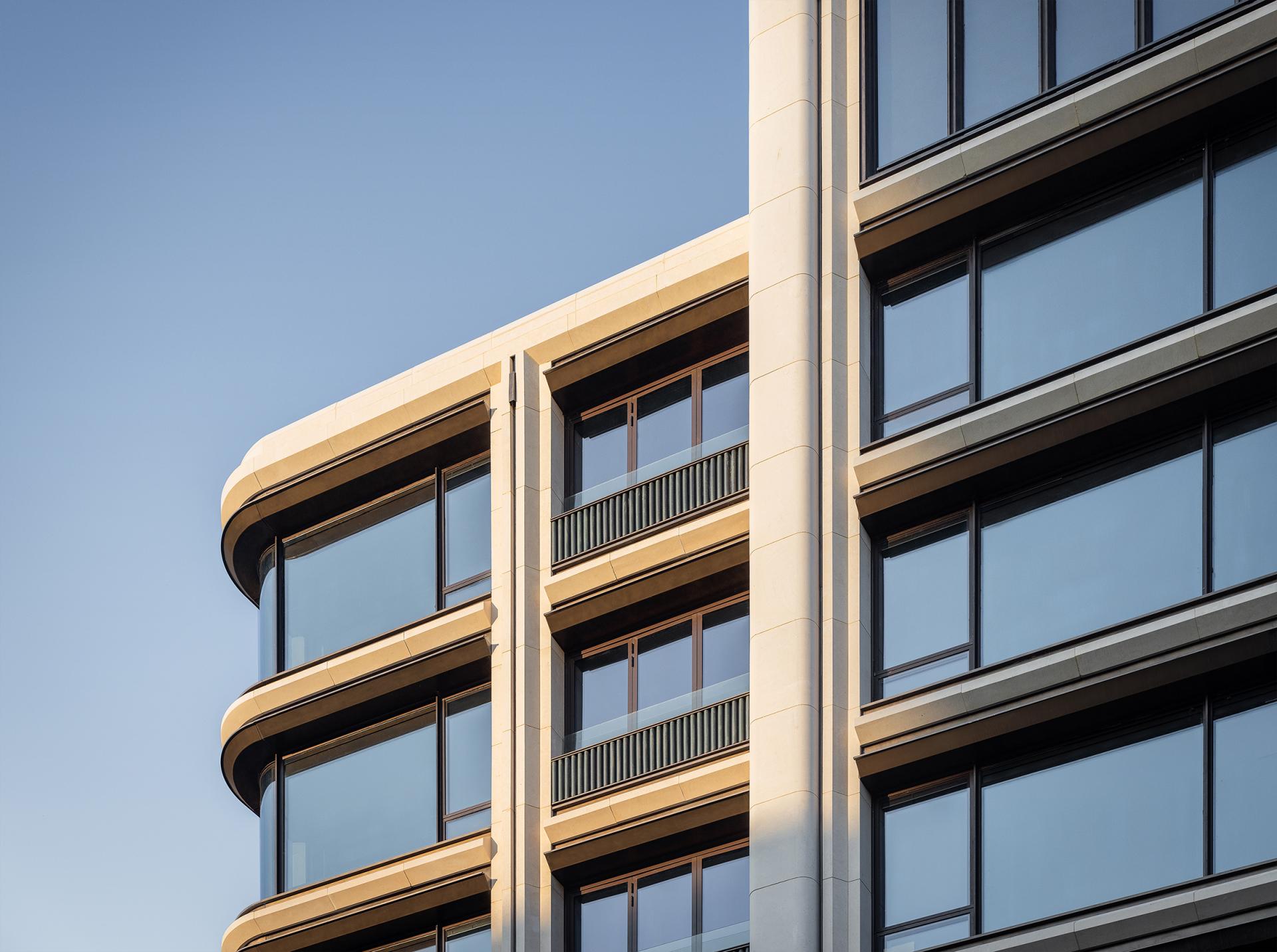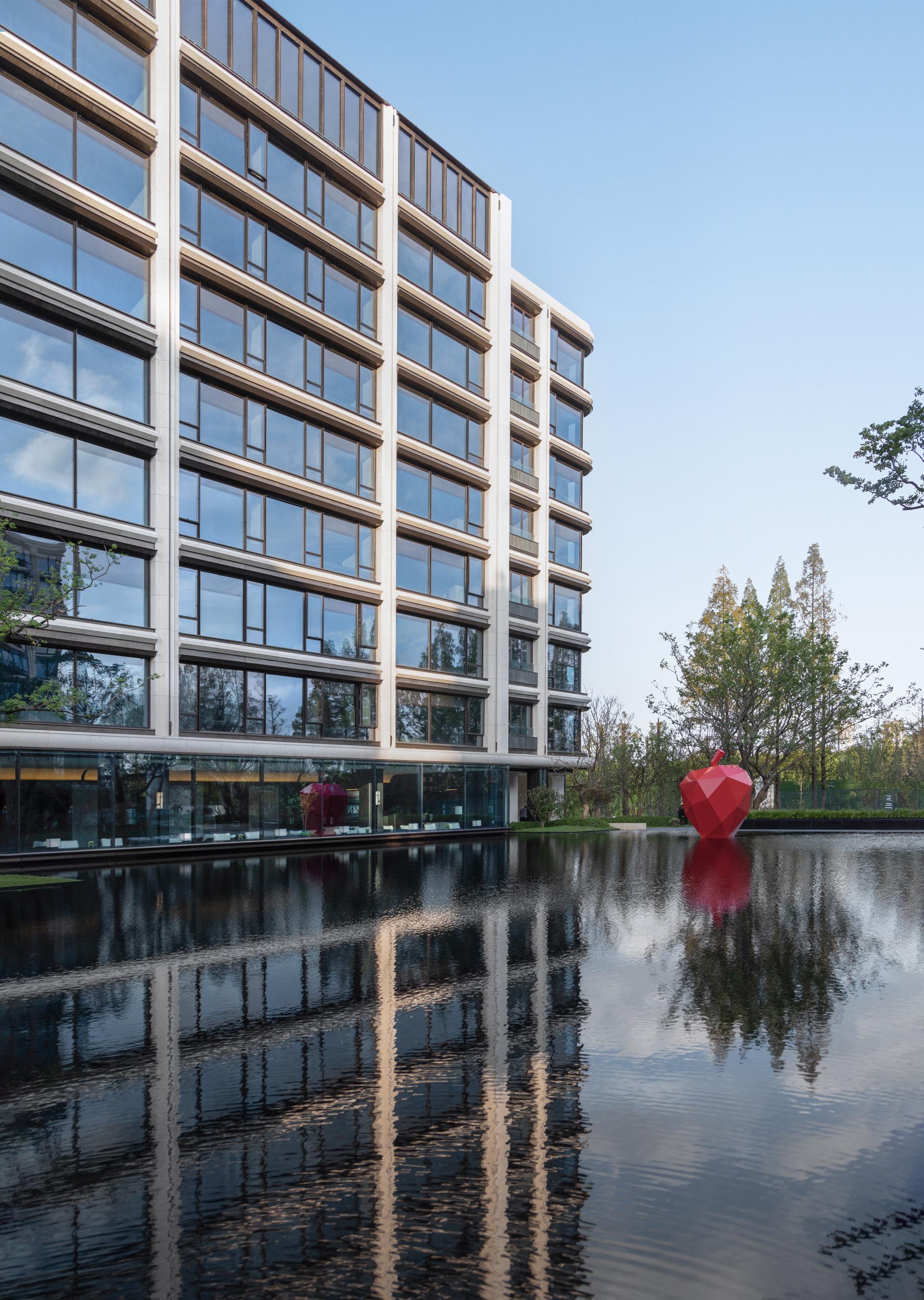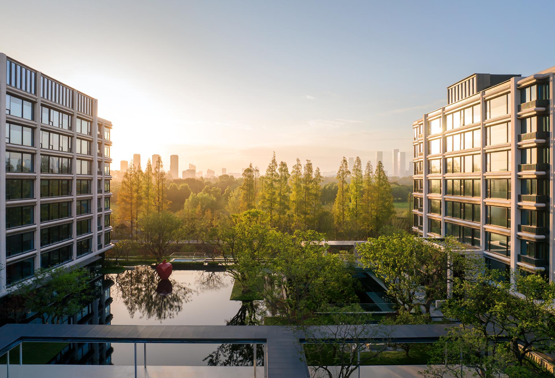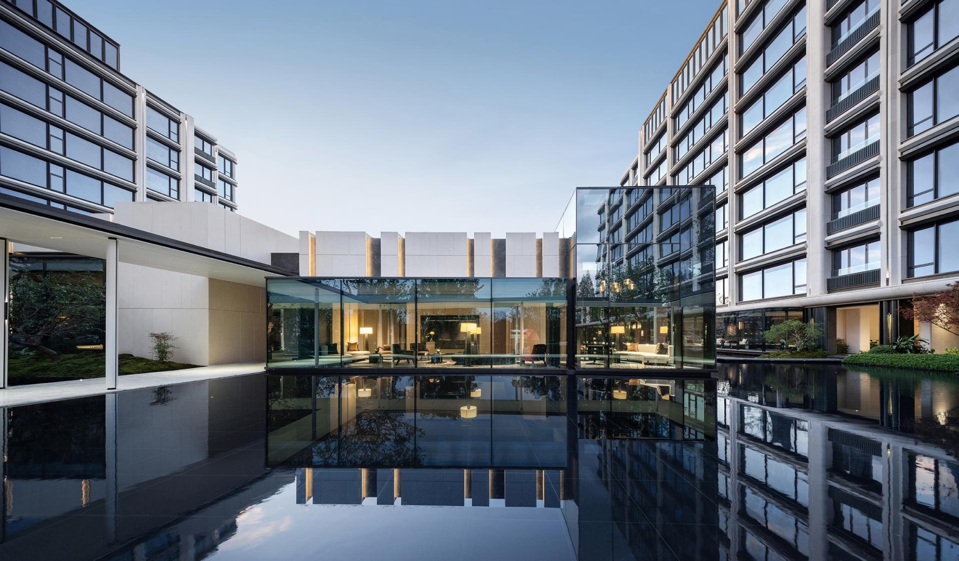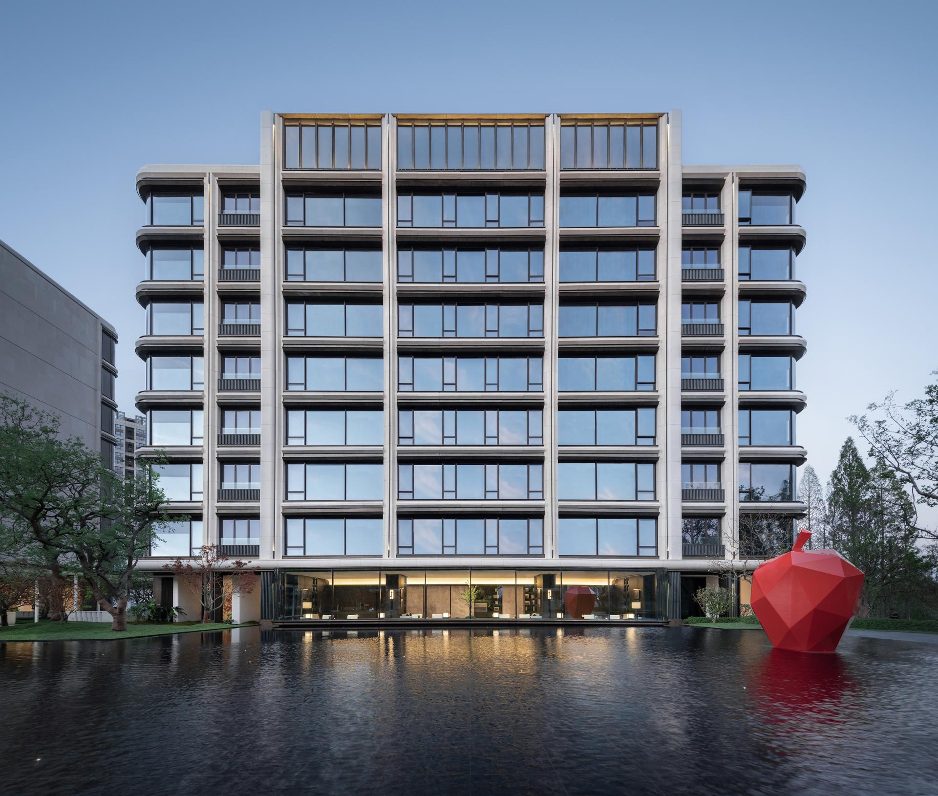 Nanjing, an ancient capital of six dynasties and a cradle of Chinese civilization, is a cultural city where history and modernity coexist. The cityscape reflects a harmonious blend of ancient and modern elements, East and West, and northern and southern styles. This project is located in the Jiangxinzhou area, surrounded by waterways on the north and east sides. A 200-meter walk eastward leads to Riverside Park, offering a prime scenic location. The project focuses on creating an exceptional internal and external environment, exquisitely customized residential units, a luxurious hotel-style service system, and high-quality architectural presentations, fostering a poetic and serene island living community. The homecoming system of the community begins at the main entrance, unfolding in a layered and progressive manner through the principles of "introduction, development, transition, and conclusion." At the central courtyard of the community lobby, it spreads out like a scroll, offering a sense of openness and expansiveness. The towering metasequoia forest along the eastern water system serves as a backdrop, employing modern techniques to create an Eastern garden-style path that is livable, walkable, and scenic. Public service spaces are organized within the elevated level of the main courtyard, enclosing the central courtyard's landscape. Surrounding the central water courtyard are scenic pavilions, tea houses, and bars, reminiscent of traditional garden structures like pavilions, terraces, towers, and verandas. The boundaries between indoor and outdoor spaces are blurred, with each permeating and depending on the other. The physical boundaries between architecture, people, water, and trees are also dissolved, with each becoming a part of the landscape. Everywhere one looks, there is a scene, giving this small community a grand and impressive spirit.In terms of architectural facade design, the buildings feature robust vertical stone columns combined with refined decorative columns, creating a beautifully proportioned framework. To embody the relaxed ambiance of waterfront living, curvilinear elements are extensively employed in the details, making the architecture more approachable and gentle. The materials include Portuguese beige stone paired with bronze-textured irregular metal accents, with curved stone columns at the corners crafted from single blocks of stone to enhance the sophisticated and modern aesthetic.