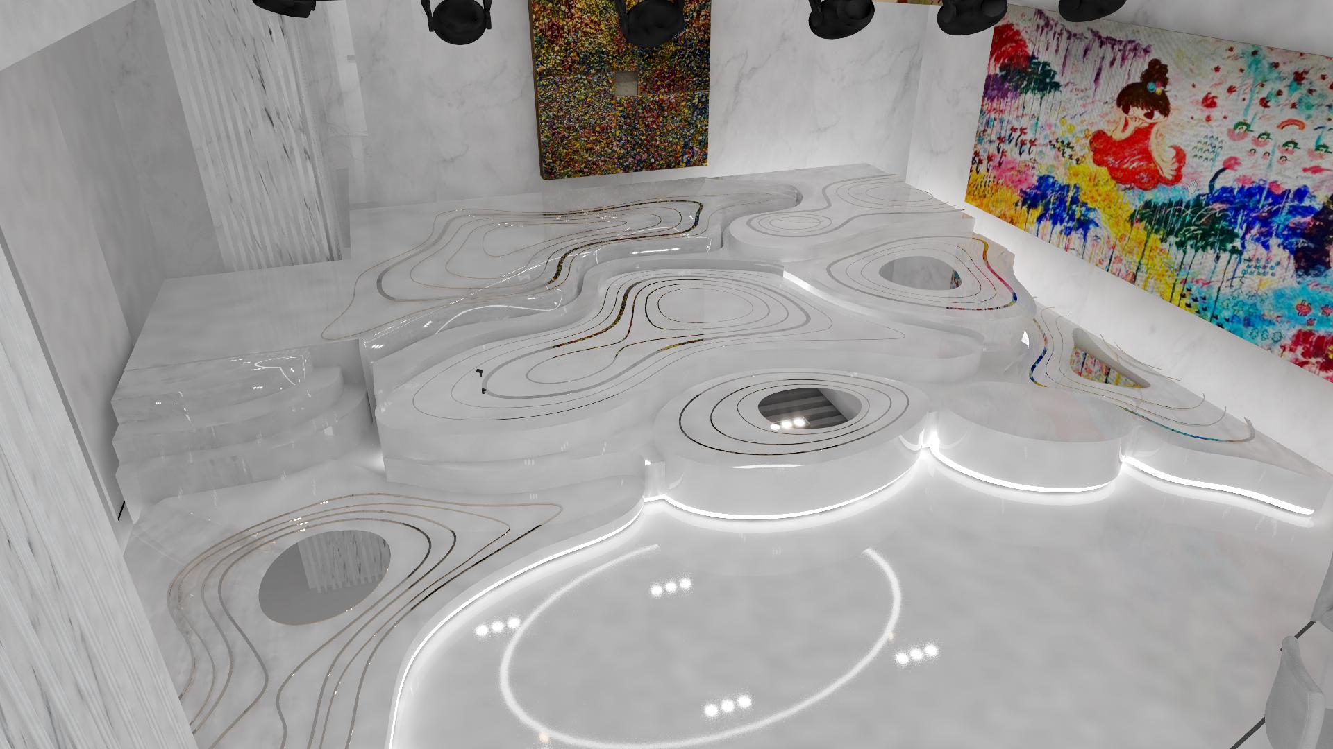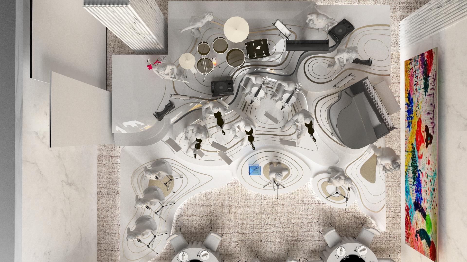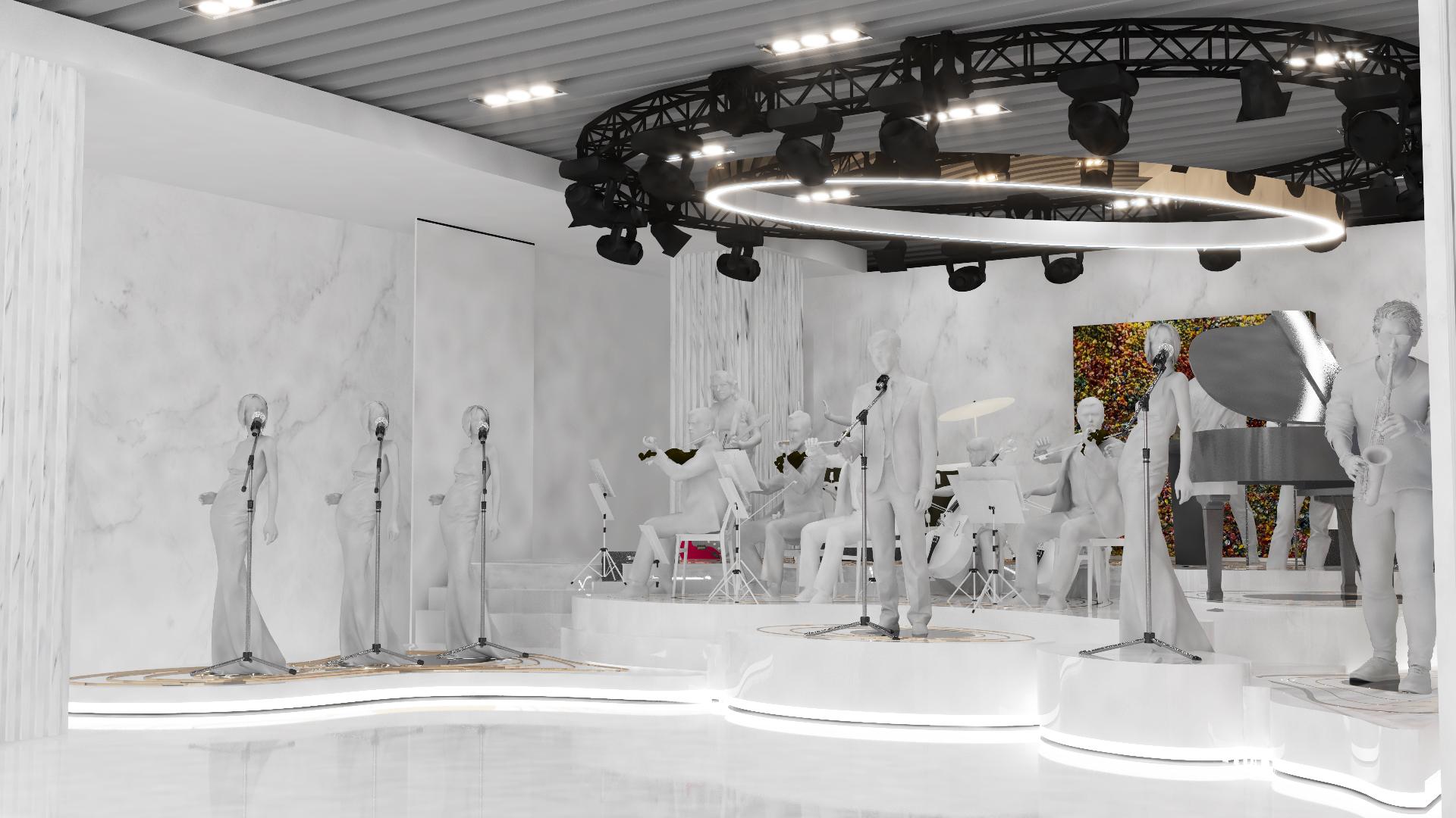 This design utilizes the commonality between sound waves and terrain as its visual core to incorporate music, symbolizing the interactive resonance between sound waves and terrain. The stage is constructed on the basis of contour lines, creating multiple layered planes that stack each instrument within the composition. The fusion and intertwining of each instrument form beautiful pieces of music. Each layer of the stage corresponds to different pitches or rhythms, creating a visual sound map. When the music plays, the lighting pulses in rhythm with the sound waves along the contour lines, simulating the dynamic ripple effect of sound propagating through space and air. Similar to the form of ecological hills, each layer is highlighted with lighting or silver materials to emphasize its contours, creating a ripple effect of sound.