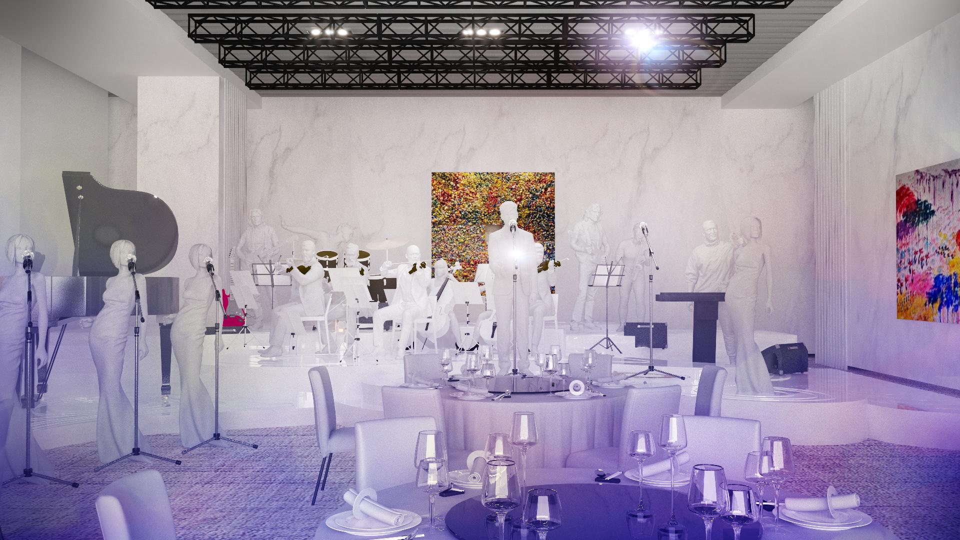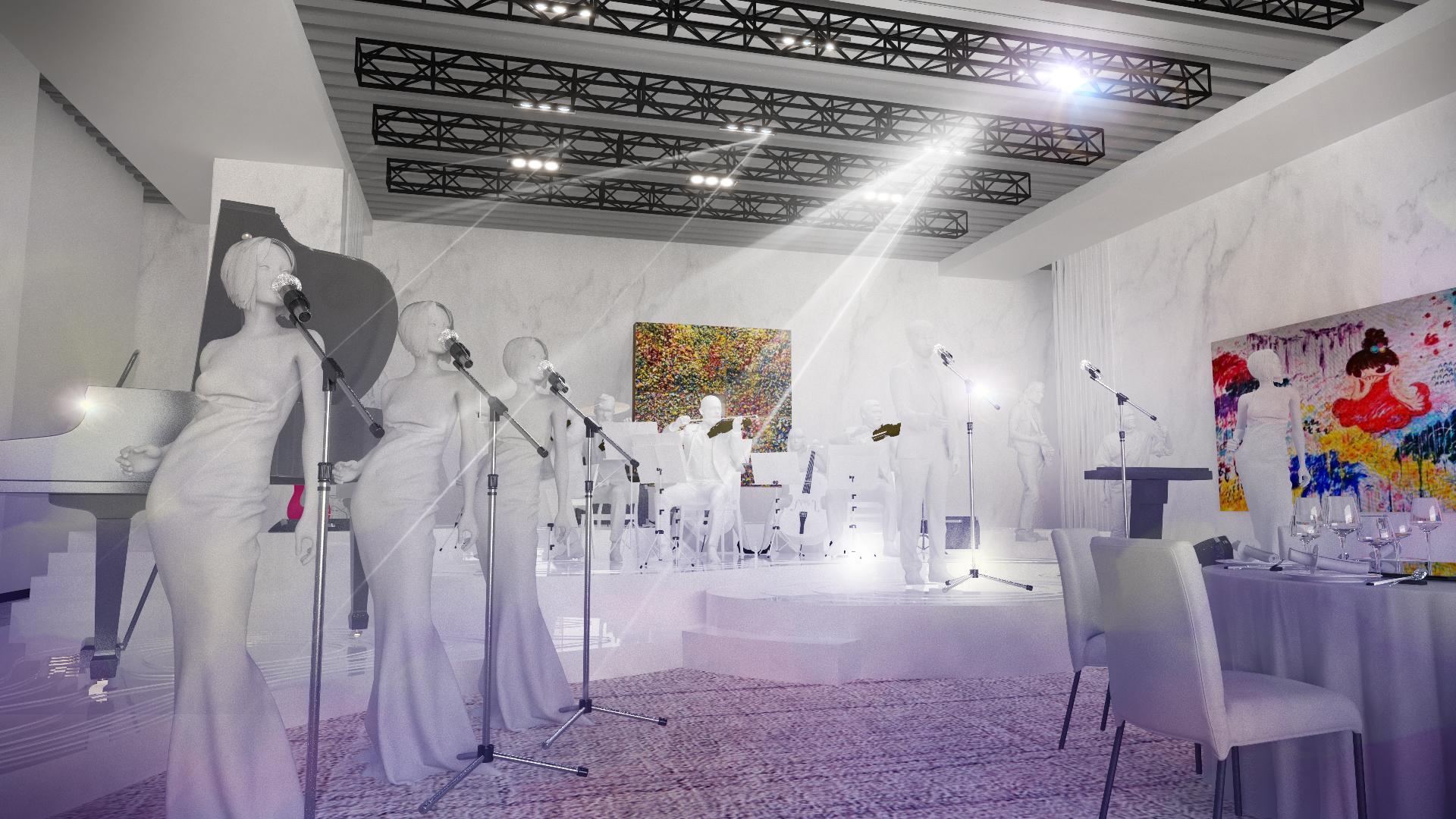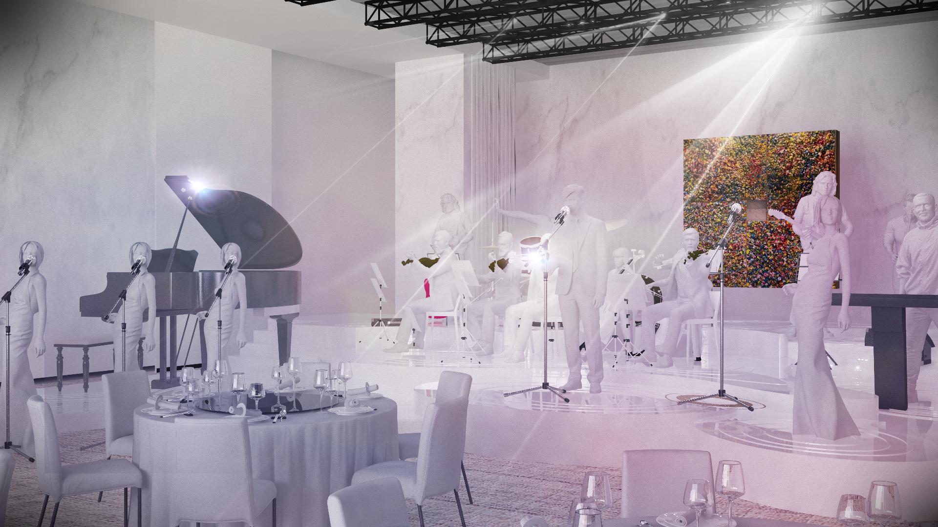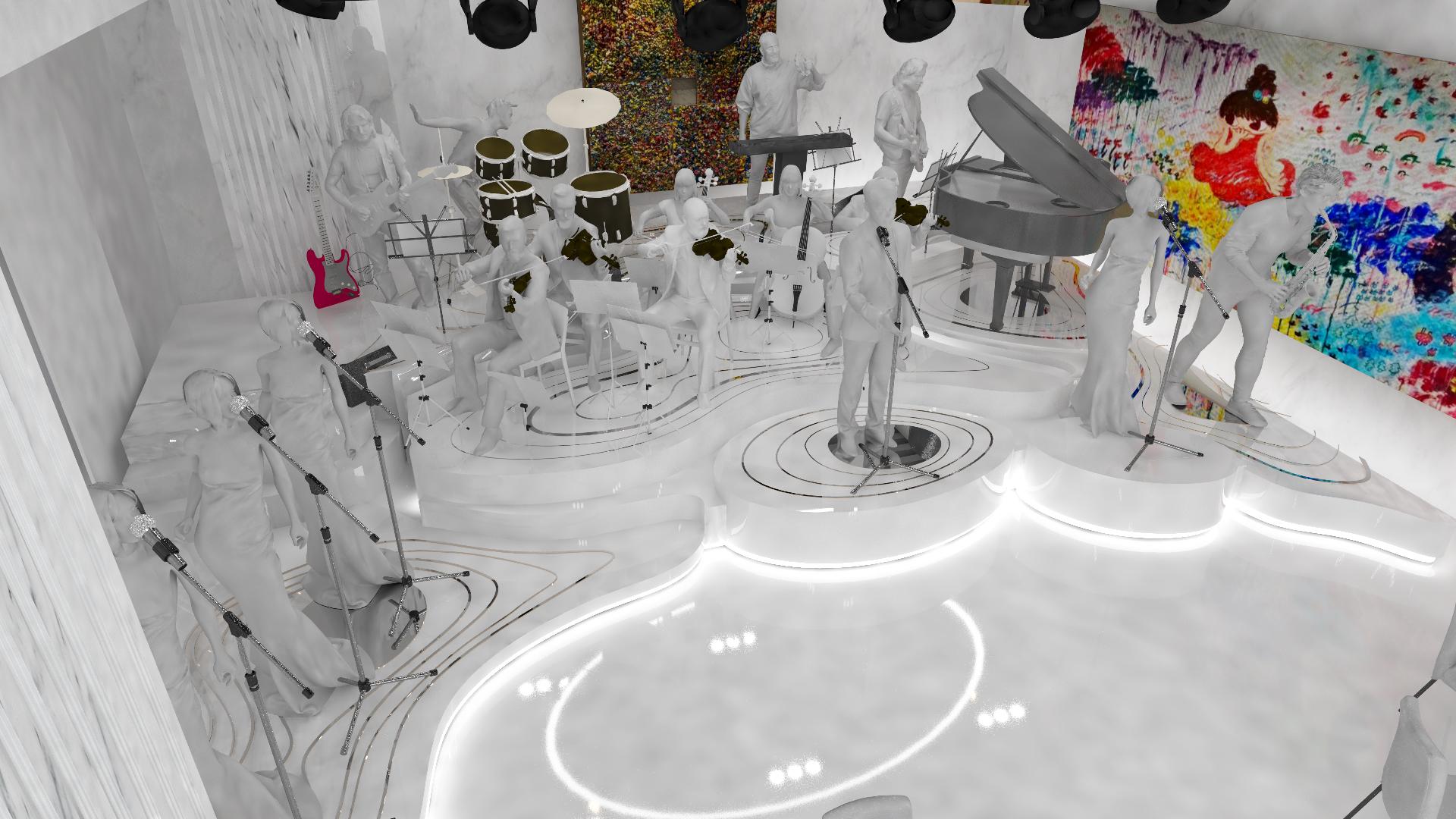 The center of the stage serves as the focal point for music and the core area of the terrain’s sound wave origin, with sound emanating outward toward the surroundings as the performance progresses. This also highlights the relationship of mutual resonance between sound and terrain. The lighting design dynamically captures the rhythm and frequency of the music, transforming the sound's harmonics into light and shadow. The multi-layered stage structure immerses the performers in an environment where sound waves and terrain intertwine, symbolizing the connection between music and nature. The audience finds themselves within the flowing landscape of sound waves, experiencing the power of sound and the enveloping sensation of the terrain.