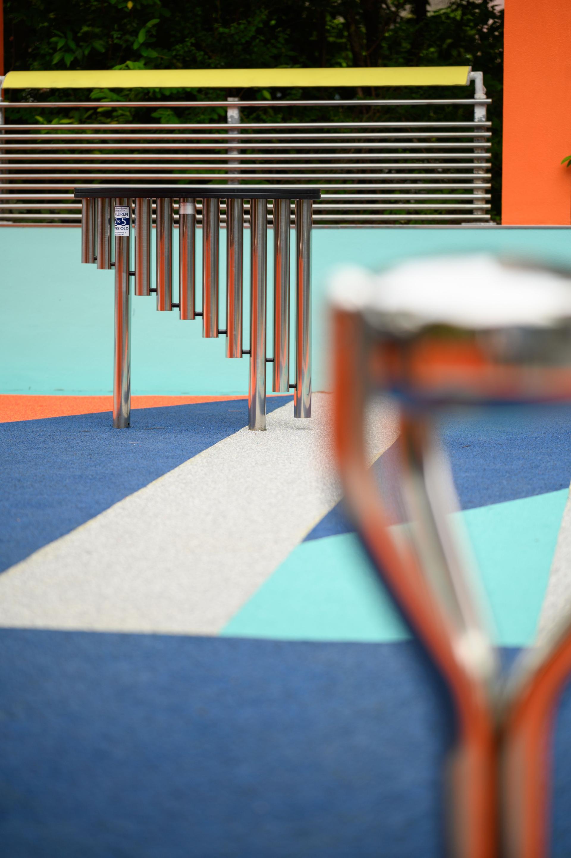 While Geometric Wonderzoo is a public facility to be frequently used by a broad array of users, we aim to enrich the diversity of its facilities. In addition to Giant Elephant Adventure Slide, there are also Turtle Bouncing Valley, a trampoline designed for young children to enhance their motor skills and improve balance, coupled with Bird Net Climbing Zone to help children strengthen their muscles and courage. Crocodile Hopscotch serves children as a social game, which is a classic one good for hand-brain coordination.