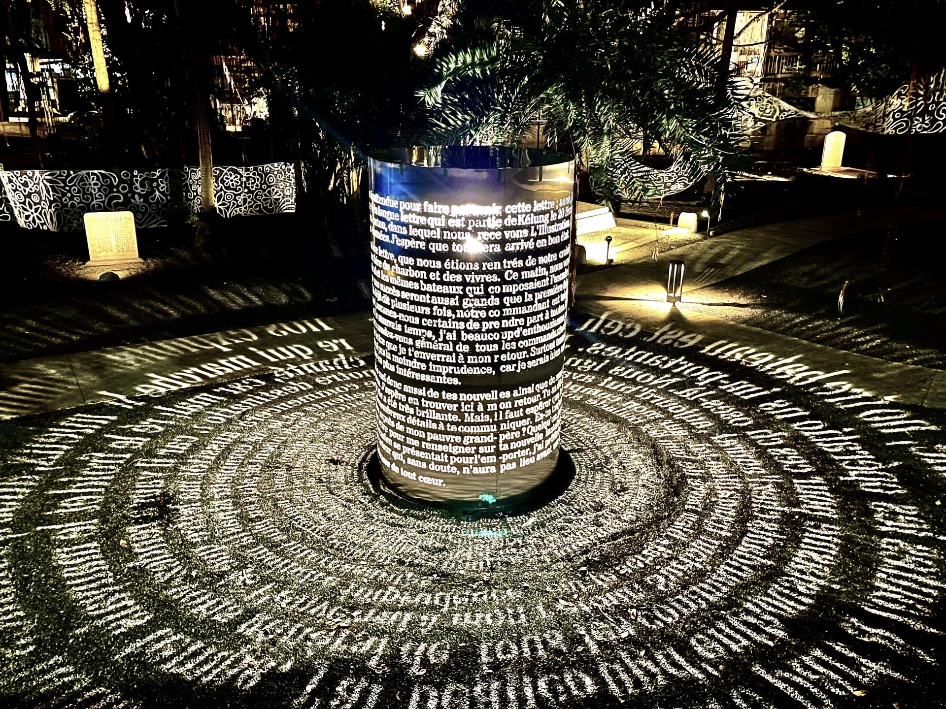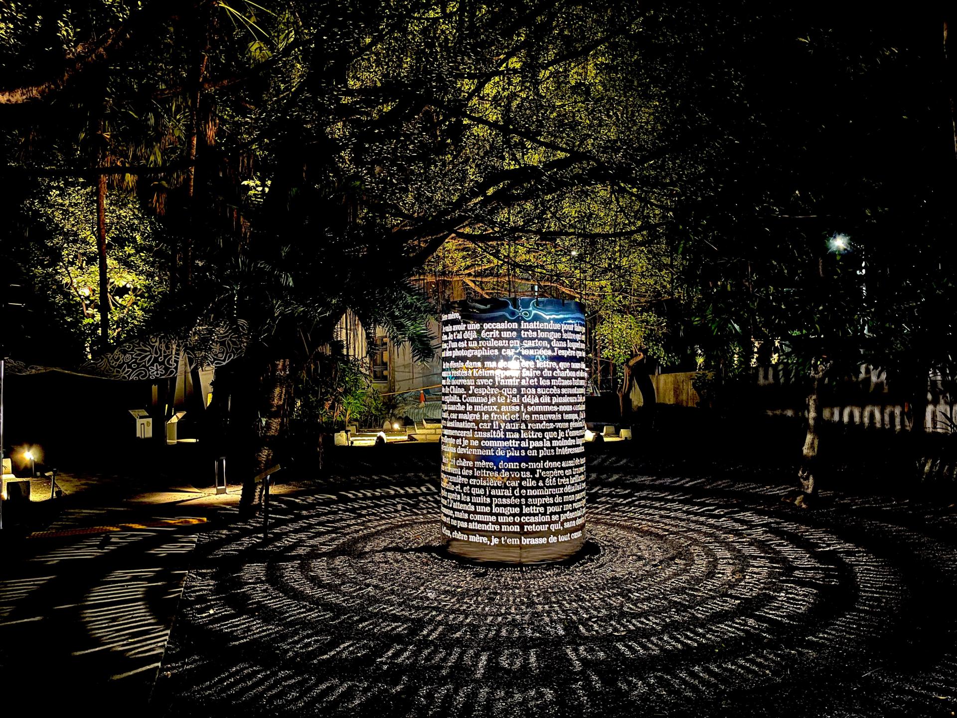 During the Sino-French War, the French came to Keelung from Europe. To the French, this was a very distant country. We found a letter written by a young French soldier named René Coppin to his mother in France. The lights of fishing boats cast words on the land where young soldiers are buried, allowing this work to soothe the souls of young soldiers in the past historical times. It is also a work exhibited in the cemetery area at night.